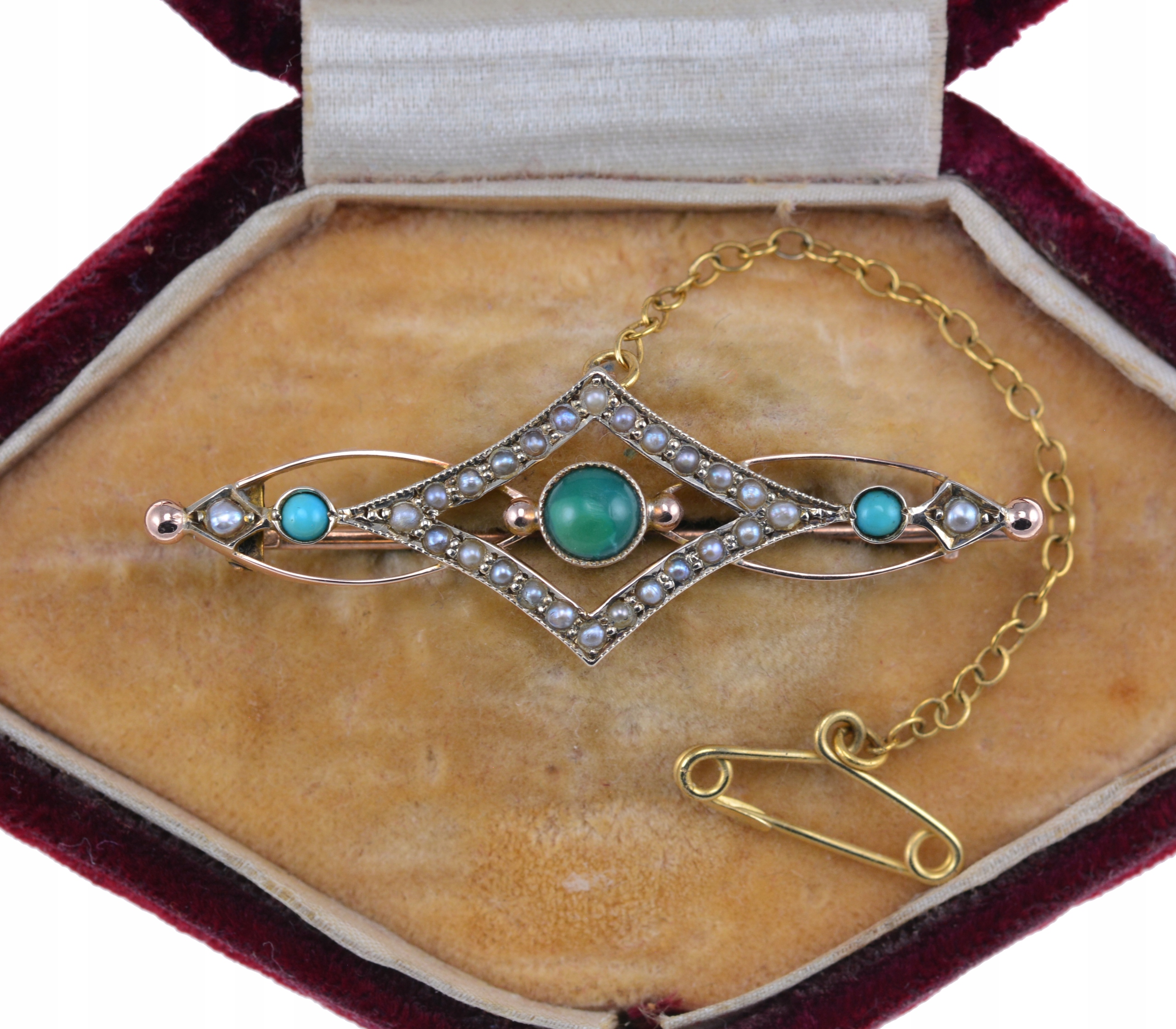 Предмет продажи — старинная английская брошь украшен натуральной бирюзой и речным жемчугом. Брошь была создана в Англии в начале 20 века. Выгравирована дата 04.06.1918. Состояние очень хорошее, оригинальные камни, рабочая застежка.