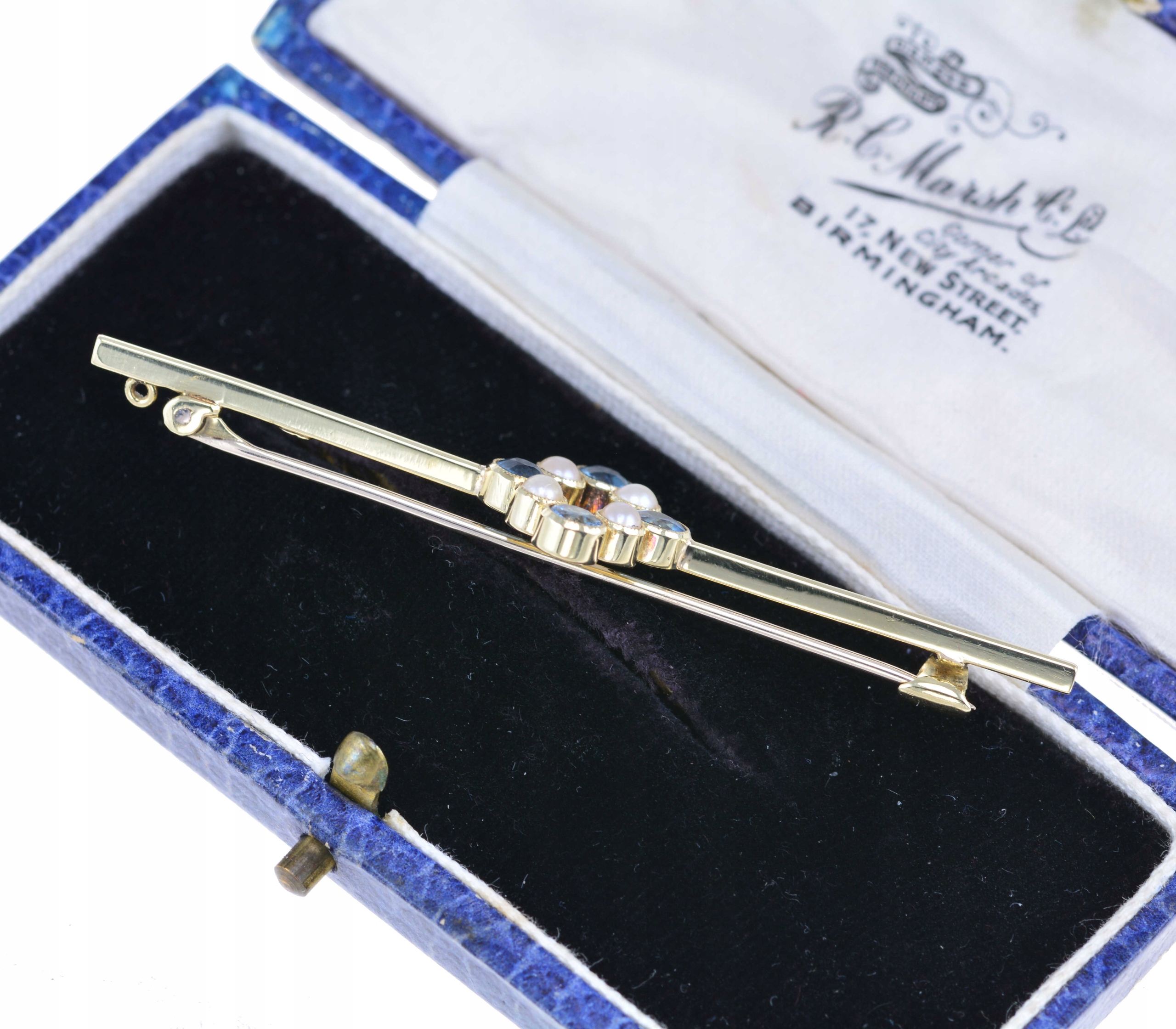 Предмет продажи – старинная английская брошь, украшенная натуральными аквамаринами и жемчугом. Брошь начала 20 века, булавка из золота низшего качества.