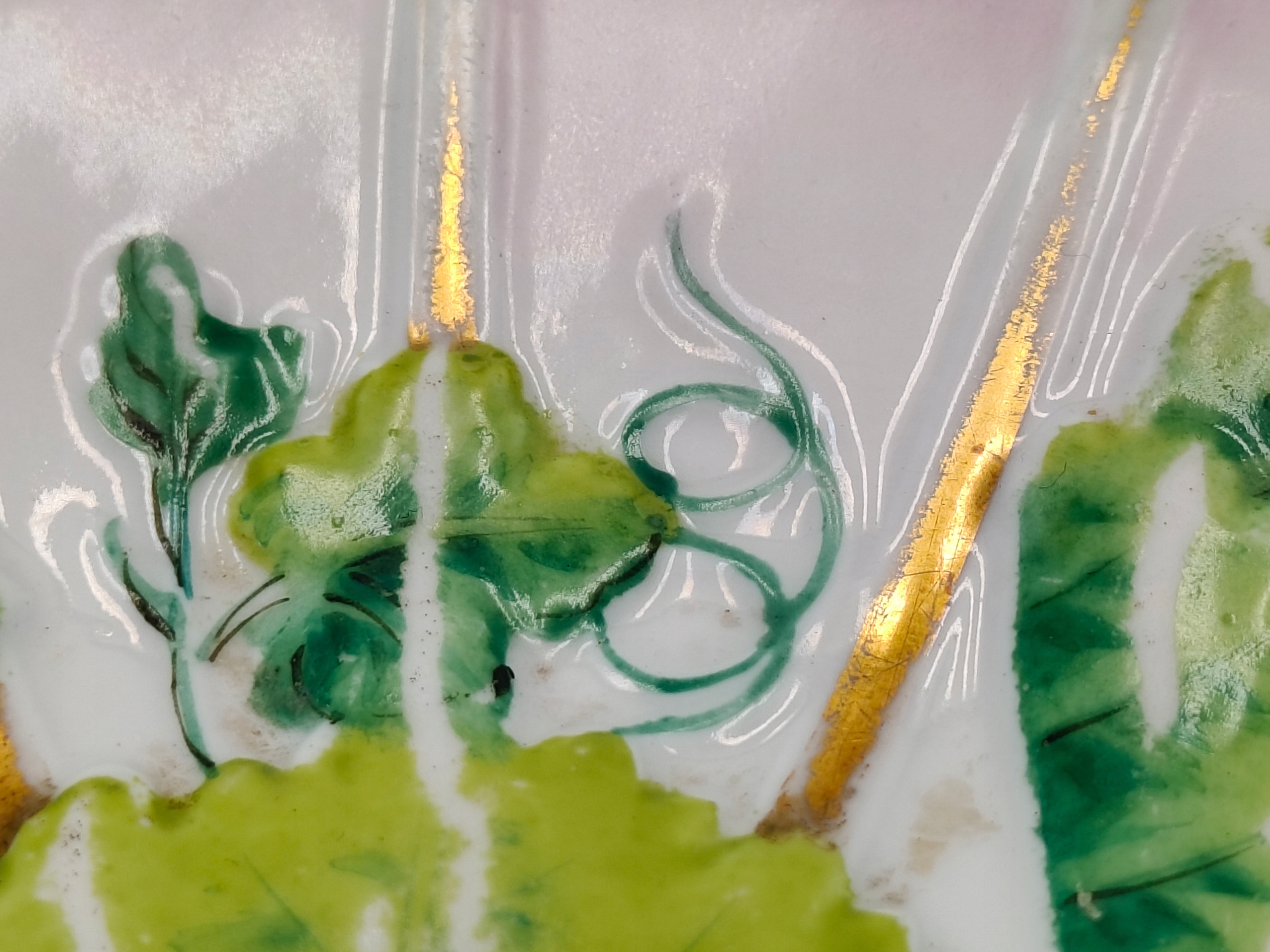 Это уникальный кусок истории, изготовленный из красивого старого фарфора, украшенный розовой живописью с виноградным мотивом. Его уникальное очарование подчеркивается многочисленными ссадинами картин, которые придают ему характер и подлинность.