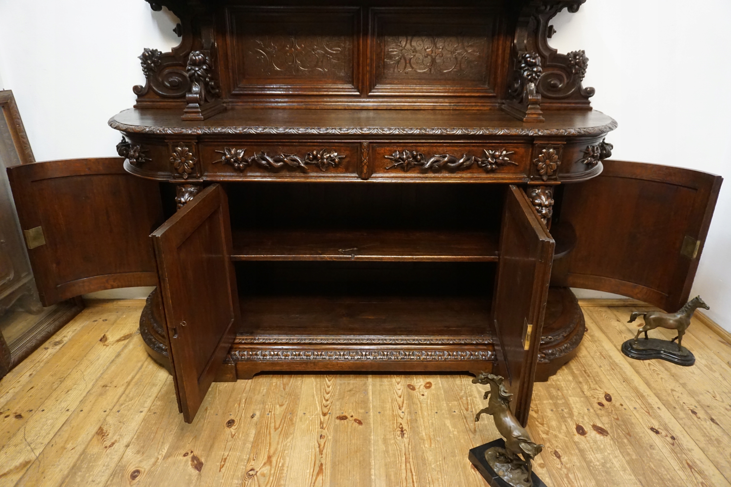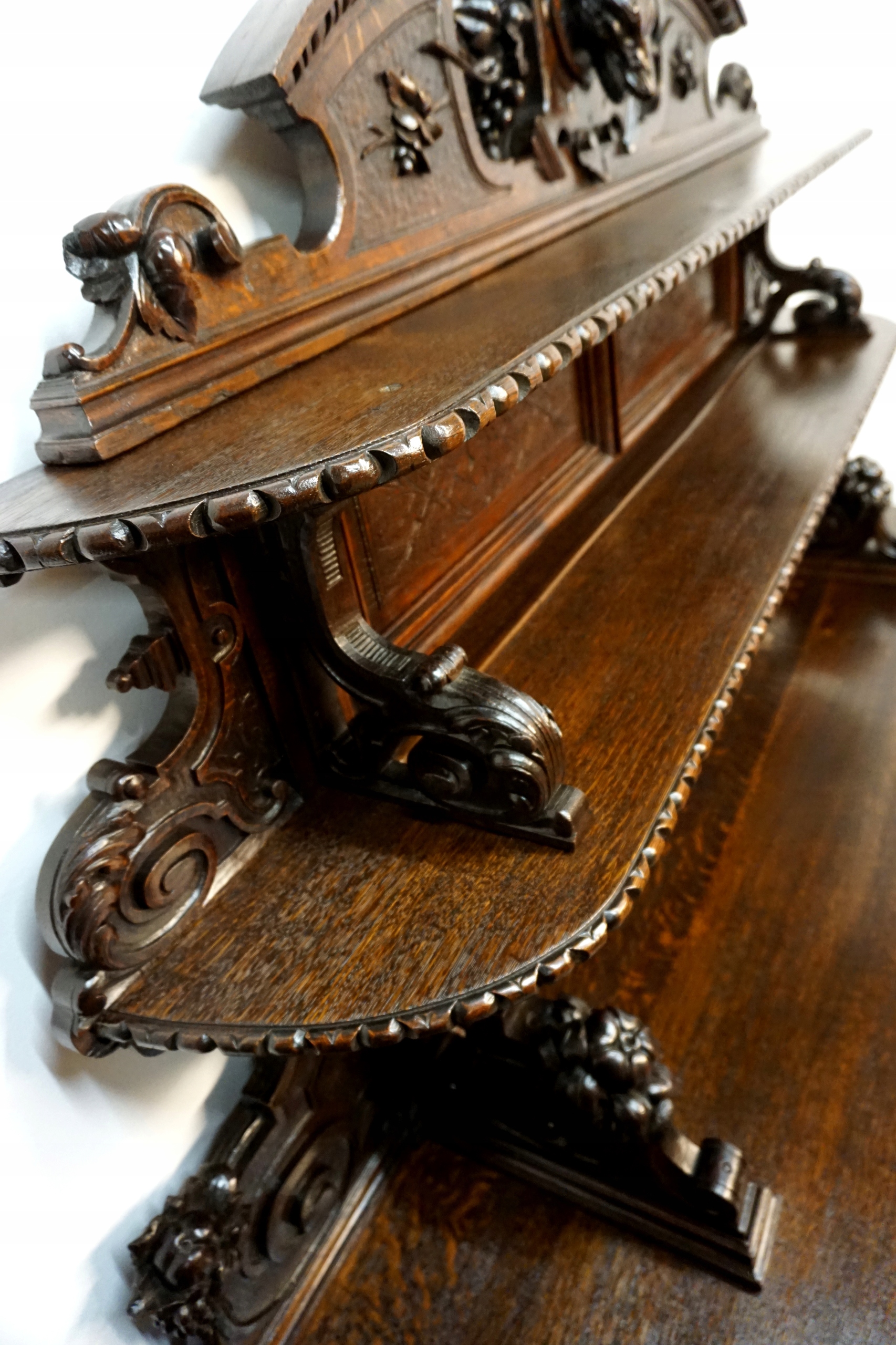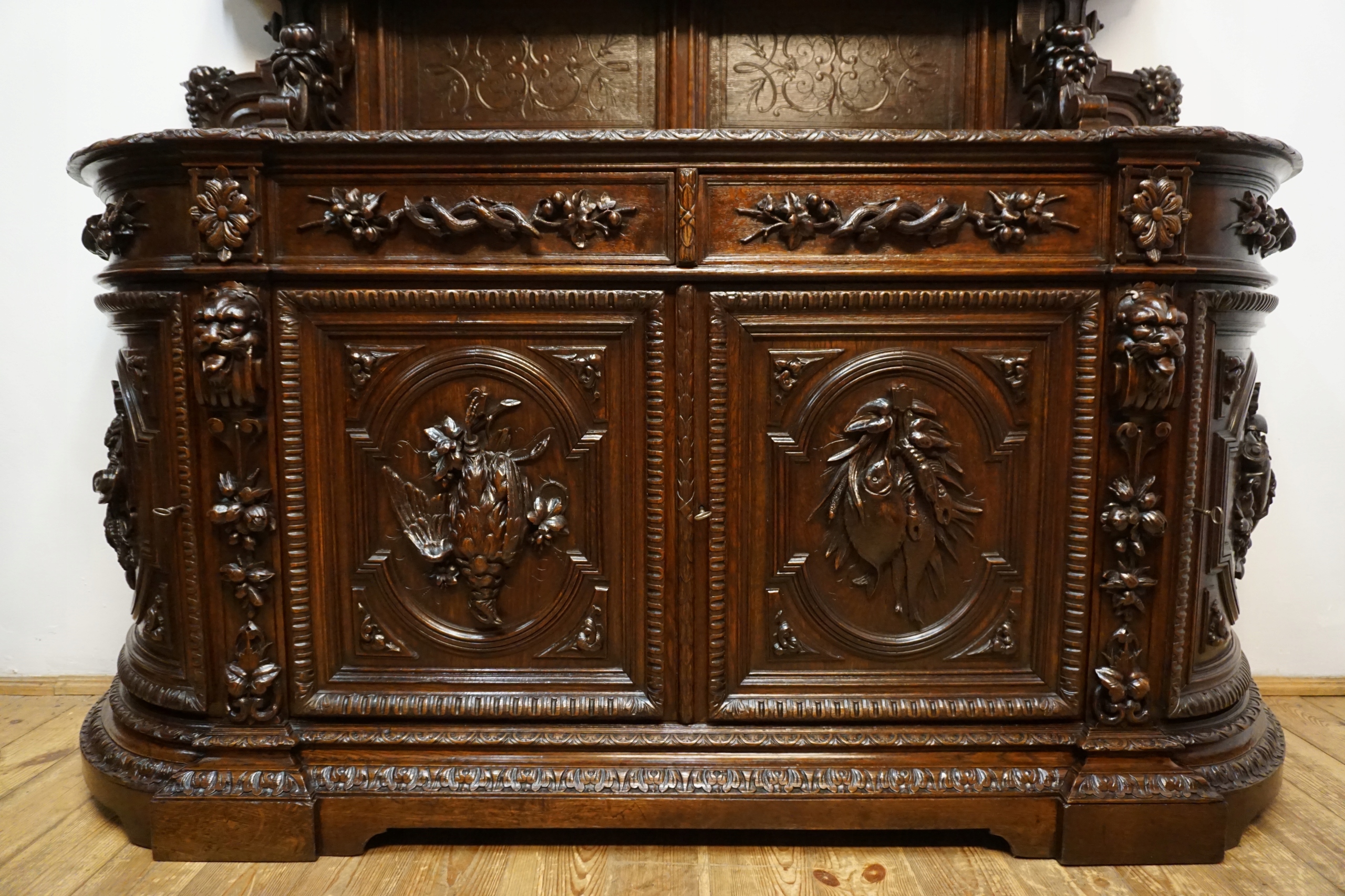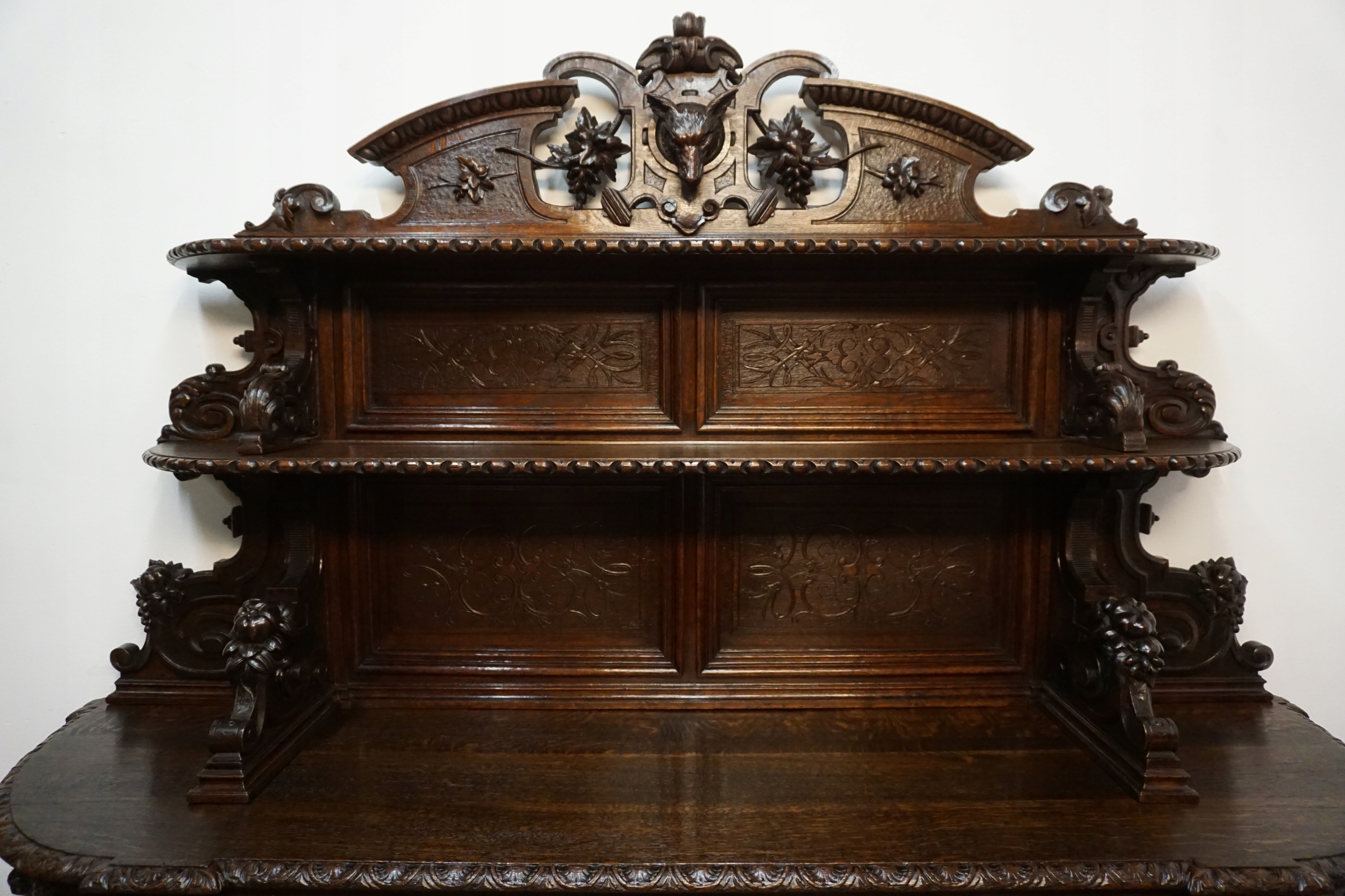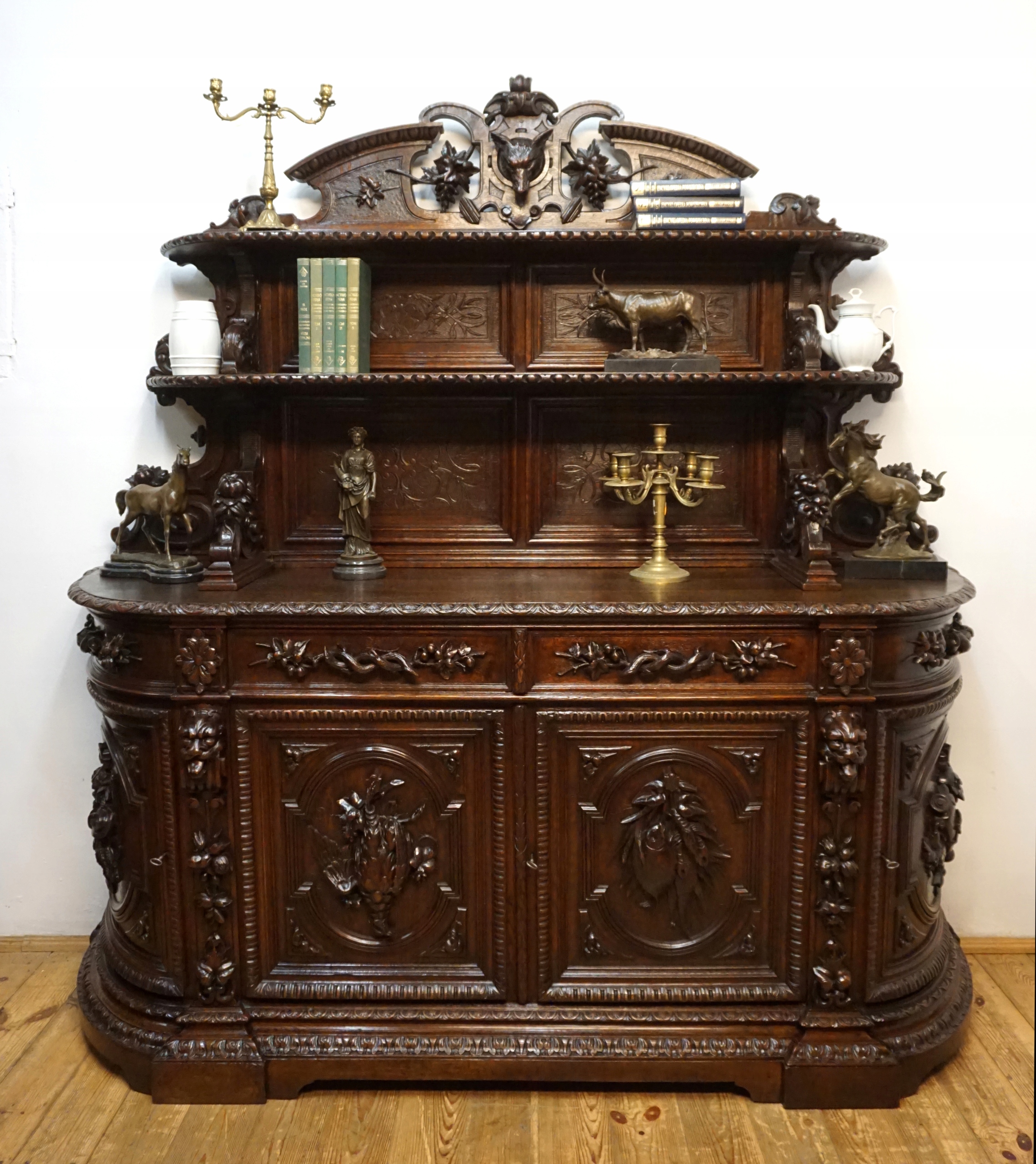 Представленный буфет представляет собой уникальный образец мастерства 19 века – монументальный предмет мебели в охотничьем стиле с ручной резьбой, восхищающий богатством деталей, глубиной цвета и благородством старого дерева. Благодаря профессиональной консервации и отделке высококачественным натуральным воском фуршет вернул себе первоначальный блеск, сохранив при этом все свои исторические ценности.