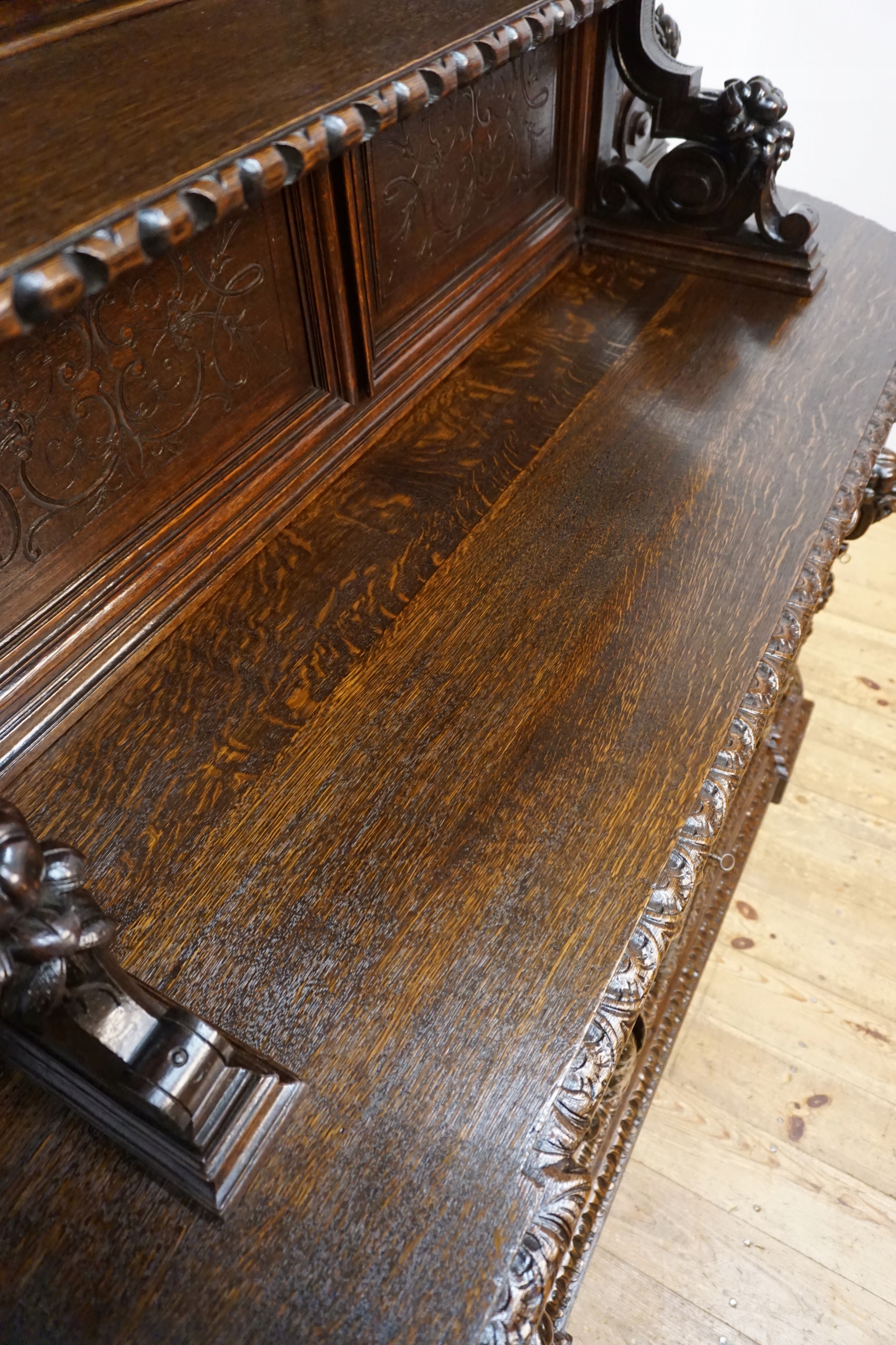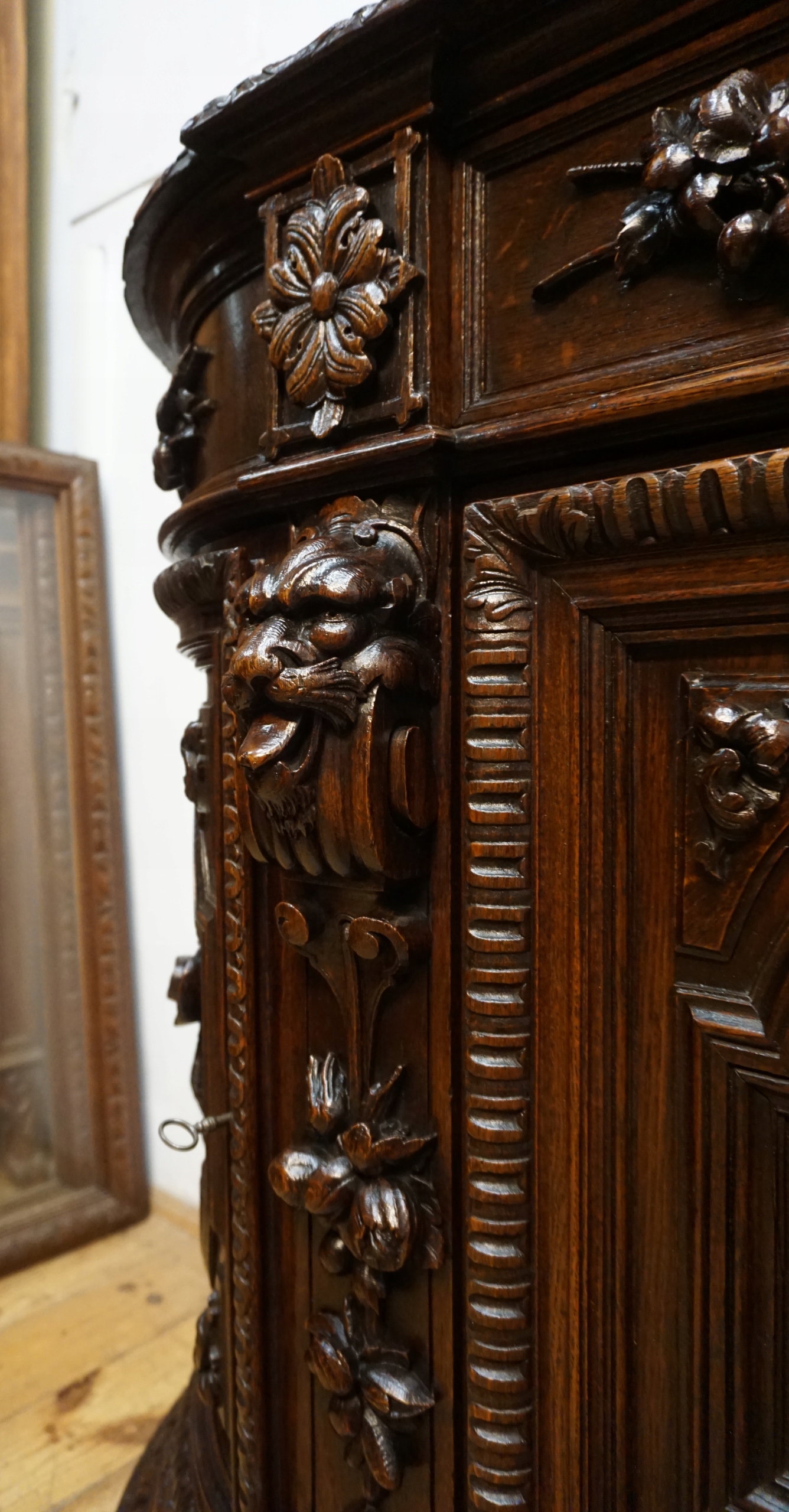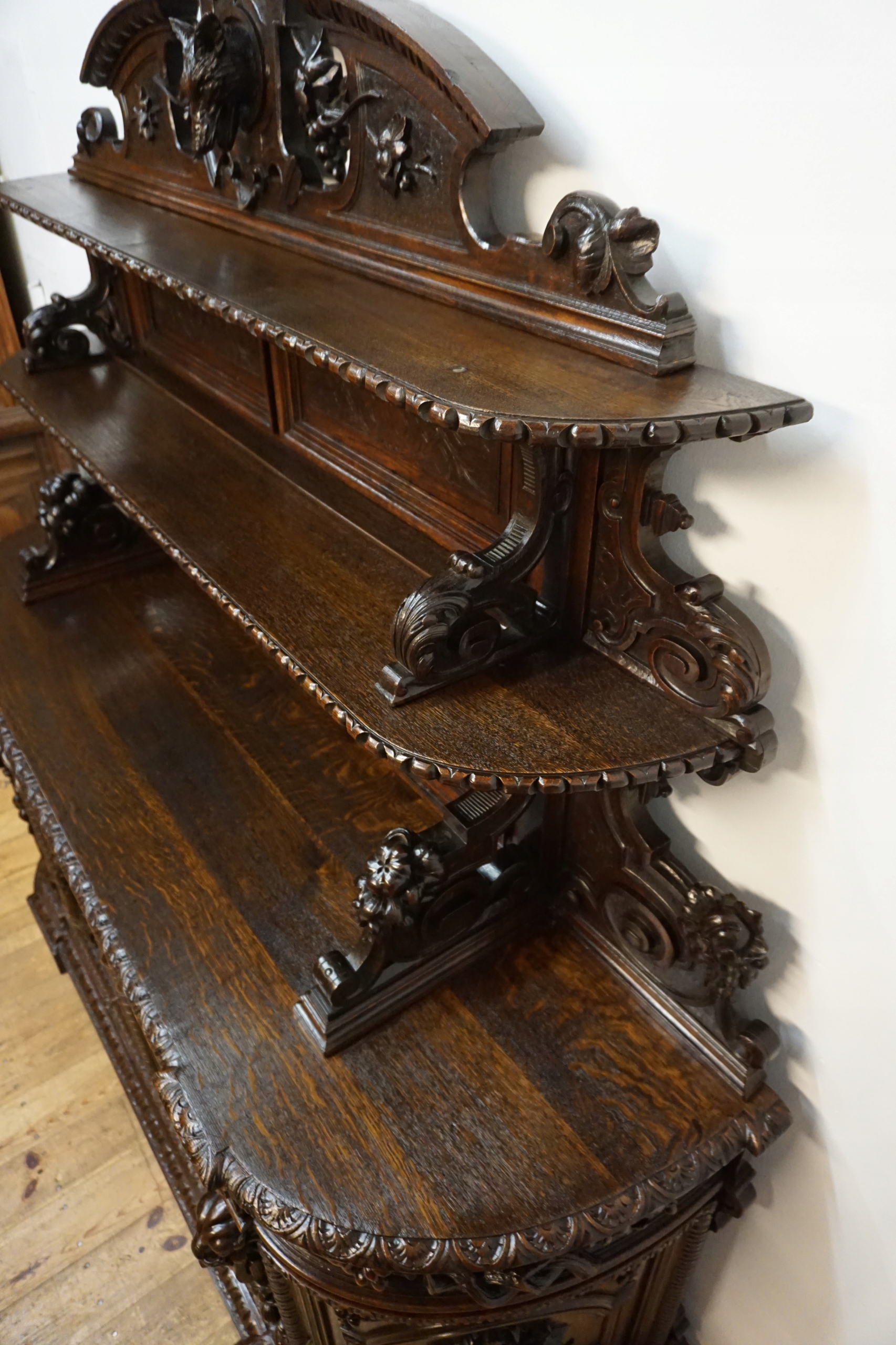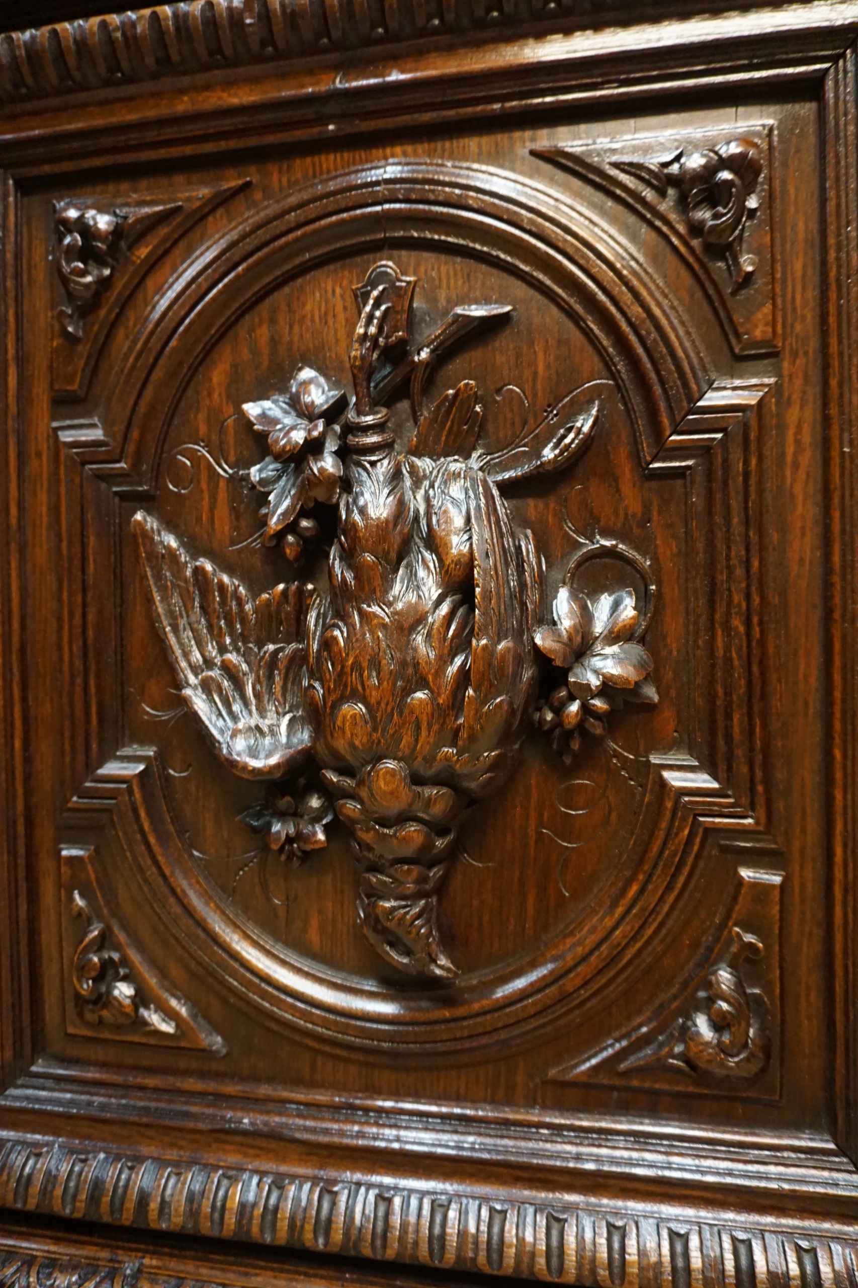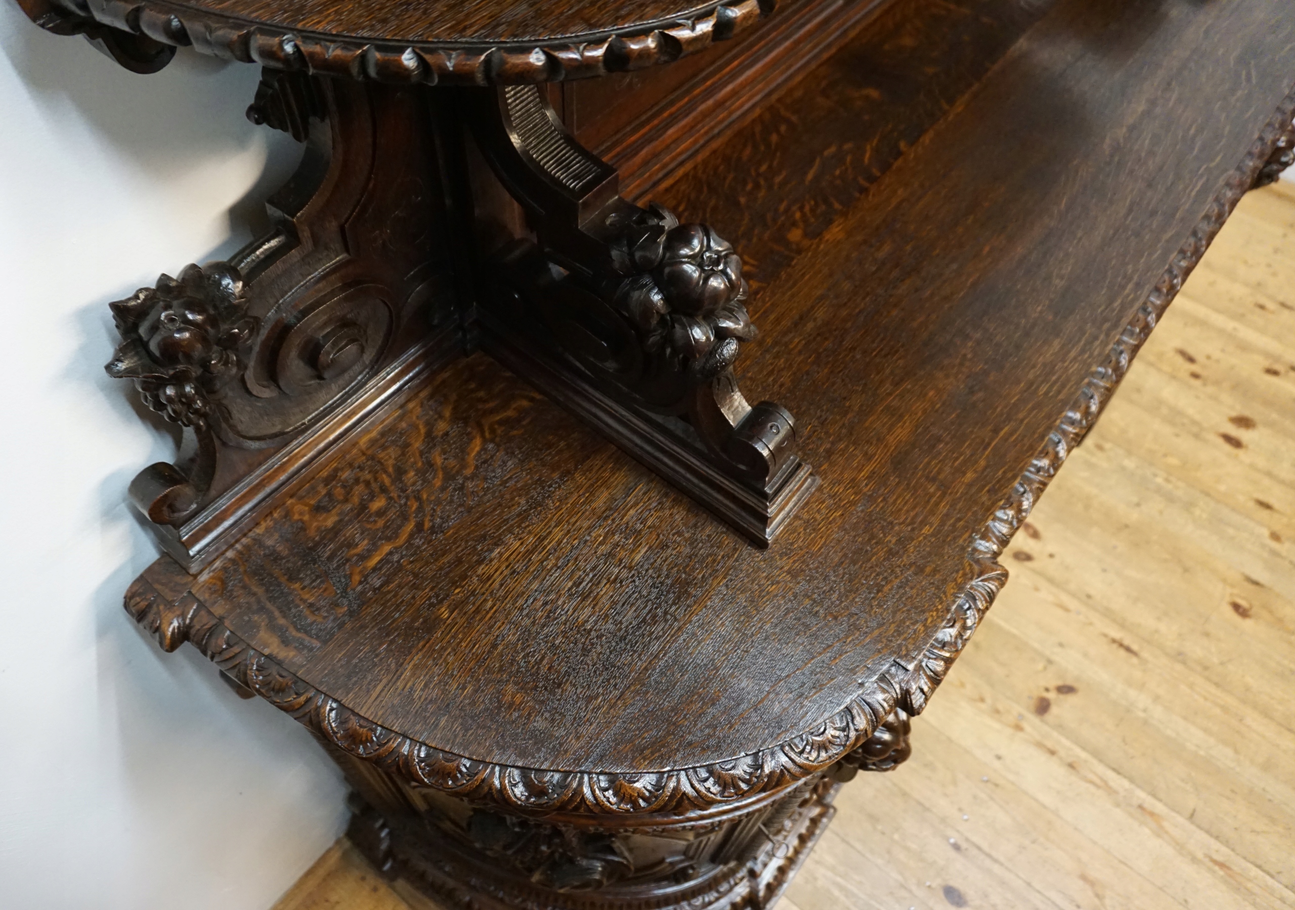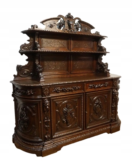 Представленный буфет представляет собой уникальный образец мастерства 19 века – монументальный предмет мебели в охотничьем стиле с ручной резьбой, восхищающий богатством деталей, глубиной цвета и благородством старого дерева. Благодаря профессиональной консервации и отделке высококачественным натуральным воском фуршет вернул себе первоначальный блеск, сохранив при этом все свои исторические ценности.