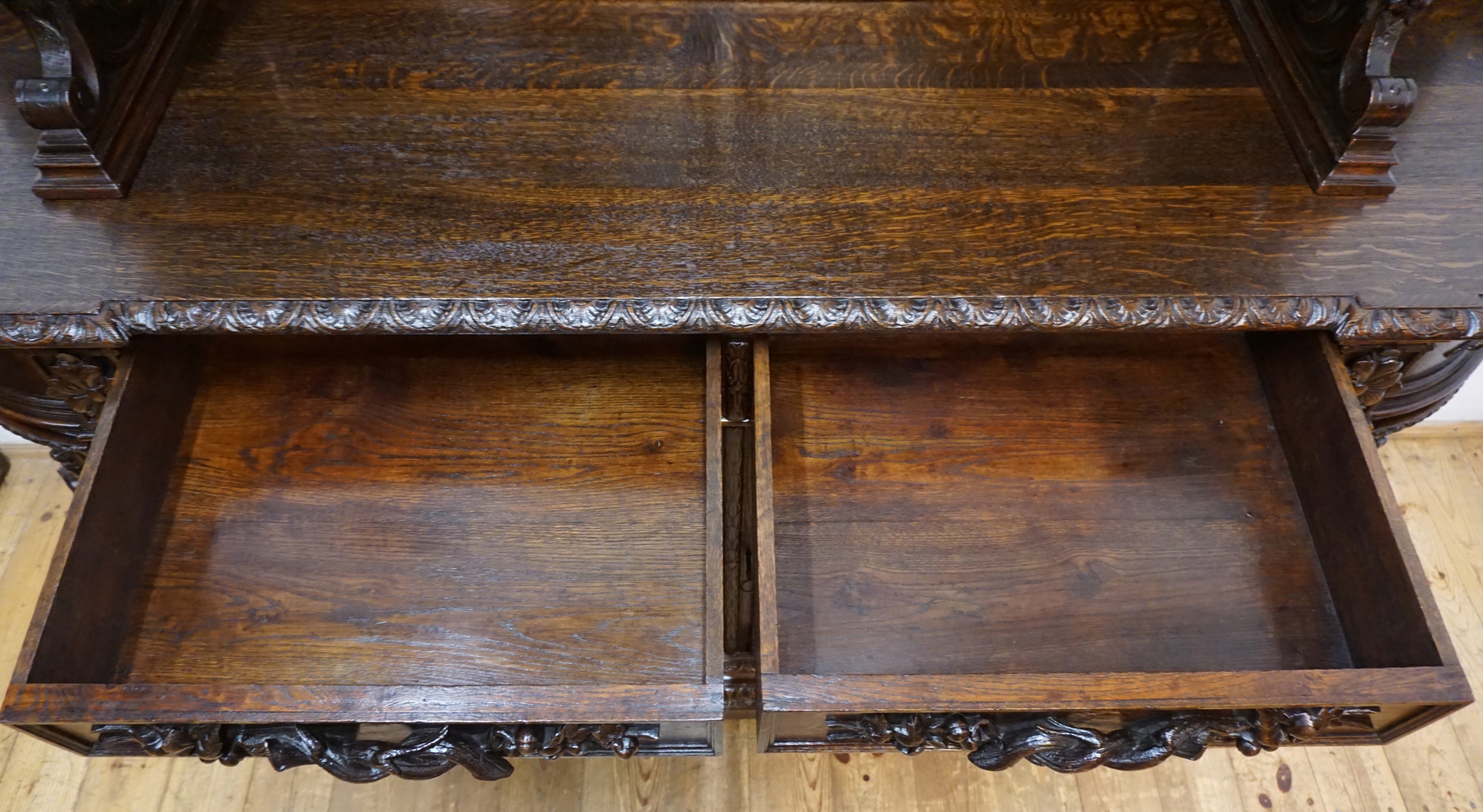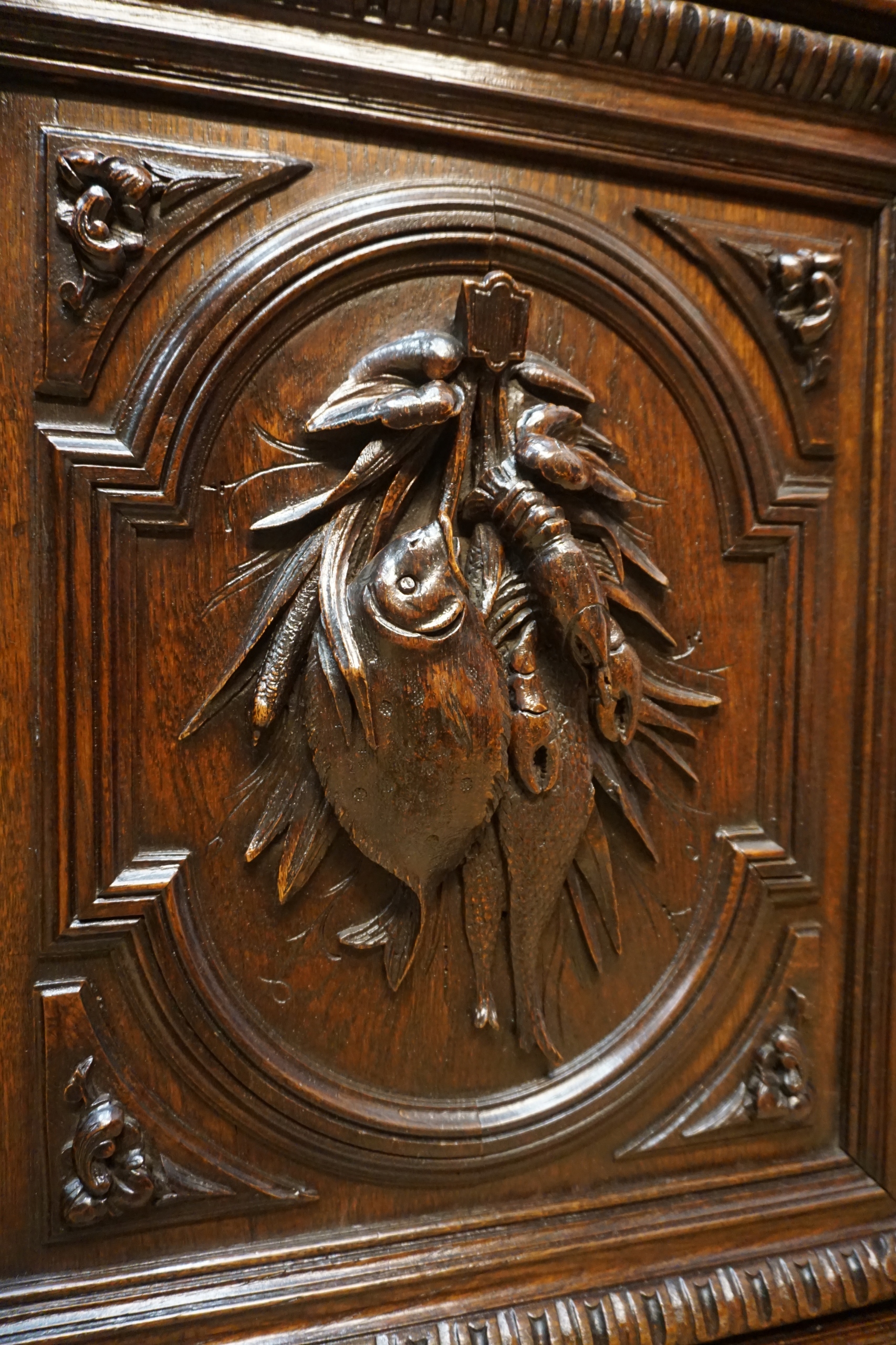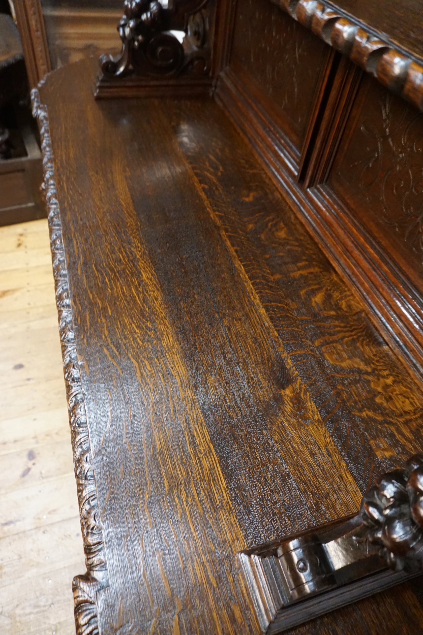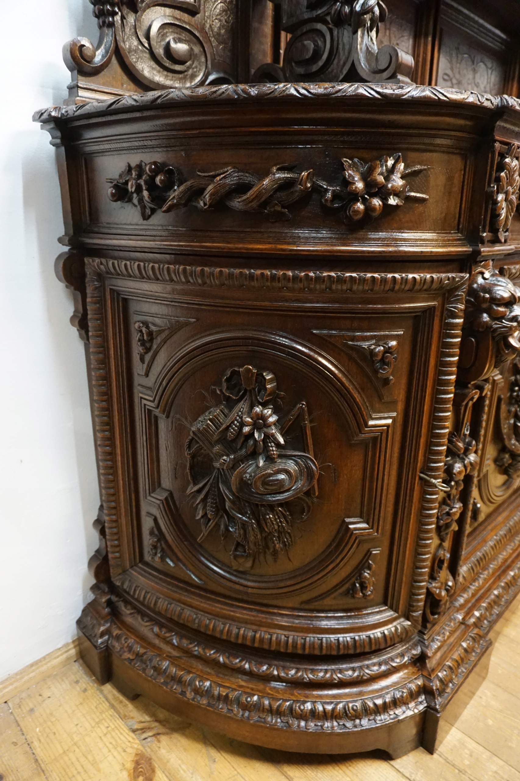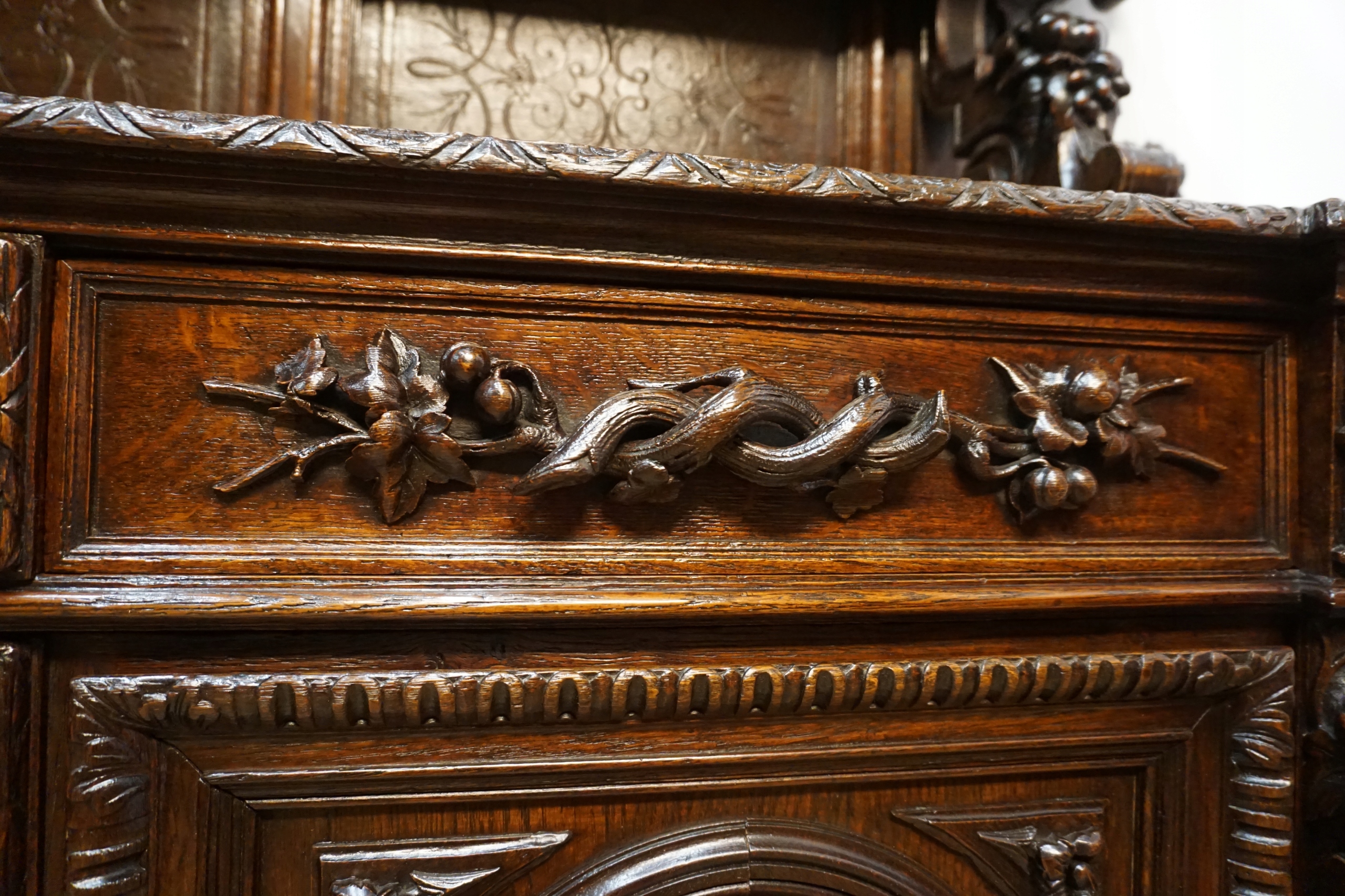 Представленный буфет представляет собой уникальный образец мастерства 19 века – монументальный предмет мебели в охотничьем стиле с ручной резьбой, восхищающий богатством деталей, глубиной цвета и благородством старого дерева. Благодаря профессиональной консервации и отделке высококачественным натуральным воском фуршет вернул себе первоначальный блеск, сохранив при этом все свои исторические ценности.
