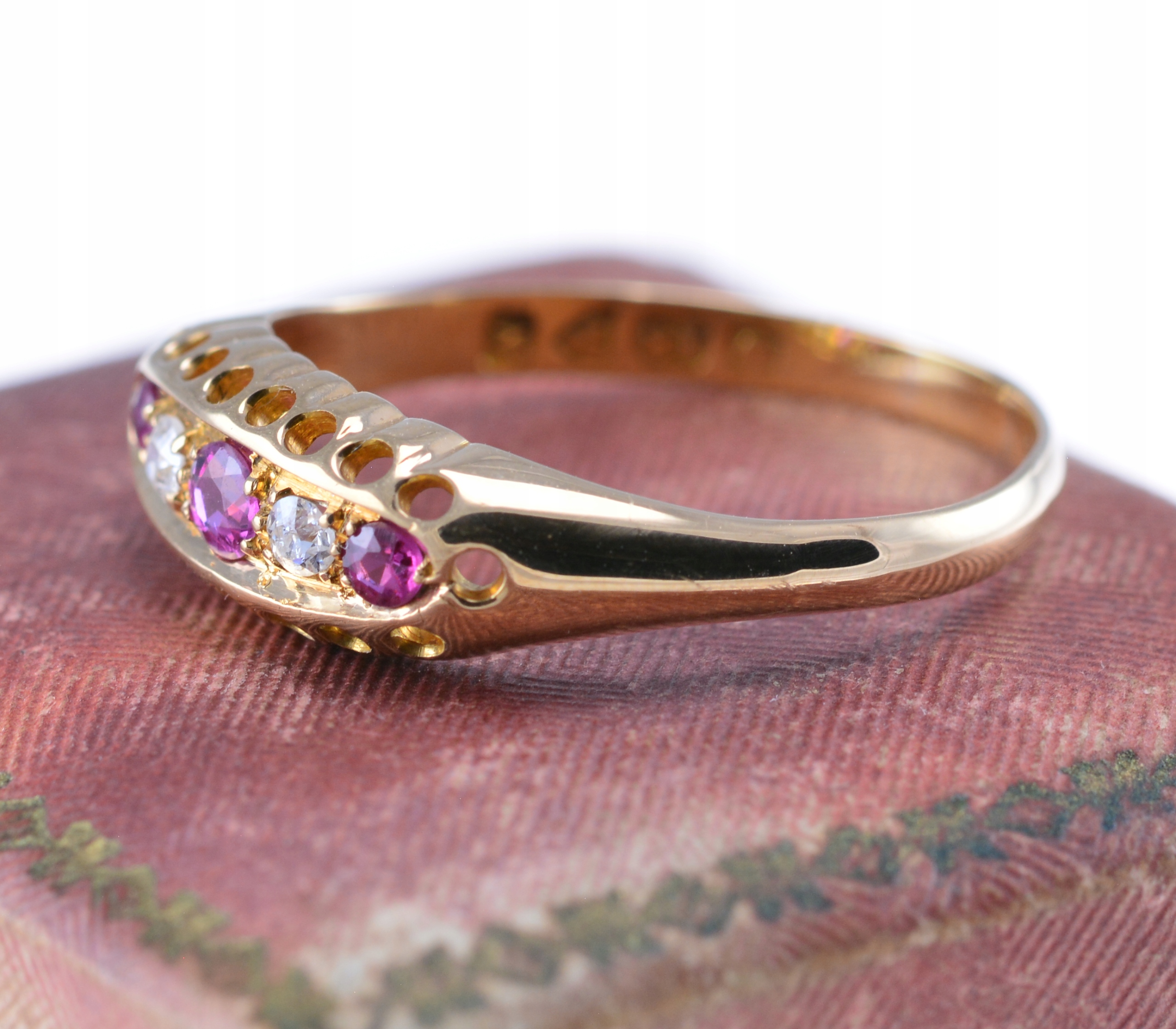 Предмет продажи — старинное английское кольцо из 18-каратного золота, декорированное с рубинами общим весом 0,18 карата и бриллиантами огранки 16/16 (0,05 карата). Английские клейма, Честер, 1913 г. Красивое кольцо, которому более 100 лет, в отличном состоянии.