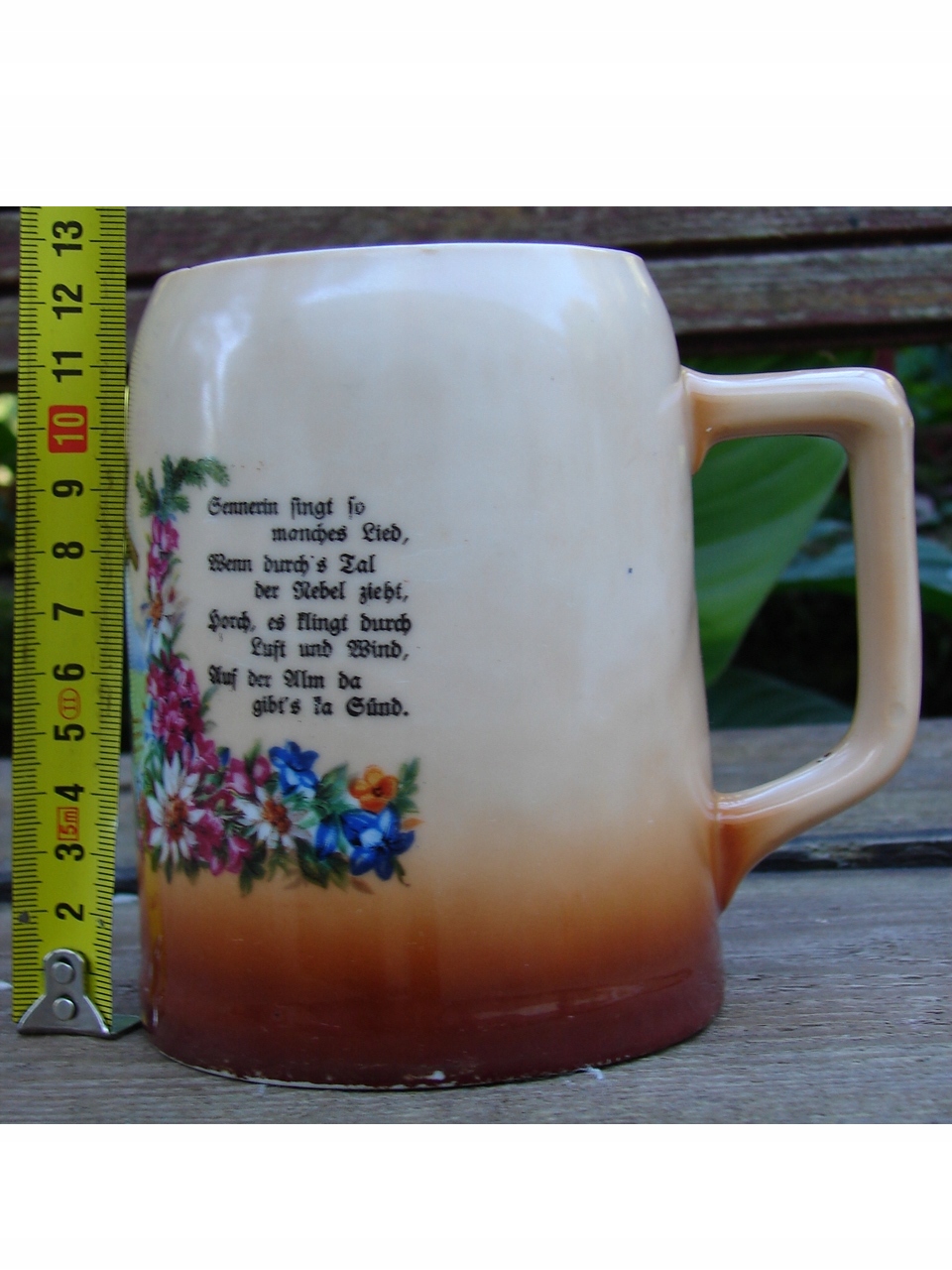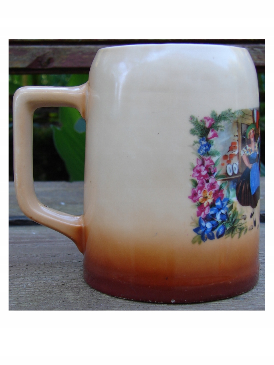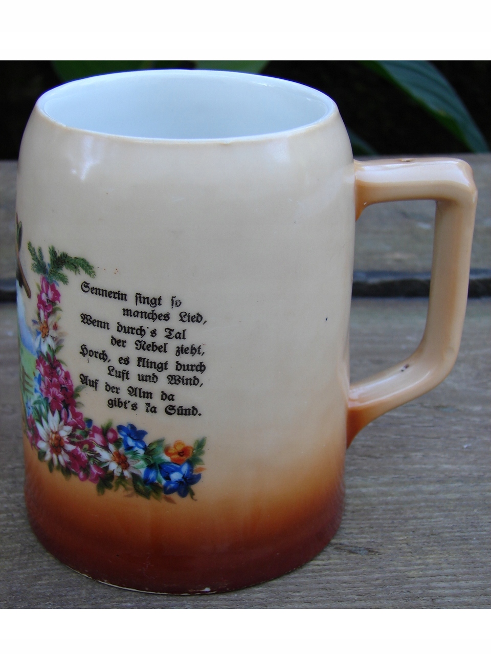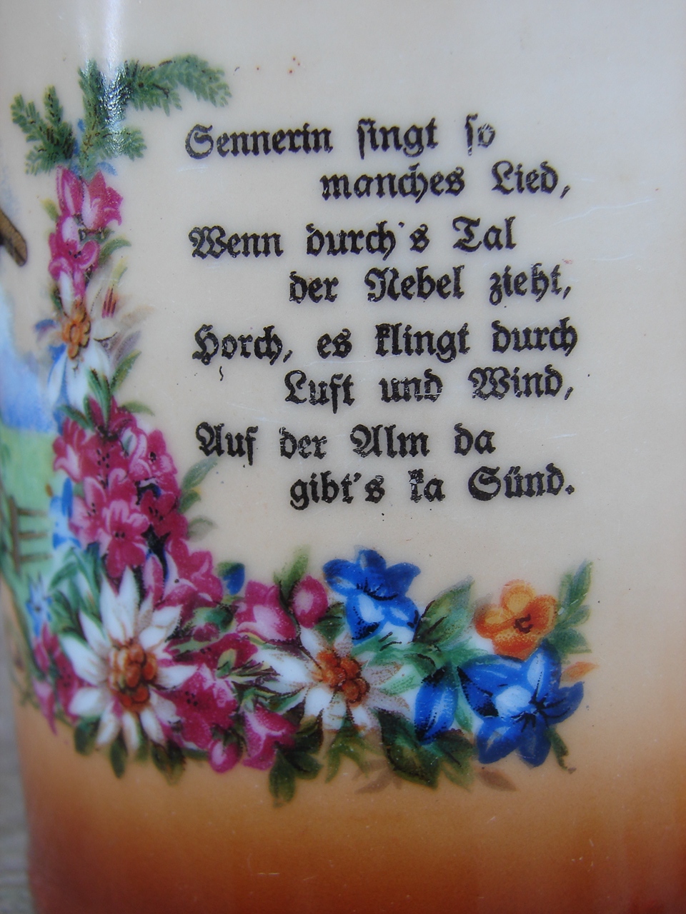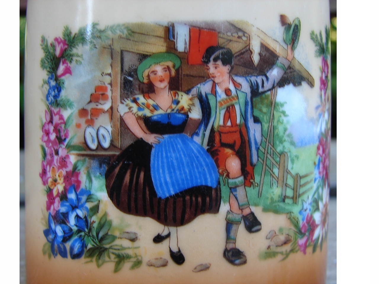 Старая кружка из массивного фарфора, украшенная жанровой сценой, изображающей пару в традиционных альпийских народных костюмах (вероятно, баварских или австрийских) на фоне деревенского коттеджа или хижины.