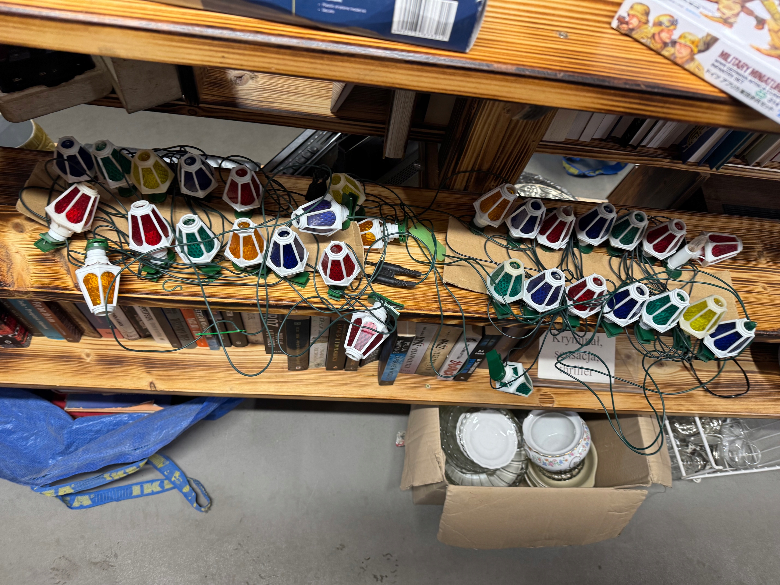 - Описание: / b> Набор красочных светильников рождественской елки с периода PRL. Лампы имеют форму маленьких фонарей с разноцветными вставками. Каждая лампа монтируется на зеленом кабеле. Идеально подходит для рождественских украшений, дайте интерьеру ретро -персонаж.
