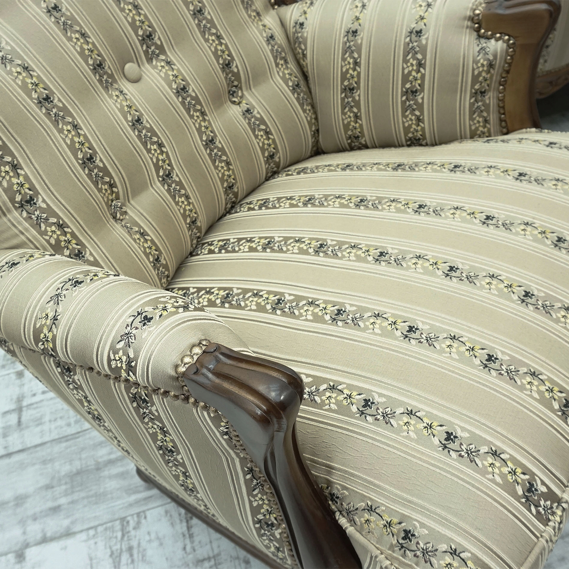 Комплект состоит из дивана с красивой резьбой, двух удобных кресел и стильного деревянного журнального столика. Каждый элемент набора тщательно изготовлен из материалов высочайшего качества, сочетающих в себе комфорт и долговечность. Диван предлагает не только комфорт, но и неповторимый стиль. Его классический дизайн, украшенный тонкой резьбой, притягивает взгляд и привносит в интерьер нотку элегантности. Тонкая полосатая обивка делает его легким, а прочная конструкция обеспечивает долговечность на долгие годы. Центральным элементом гарнитура является элегантный журнальный столик из высококачественной древесины ореха. Его классическая форма и тщательно обработанный верх с инкрустацией идеально сочетаются с остальным комплектом, создавая единое целое.