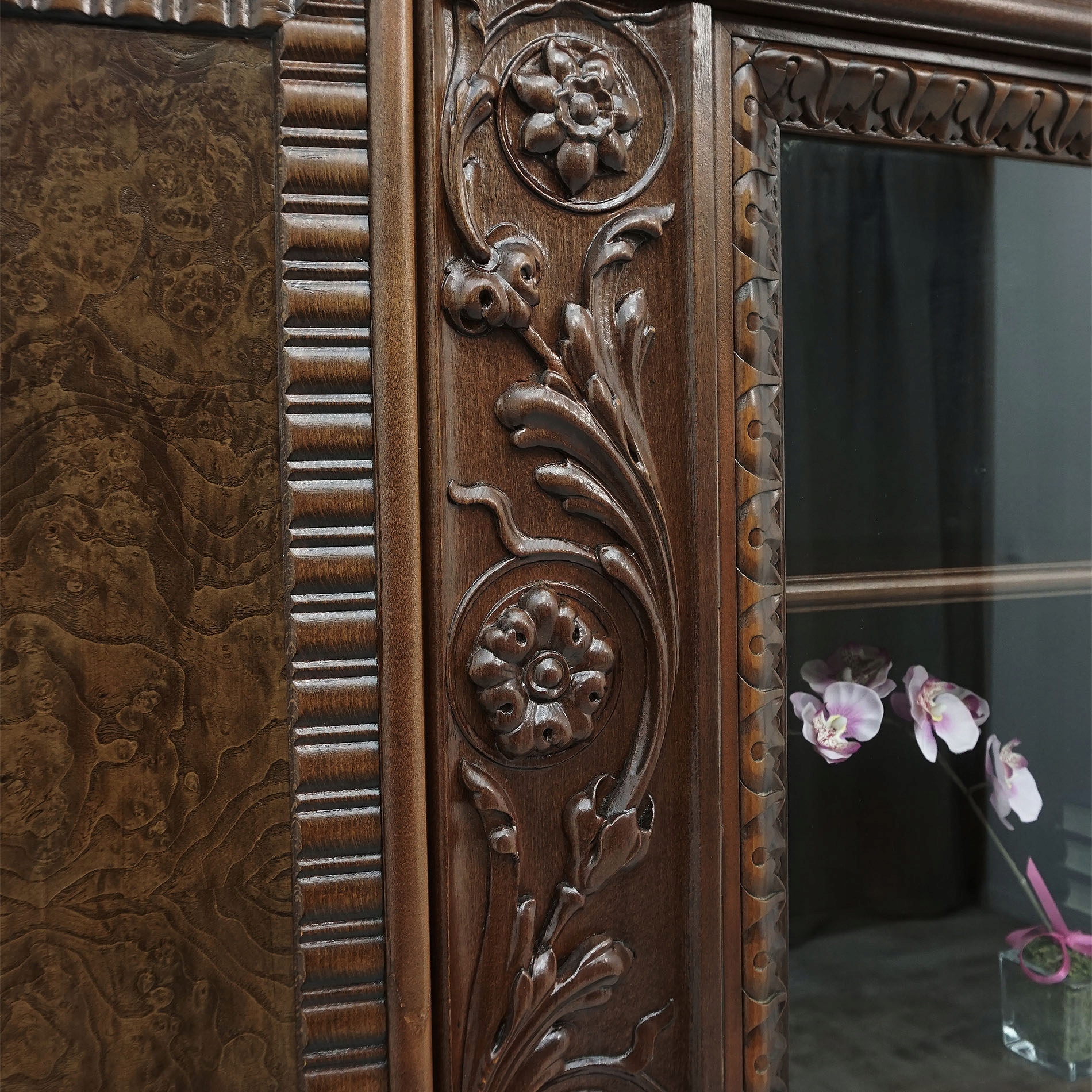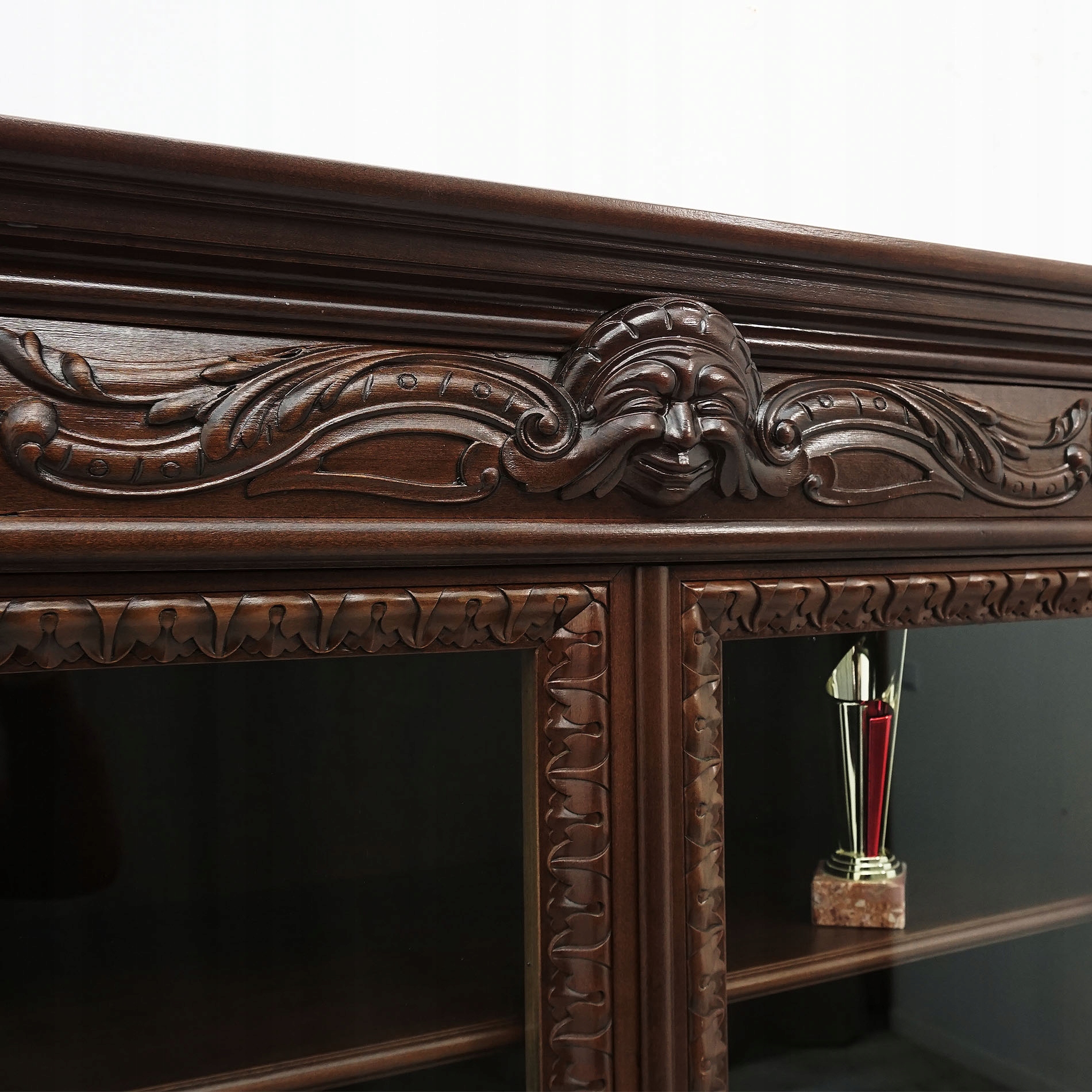 Комплект из массива дерева, украшенный замысловатой резьбой, излучает элегантность и классику. Впечатляющий силуэт мебели украшен сложной резьбой и деталями, отсылающими к классическим мотивам эпохи Возрождения, таким как гротески, гербы или растительные мотивы. Богато украшенные дверные фасады и резные углы придают мебели характерный вид неоренессанса. Такое уникальное сочетание функциональности и эстетики делает библиотеку уникальным элементом дизайна, напоминающим о старине и ремесленных традициях.