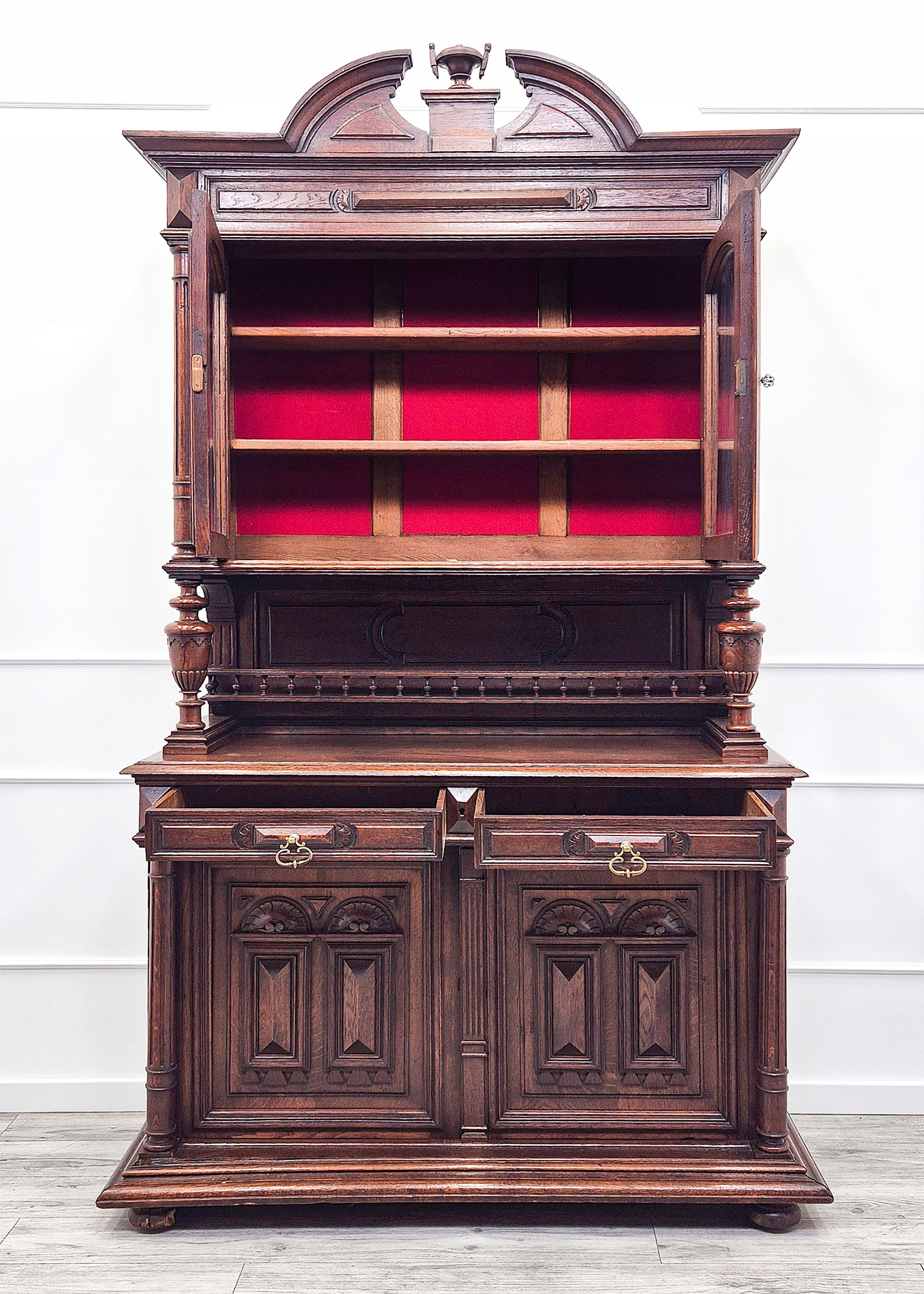 - верхний с два стеклянных фронта, полка посередине, бордовая ткань на заднем плане; внушительная корона с декоративным навершием.