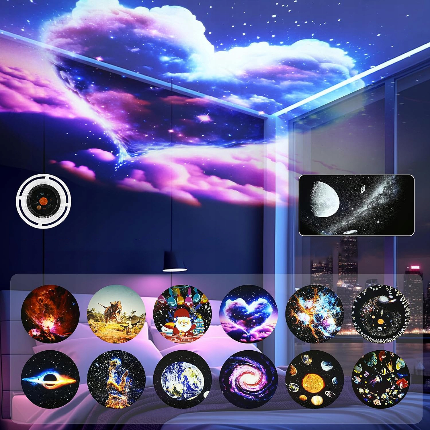 - Ваше жизненное пространство с нашим современным проектором-планетарием с 13 очаровательными сценами, такими как Луна (встроенная), Солнечная система, Земля, черная дыра, Млечный Путь, туманность Ориона, NGC6357 и наблюдаемые колонны творения вселенная, динозавр, море.