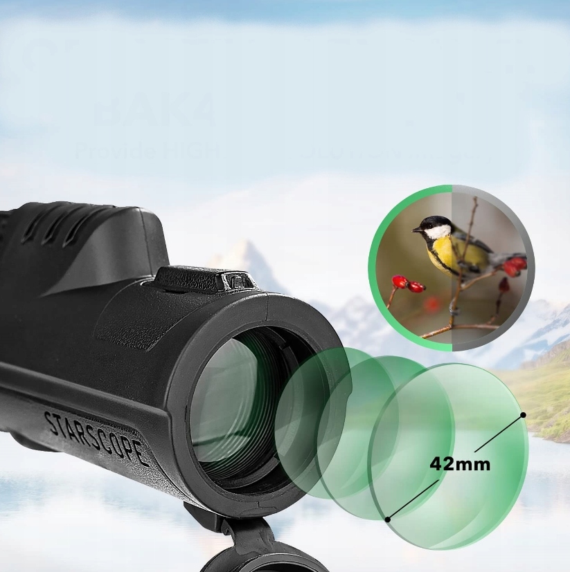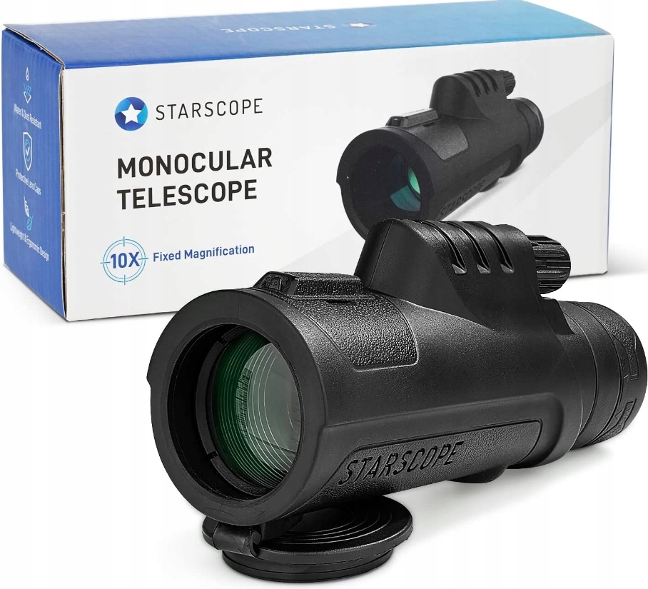 Водонепроницаемый и пыленепроницаемый монокуляр дальнего действия: линза монокуляра предотвращает попадание влаги и пыли (при прикрепленных крышках объектива), обеспечивая более длительный срок службы и лучшую производительность.