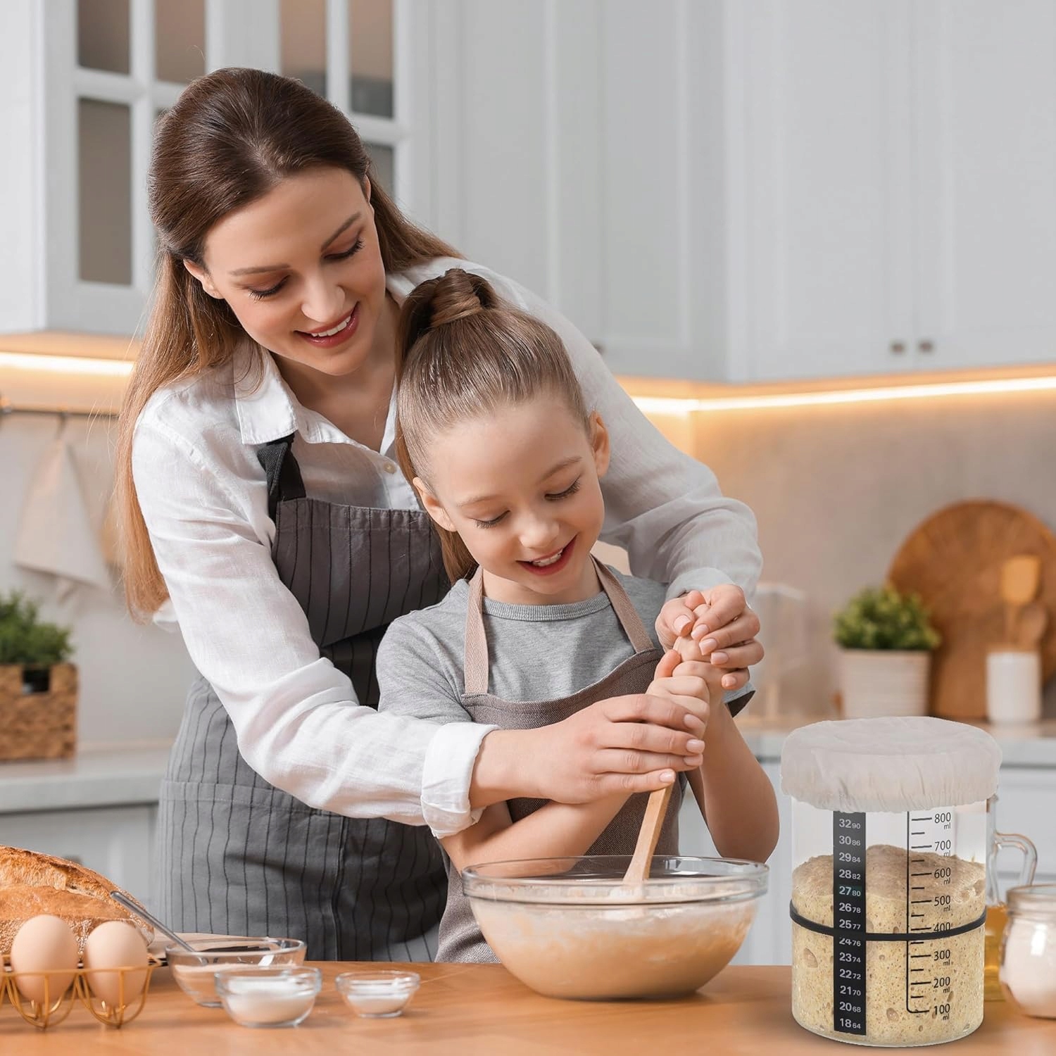 📦📦【Набор закваски】 Наш набор закваски включает в себя банку для брожения закваски объемом 900 мл, бумагу для измерения температуры, резиновые ленты, ручку, 8 этикеток, силиконовую лопаточку, тканевую и деревянную крышку. Он содержит все необходимое для удобного брожения закваски.