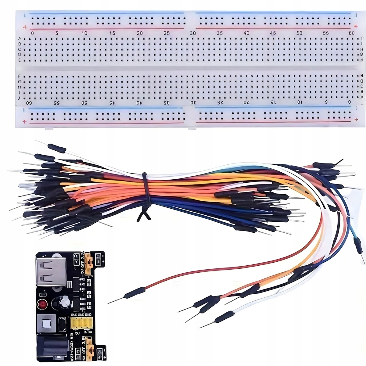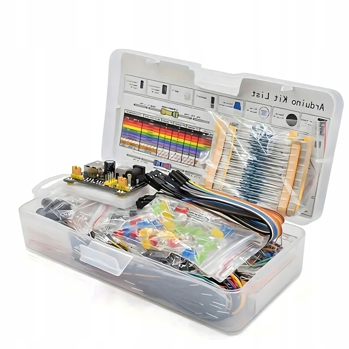 Полный набор электронных компонентов, включая модуль мощности, датчики, кабели, резисторы, светодиоды, кнопки и многие другие, которые позволяют реализовать практически любой проект DIY. P>