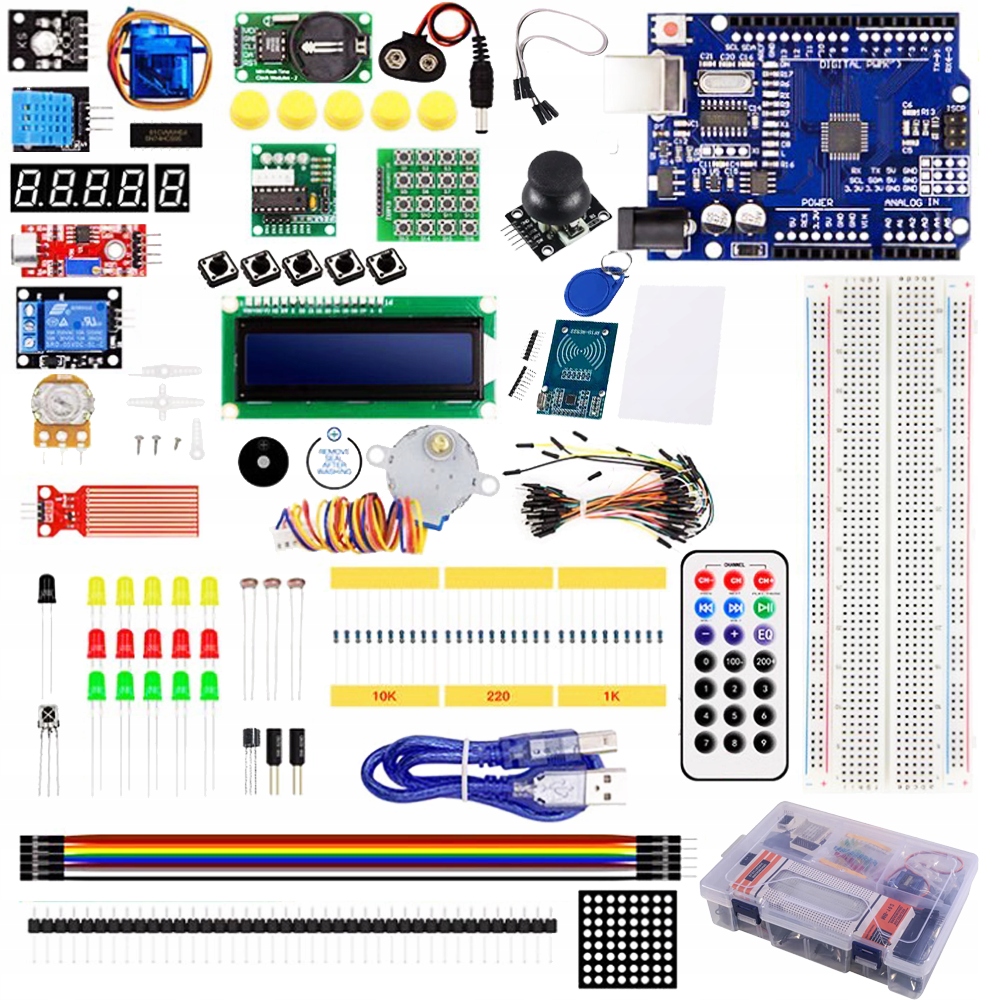 ➡ Представленный набор - это хороший способ начать ваше приключение с электроники и программирования микроконтроллеров. Он основан на популярном микроконтроллере Arduino Uno R3 и содержит множество компонентов, которые позволят вам узнать о различных проектах и их приложениях.