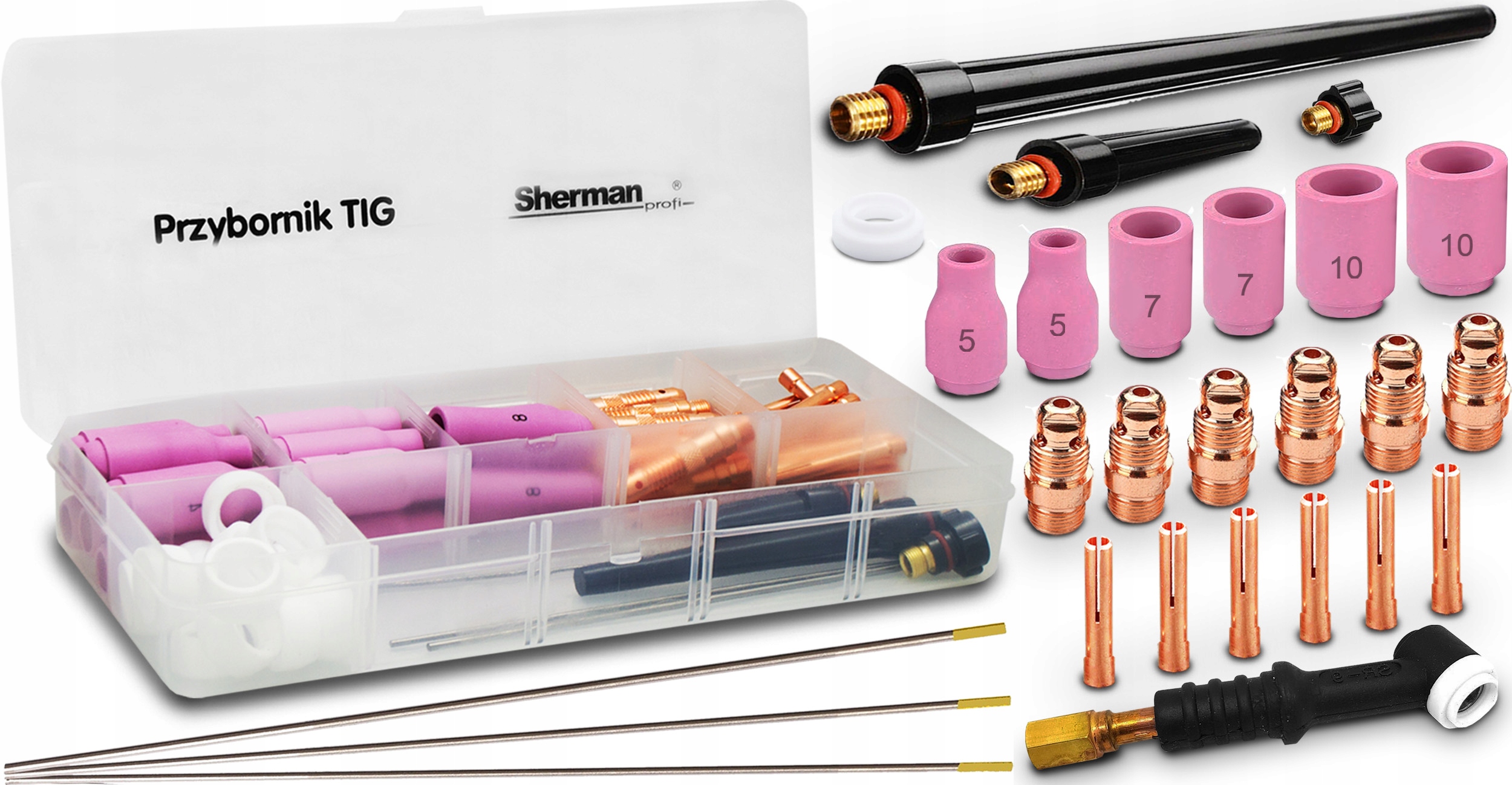 Набор основных элементов, необходимых для того, чтобы начать свое приключение с сваркой TIG AC/DC. Правильно подобранные элементы набора позволят вам сваривать любой материал и вооружить любую сварочную ручку TIG стандартом SR 9/20 и KEMPI - малой горелочной головкой.