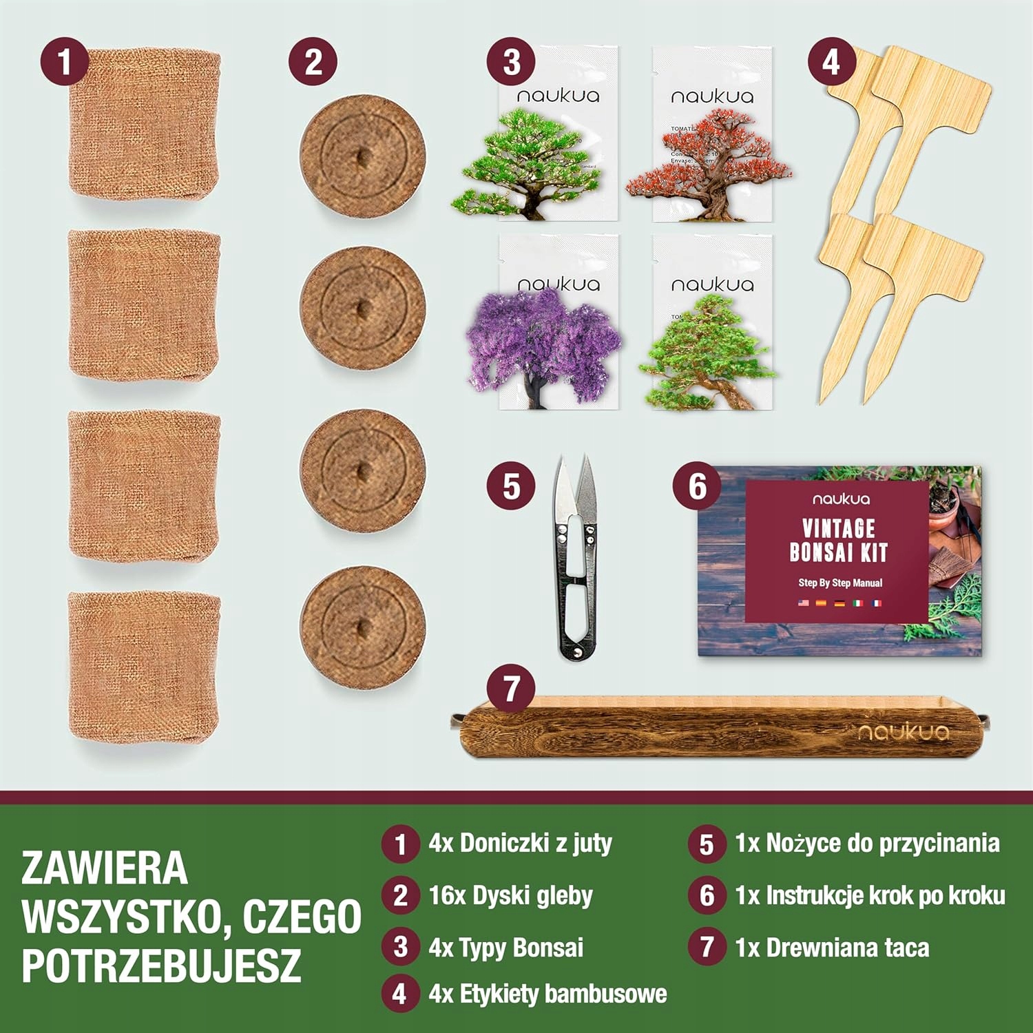 Содержит все необходимое для самостоятельного выращивания 4 различных видов деревьев бонсай, включая органические семена, деревянный поднос, джутовые горшки и многое другое.