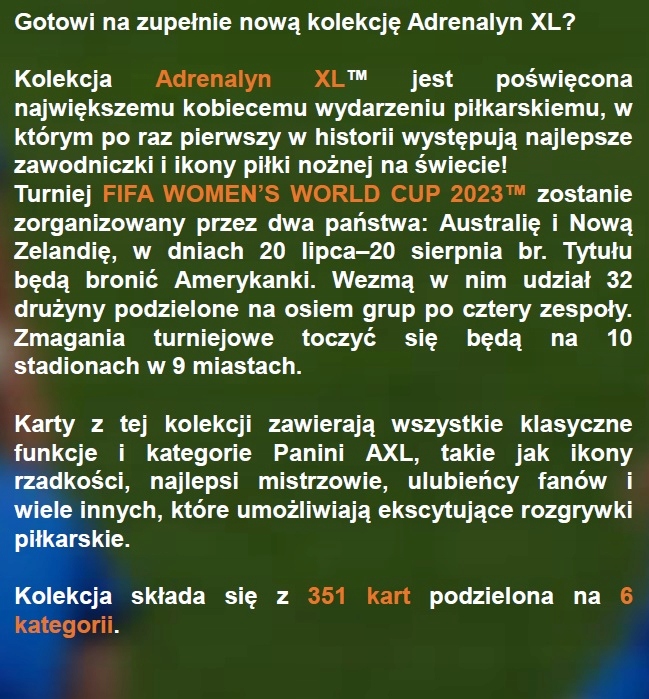 ⭐Коллекция Adrenalyn XL™ посвящена крупнейшему событию женского футбола, в котором впервые в истории участвуют лучшие игроки и футбольные легенды мира! Турнир FIFA WOMEN'S WORLD CUP 2023™ будет организован двумя странами: Австралией и Новой Зеландией с 20 июля по 20 августа этого года. Титул будут защищать американцы. В нем примут участие 32 команды, разделенные на восемь групп по четыре команды. Турнир пройдет на 10 стадионах в 9 городах. Карты в этой коллекции включают в себя все классические функции и категории Panini AXL, такие как значки редкости, лучшие чемпионы, фавориты фанатов и многое другое, что обеспечивает захватывающий футбольный игровой процесс. Коллекция состоит из 351 карты, разделенной на 6 категорий. В стартовый набор Mega входят: коллекционный альбом, 3 пакетика для карточек, 3 карточки ограниченного выпуска и руководство по коллекции (на английском языке).