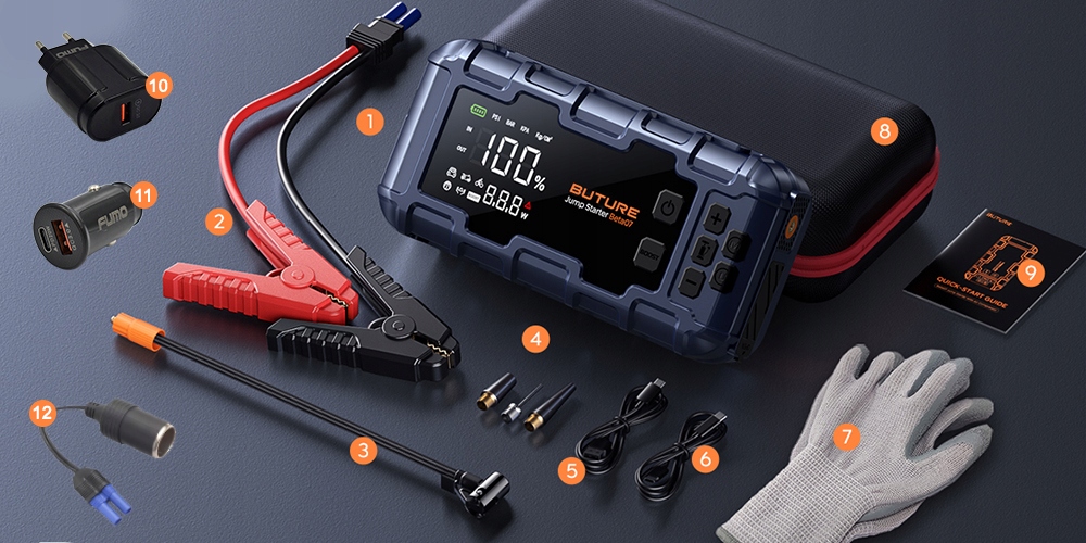 - двойные USB -порты: Два порта USB позволяют заряжать много мобильных устройств одновременно. Зарядка PD45W: Устройство было оснащено быстрого зарядного порта, благодаря 5 минутам зарядки, вы можете запустить свой автомобиль.