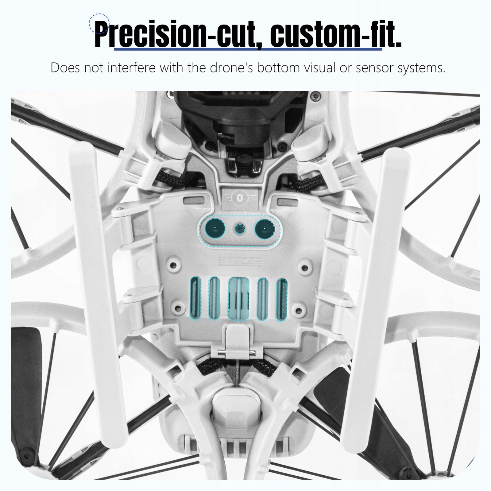 2. 20 мм Повышенная защита: уменьшает воздействие посадки на неровные поверхности и предотвращает повреждение или наращивание грязи на беспилотнике, карданке и пропеллерах.