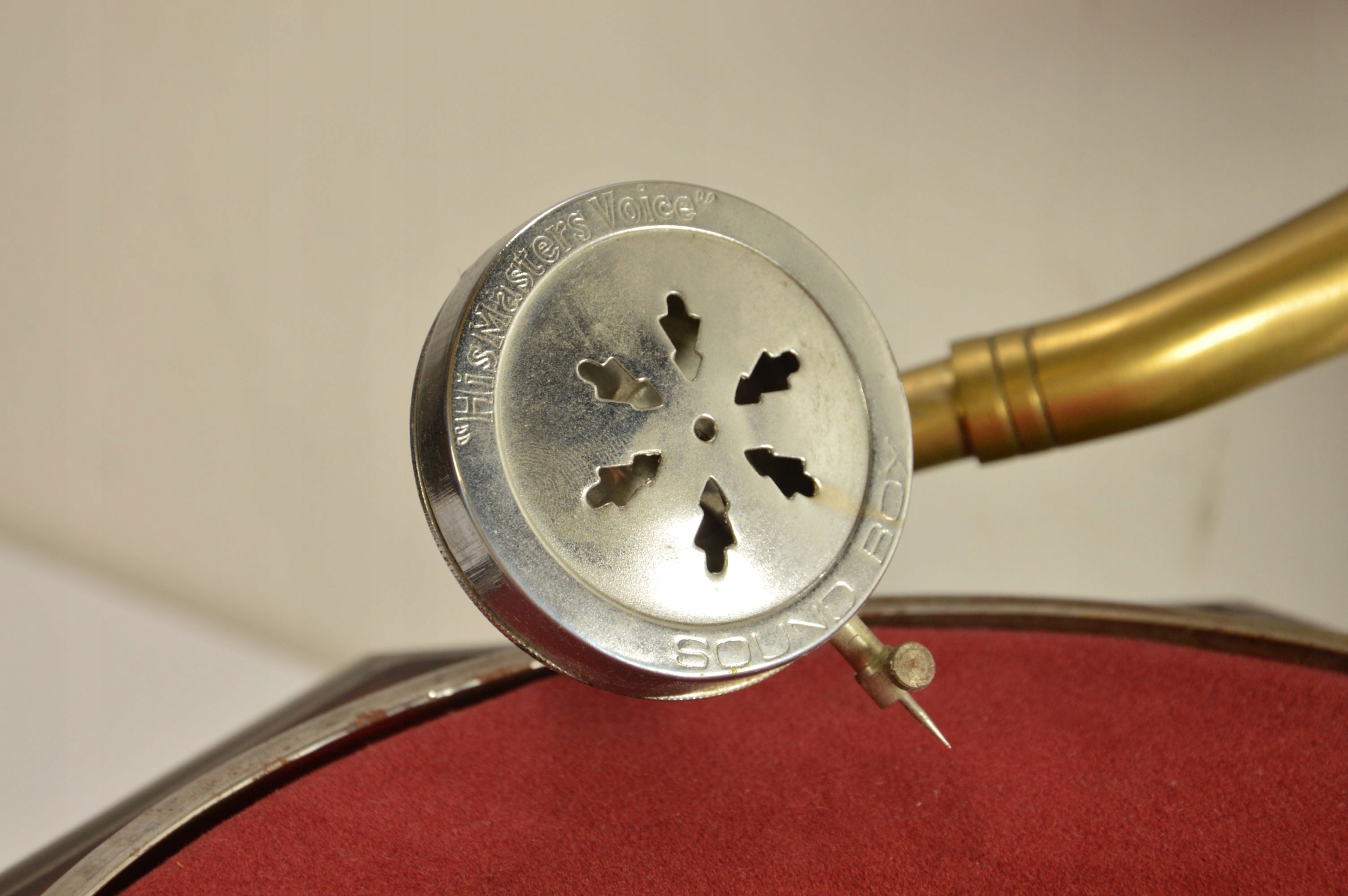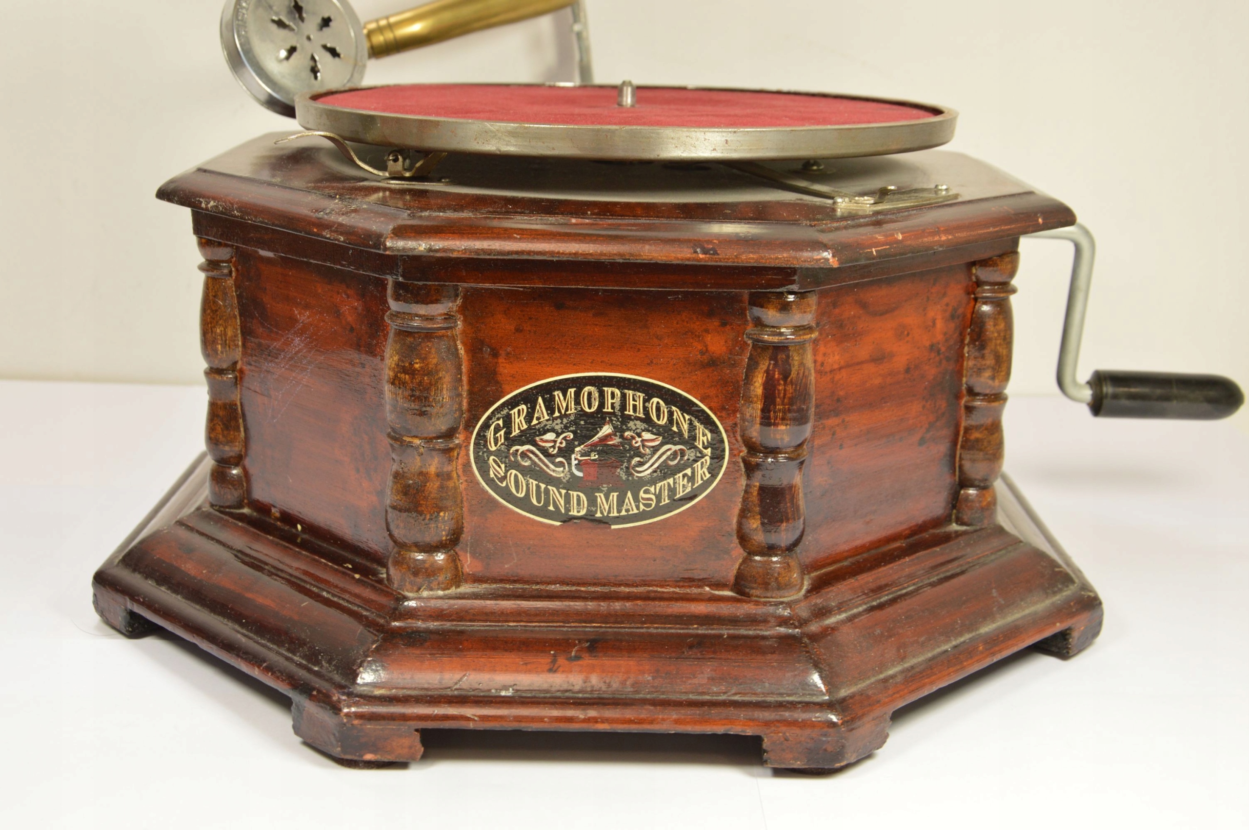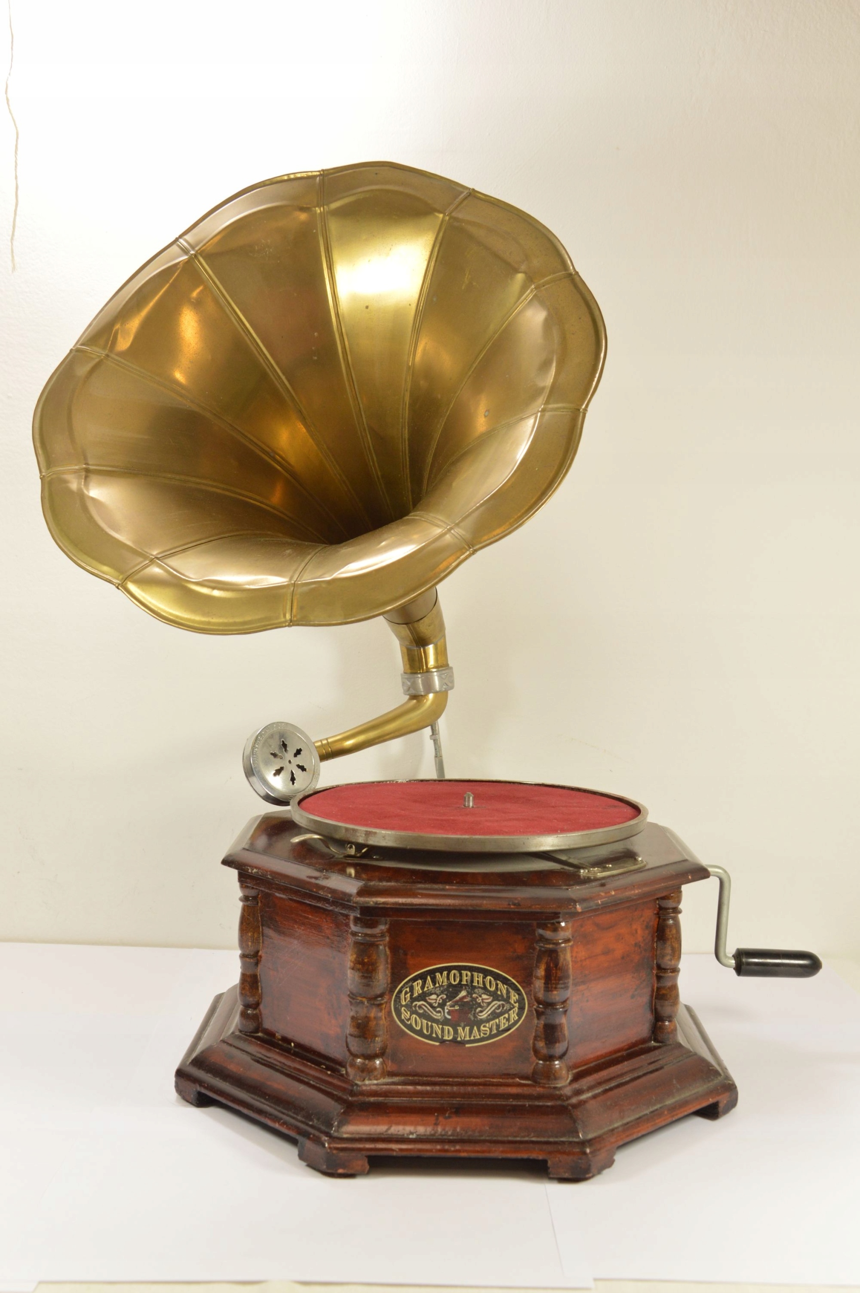 Хороший старый проигрыватель Sound Master на шестиугольном основании. Граммофон представляет собой комплектную функциональную латунную трубку. После запуска запускается и играет. Видимые следы использования, потертости на корпусе и небольшие вмятины на трубке.