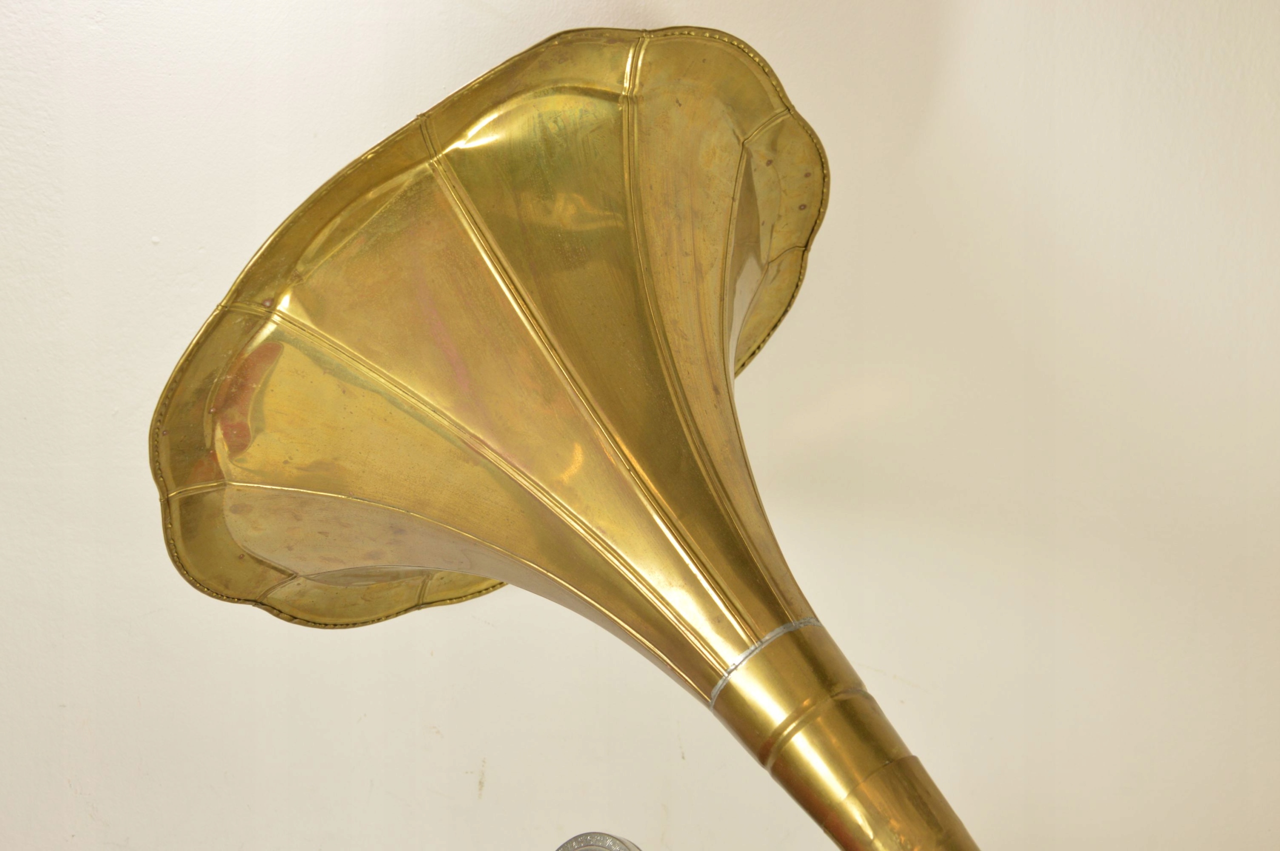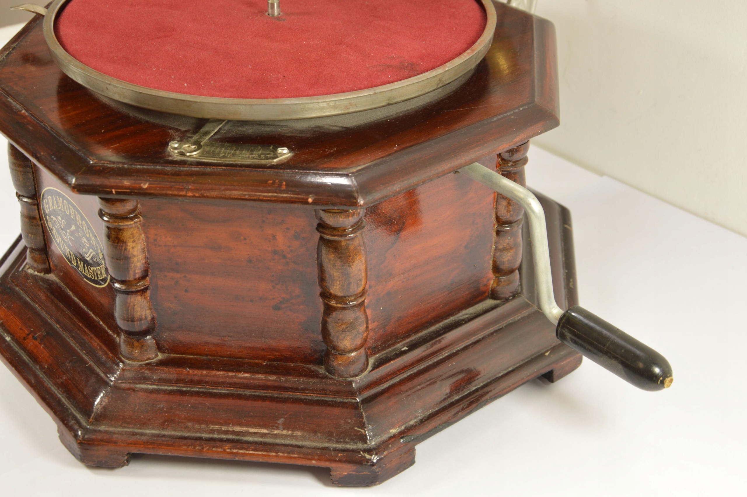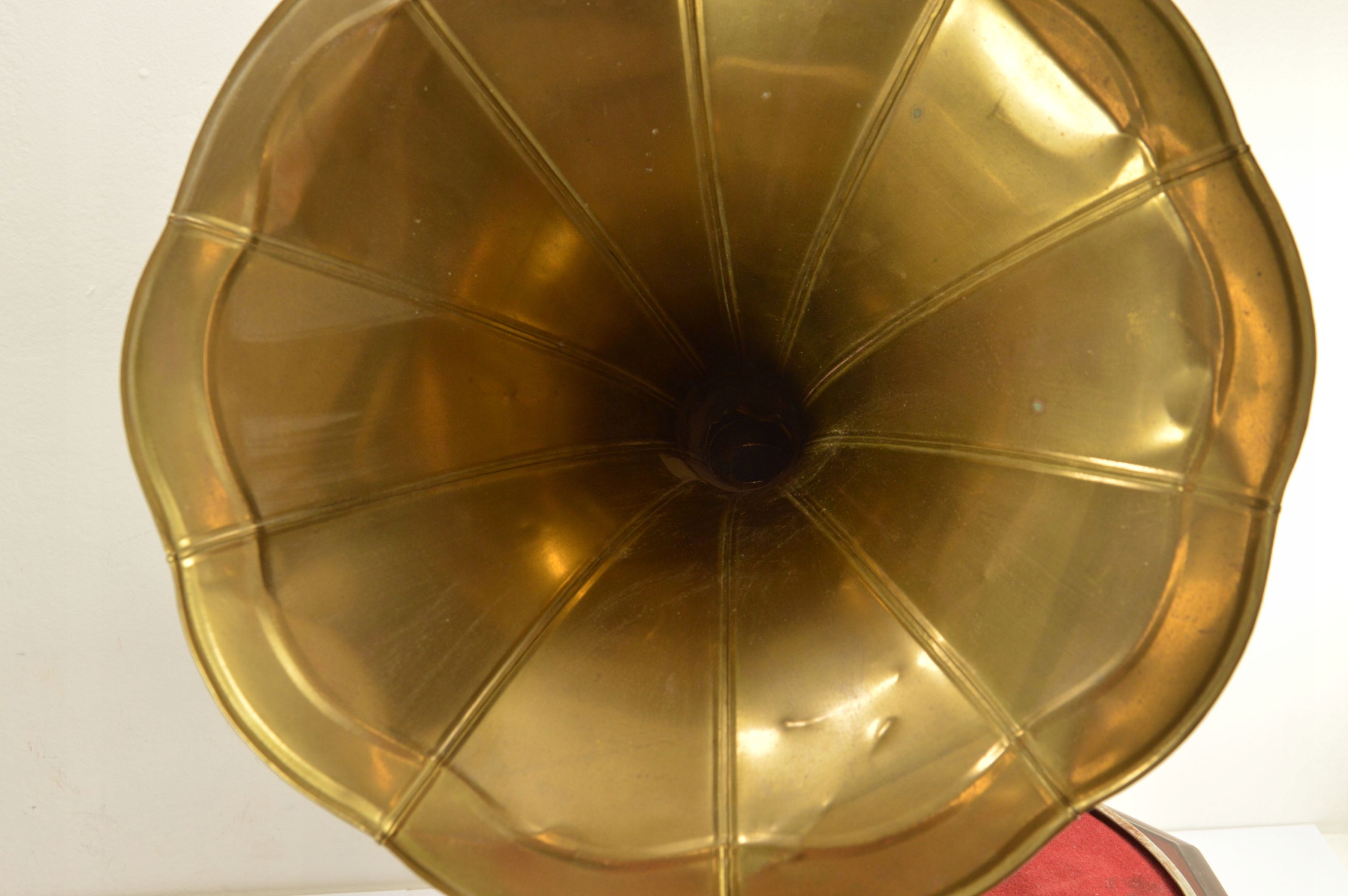 Хороший старый проигрыватель Sound Master на шестиугольном основании. Граммофон представляет собой комплектную функциональную латунную трубку. После запуска запускается и играет. Видимые следы использования, потертости на корпусе и небольшие вмятины на трубке.