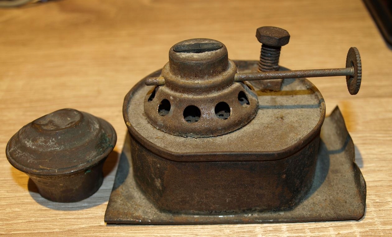 Изготовлен из листового металла. Сохранился колпачок для гашения пламени. Длина: 9,5 см, ширина: 7 см. высота: ок. 5 см (с крышкой: ок. 8 см).