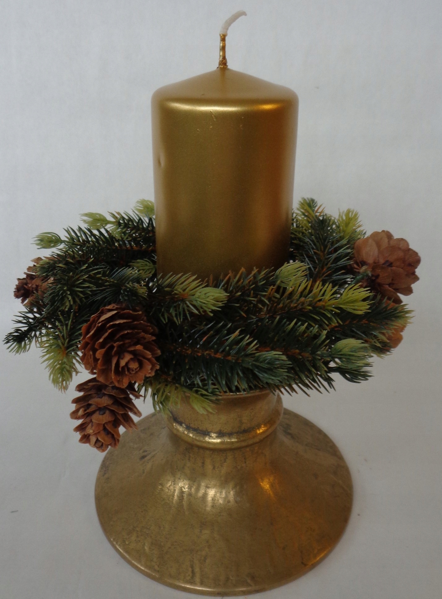 STARY MOSIĘŻNY ŚWIECZNIK ze stroikiem i złotą świecą