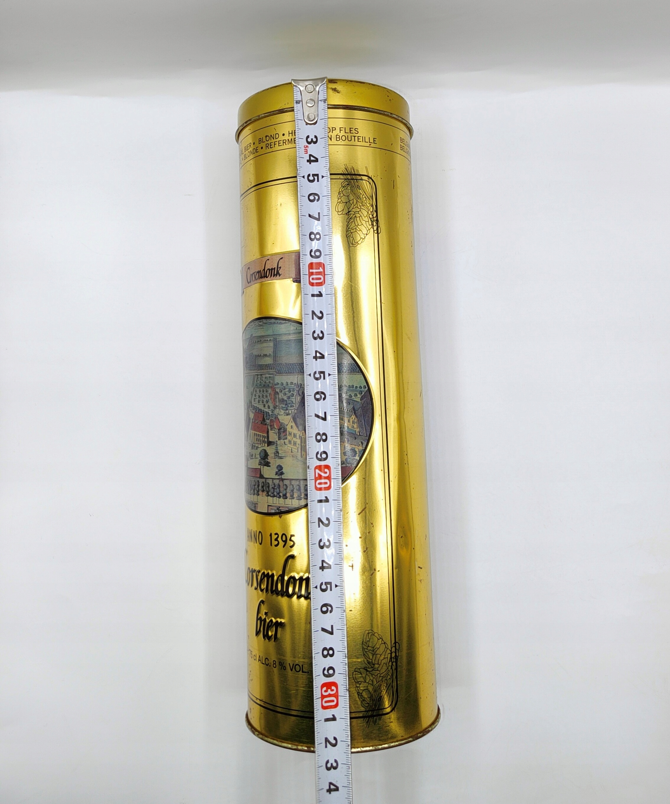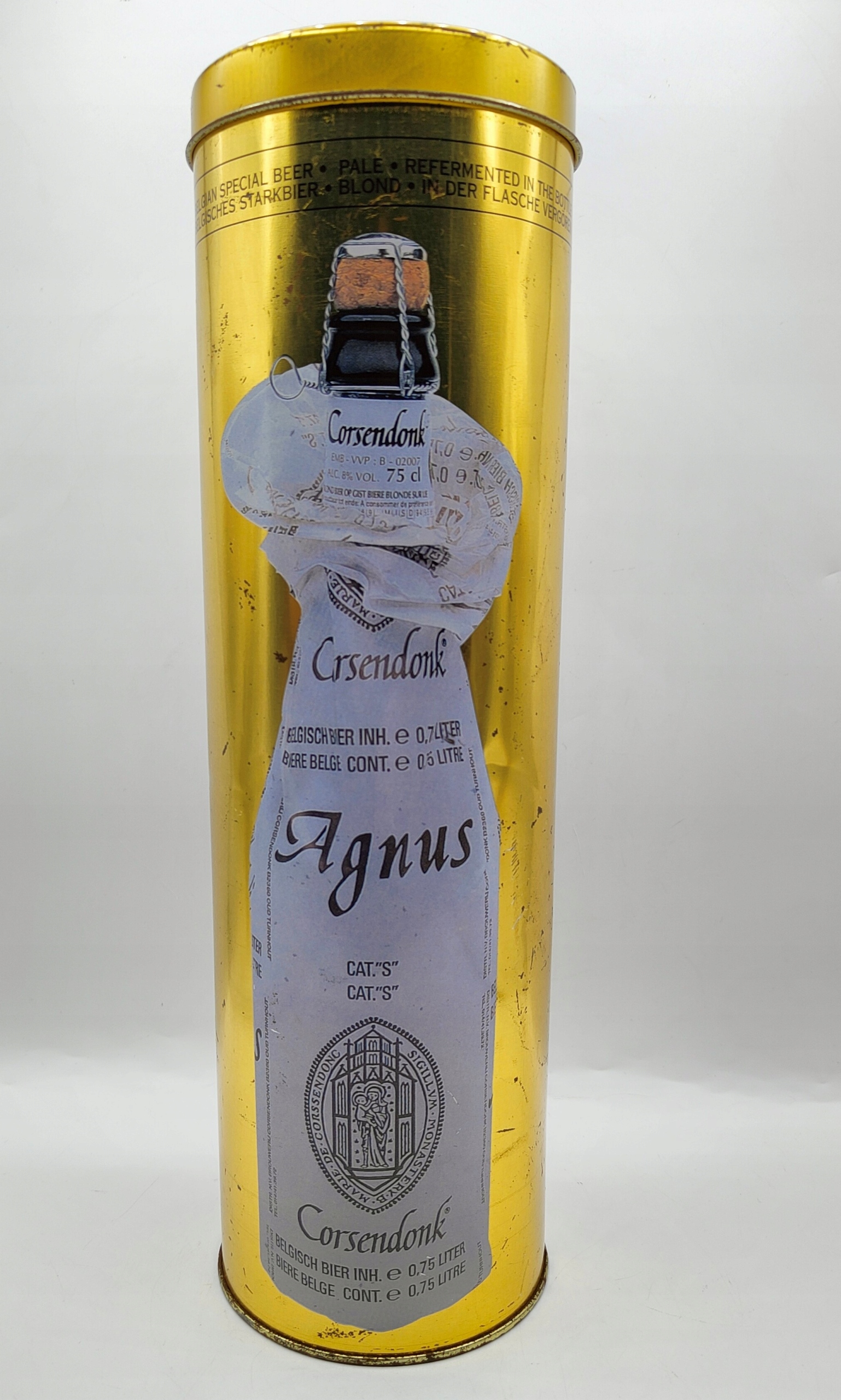 Контейнер для СТАРОГО ПИВА Коробка AGNUS Corsendonk, БОЛЬШАЯ банка из-под пива, 33 см.