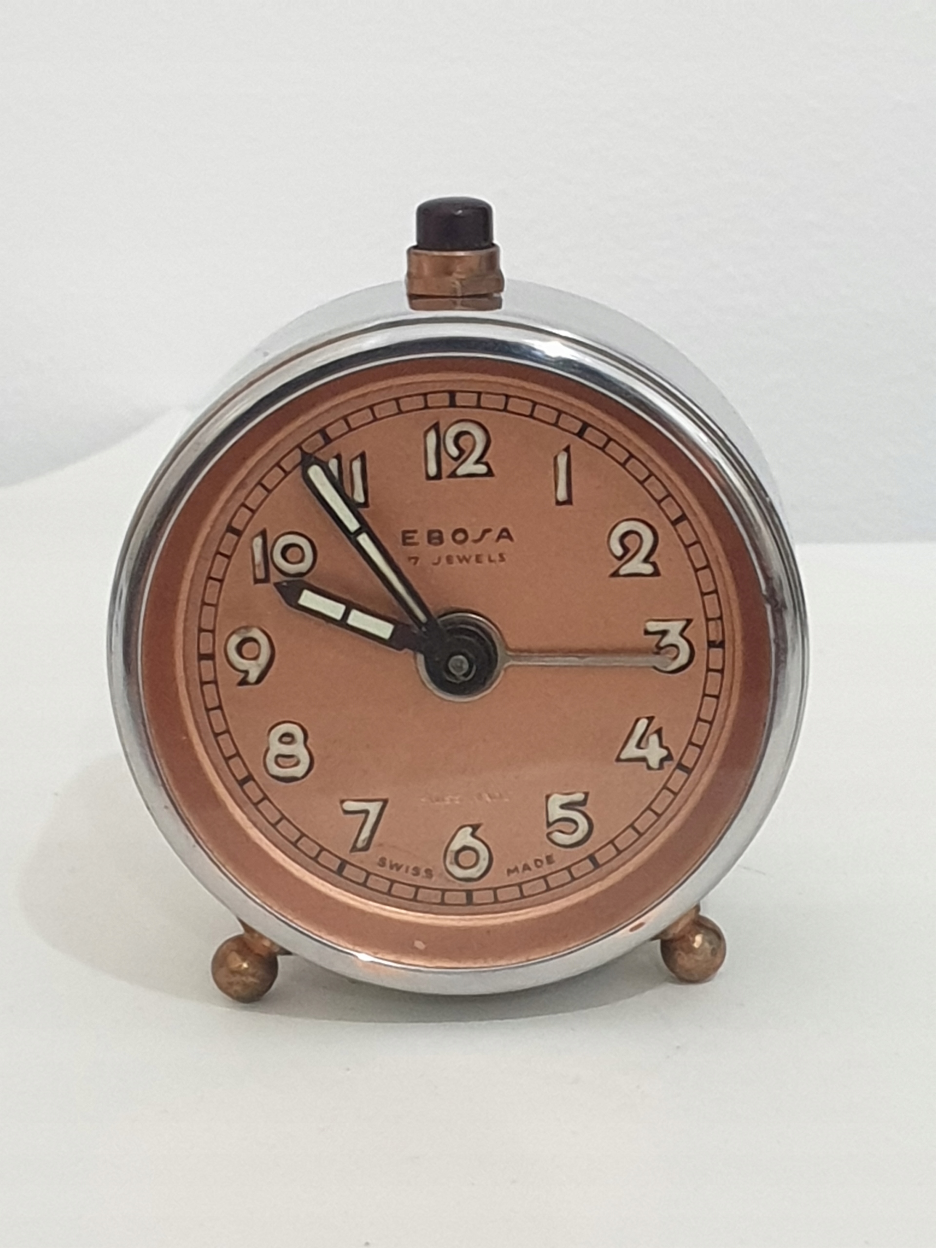 Stary Szwajcarski budzik miniatura Ebosa 1954r