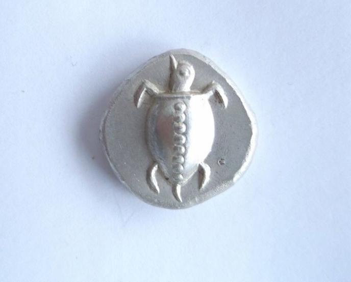 КОПИЯ архаической монеты .Эгинский статер в древнейшей архаичной разновидности. Оригиналы, вероятно, были отчеканены около 550–456 гг. до н.э. Вы делаете ставку на монету по фото, реплика изготовлена из высокопробного серебра 970 - 980/1000, в старинной технике, отчеканена квадратным пуансоном, на гравированной наковальне, имеет типичные для оригиналов дефекты чеканки, возникающие в результате Технология чеканки этих монет. СЕРЕБРО, вес около 12,6 грамм, диаметр около 21,5 мм. Рекомендую как дополнение к коллекции или как украшение, а также в иллюстративных целях. Указанные цены доставки действительны для отправлений внутри страны, отправлений за границу согласно прейскуранту Почты Польши.