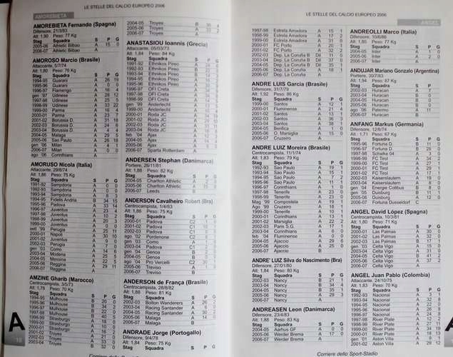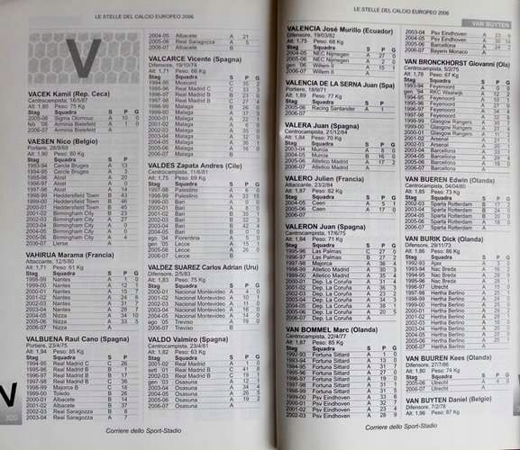 Описание: Это типичное статистическое исследование, опубликованное итальянской газетой за сезон 2006/2007 гг. «Corriere dello Sport», содержащий статистические визитные карточки всех футболистов, играющих в Серии А (Италия), Премьер-лиге (Англия), Бундеслиге (Германия), Примера Дивизион (Испания), Лиге 1 (Франция) и Эредивизи (Нидерланды). Игроки были представлены в алфавитном порядке. Были предоставлены их имена и фамилии, национальность, дата рождения, рост и вес, а также список достижений каждого сезона в клубе (матчи и голы). Среди более чем тысячи имен мы можем найти, среди прочего: Бартош Босацкий, Ежи Дудек, Яцек Кшиновек, Томаш Жонса, Томаш Кущак и Марцин Жевлаков.