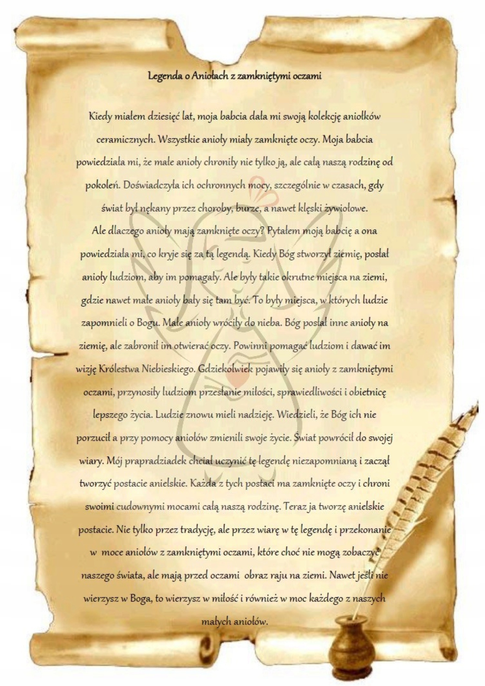 Когда мне было десять лет, бабушка подарила мне свою коллекцию керамических ангелочков. У всех ангелов были закрыты глаза. Моя бабушка рассказывала мне, что маленькие ангелочки на протяжении поколений защищали не только ее, но и всю нашу семью. Она испытала на себе их защитную силу, особенно в то время, когда мир страдали от болезней, штормов и даже стихийных бедствий. Но почему у ангелов закрыты глаза? Я спросил бабушку, и она рассказала мне, что стоит за этой легендой. Когда Бог создал землю, он послал к людям ангелов, чтобы они помогли им. Но были на земле жестокие места, где боялись оказаться даже маленькие ангелочки. Это были места, где люди забыли о Боге. Маленькие ангелочки вернулись на небеса. Бог послал на землю других ангелов, но запретил им открывать глаза. Они должны помогать людям и давать им видение Царства Небесного. Где бы ангелы ни появлялись с закрытыми глазами, они приносили людям послания любви, справедливости и обещания лучшей жизни. У людей снова появилась надежда. Они знали, что Бог не оставил их, и с помощью ангелов изменили свою жизнь. Мир вернулся к своей вере. Мой прапрадедушка захотел сделать эту легенду незабываемой и начал создавать ангельские фигурки. Каждый из этих персонажей имеет закрытые глаза и защищает всю нашу семью своей чудодейственной силой. Теперь я создаю ангельские фигурки. Не только из-за традиции, но и из-за веры в эту легенду и веры в силы ангелов с закрытыми глазами, которые хоть и не могут видеть наш мир, но все же имеют в глазах образ рая на земле. Даже если ты не веришь в Бога, ты веришь в любовь, а также в силу каждого из наших маленьких ангелочков.