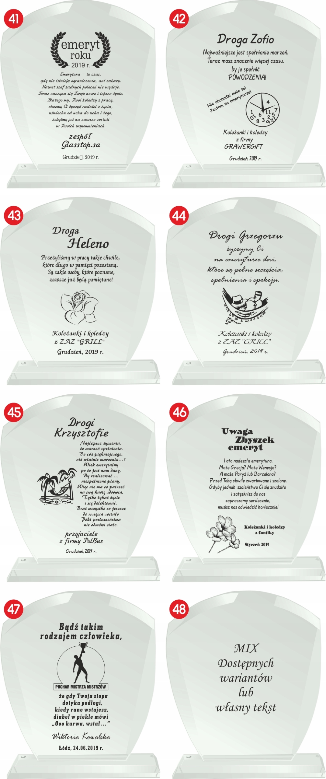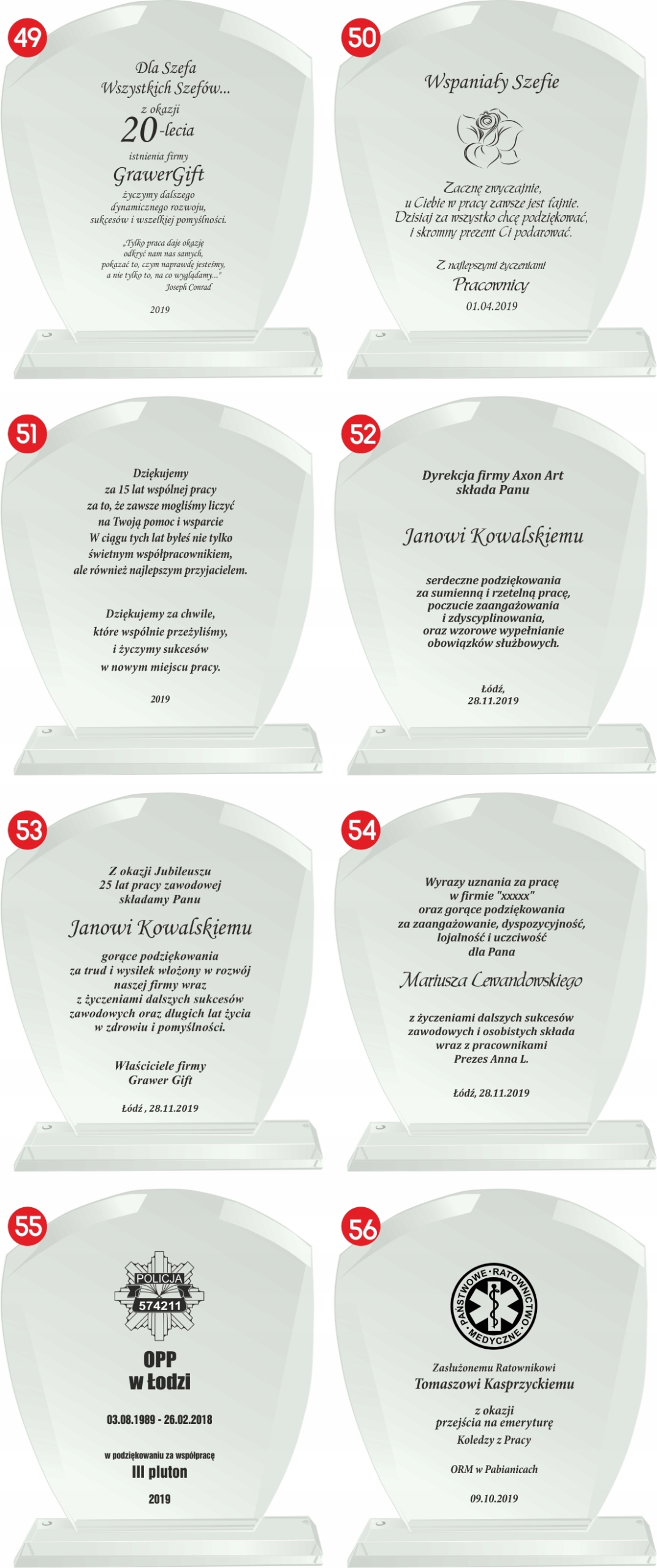Красиво, Glass спасибо, выполняется с помощью лазерной технологии гравюры, непосредственно на объекте. Статуэтка стекла отлично смотрится благодаря уникальной форме. Благодаря сокращению, он получает незабываемые эстетические впечатления. Статуэтка встроена на твердую основу того же материала, который постоянно подключен. Гравюра производится на высококачественном лазерном платтере. Это означает, что гравюра даже на нескольких приобретенных продуктах ничем не отличается. Кроме того, он вручную и очень тщательно заполнен мастером с особой краской. золотая или серебряная краска дает удивительный эффект . Вы не найдете такого высокого качества нигде. Человек, который получает подарок, сделанный в таком высоком качестве, определенно будет в восторге, и вы будете гордиться тем, что можете его дать.