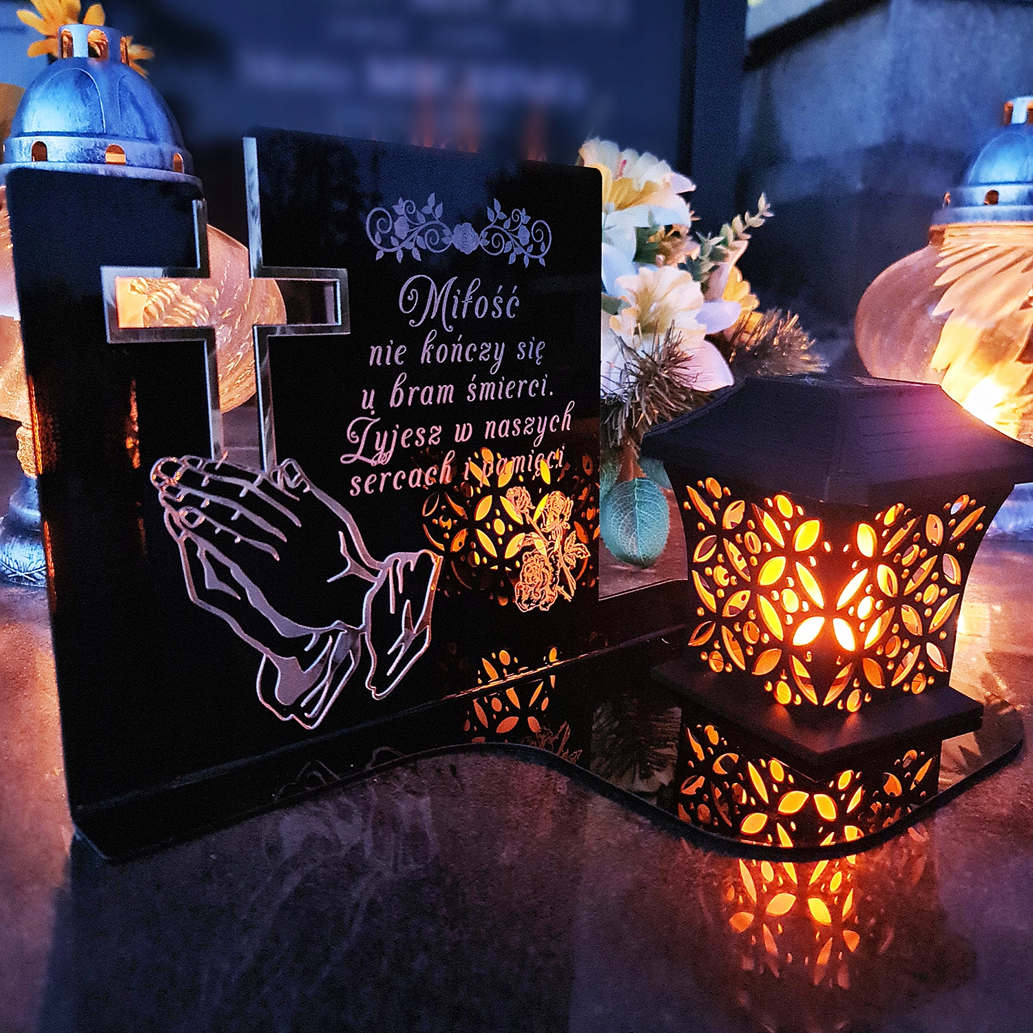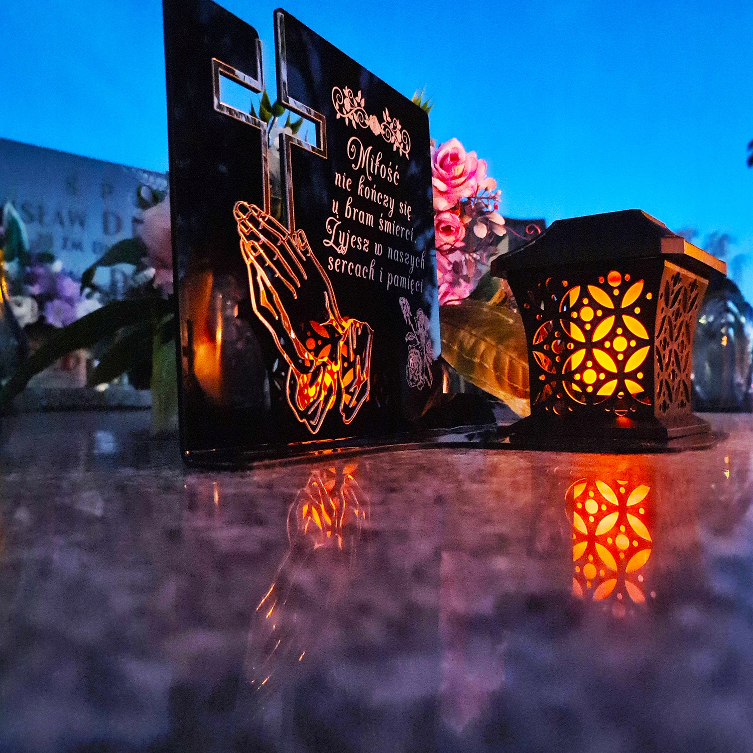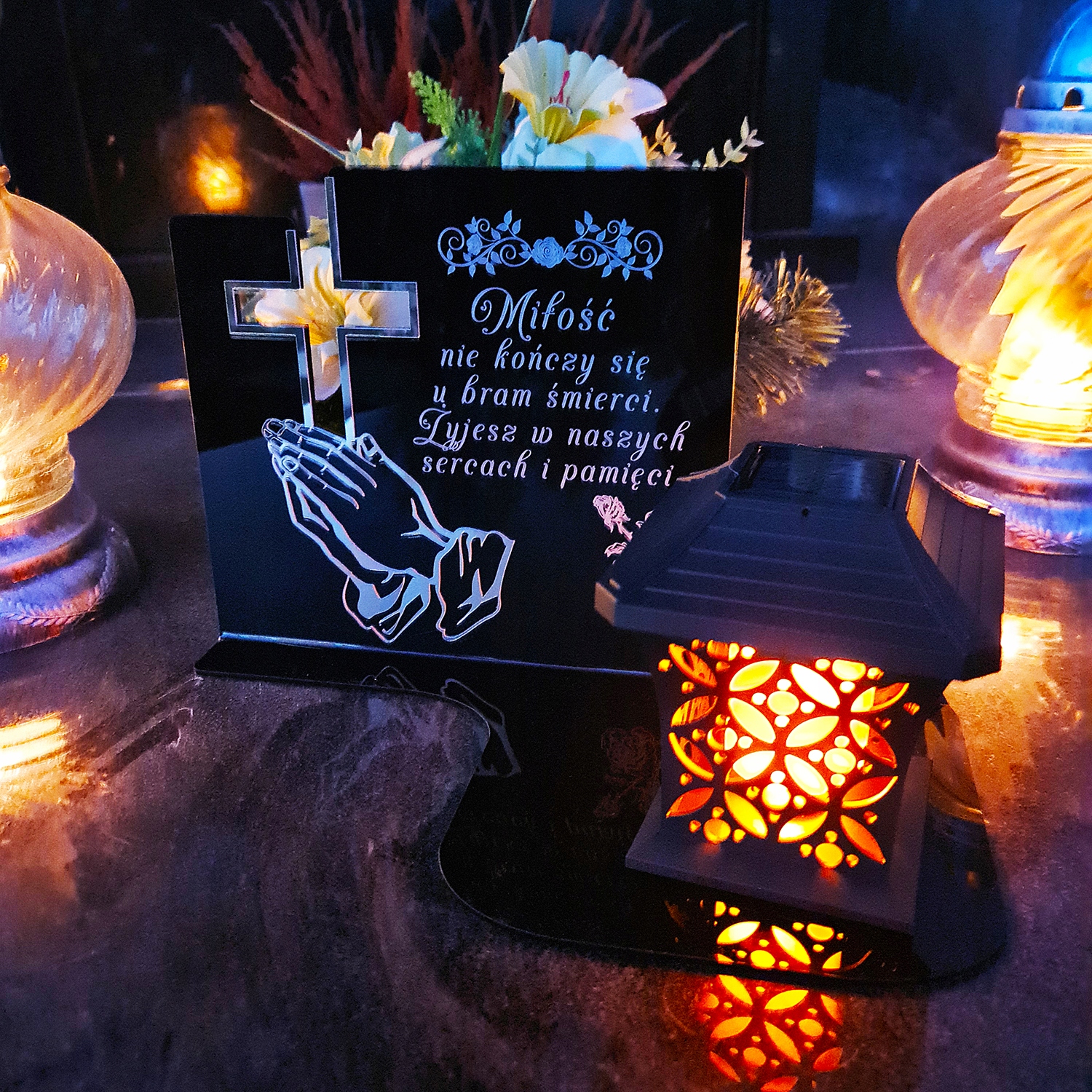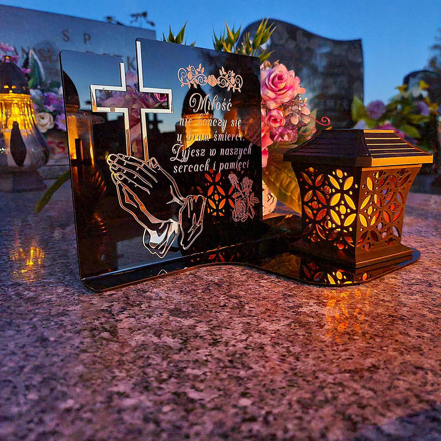 Вечная солнечная свеча для гробницы с гравированной акриловой стеклянной стойкой, украшенной золотистым мотивом