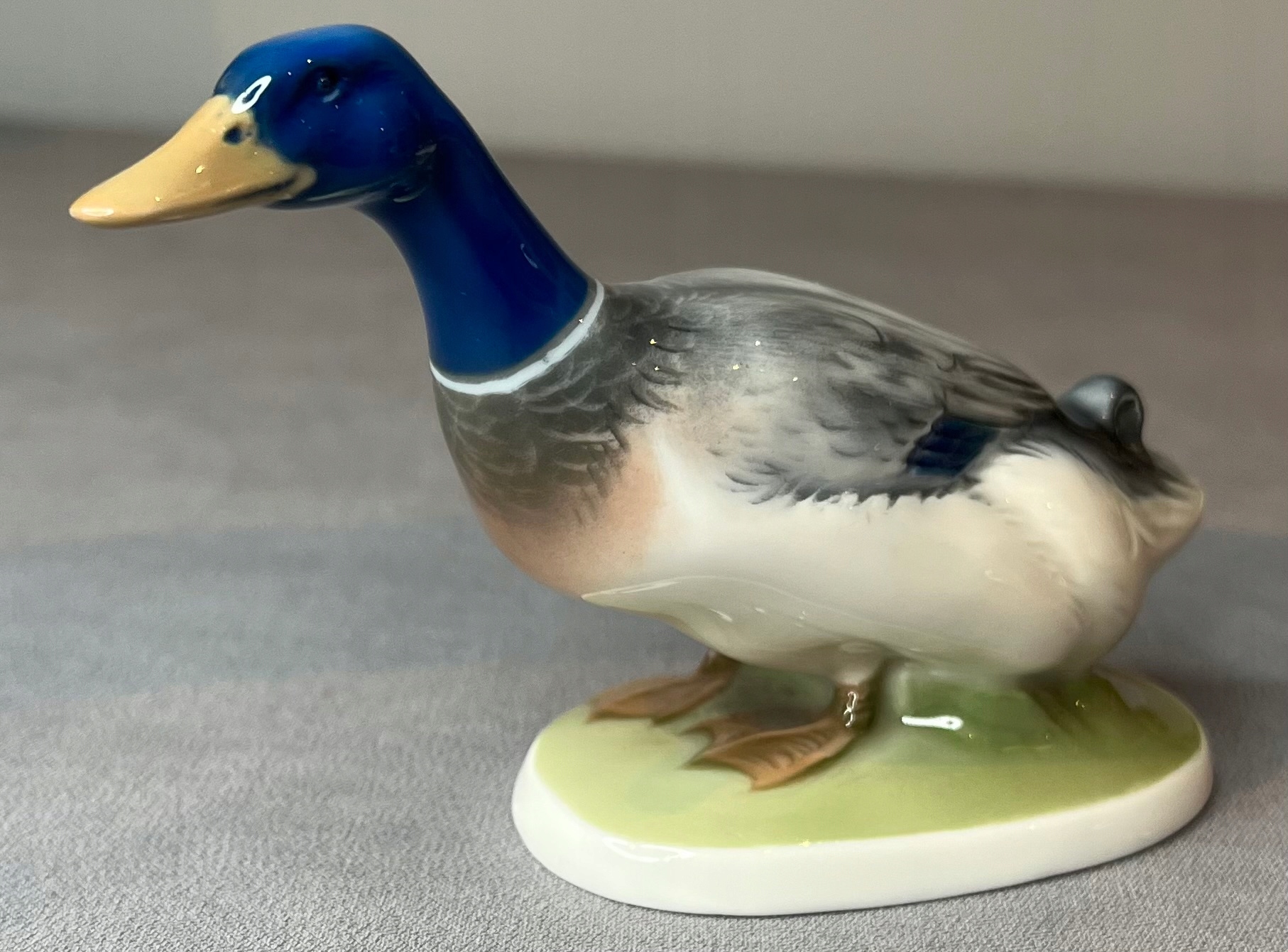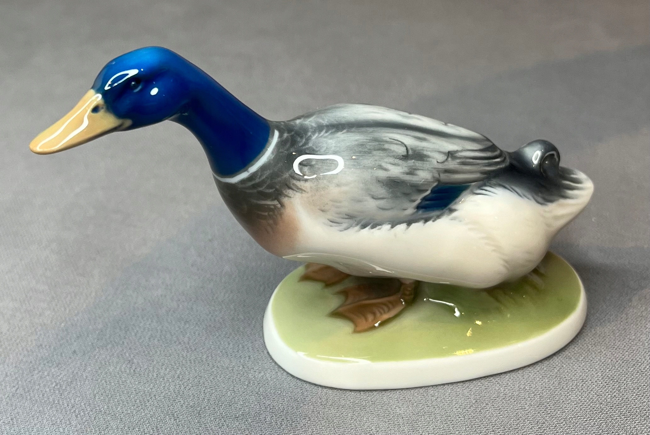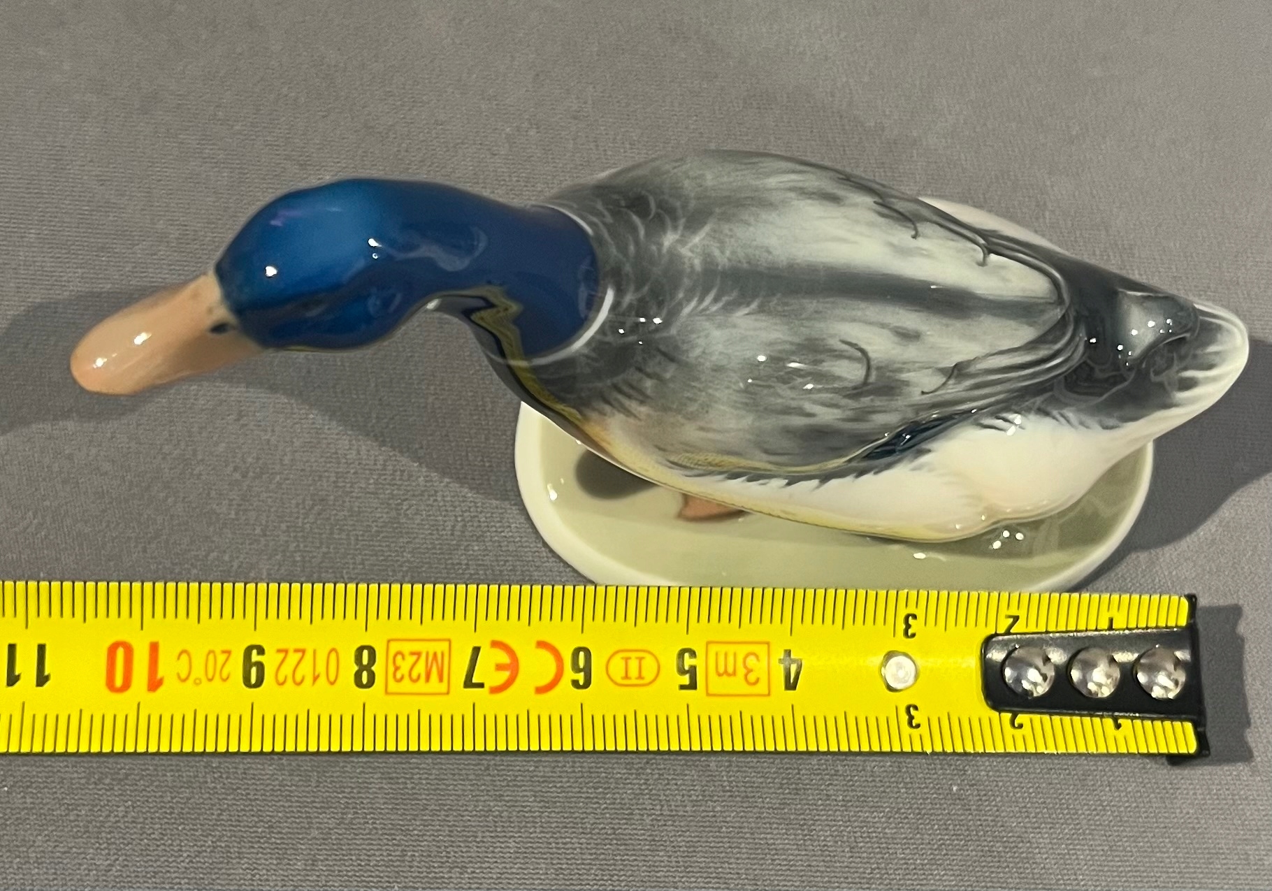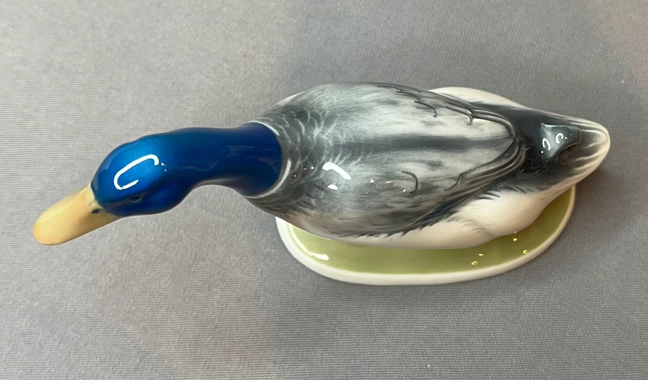 Эта красивая фарфоровая фигурка утки была изготовлена Карлом Химмельстосом, немецким художником, известным своими изысканными фигурками. Внимание к деталям и мастерство видны в каждом изгибе и перышке этого изделия. Сделанная в Германии статуэтка является настоящим произведением искусства и востребованным предметом коллекционирования. Подписано именем дизайнера (фото).