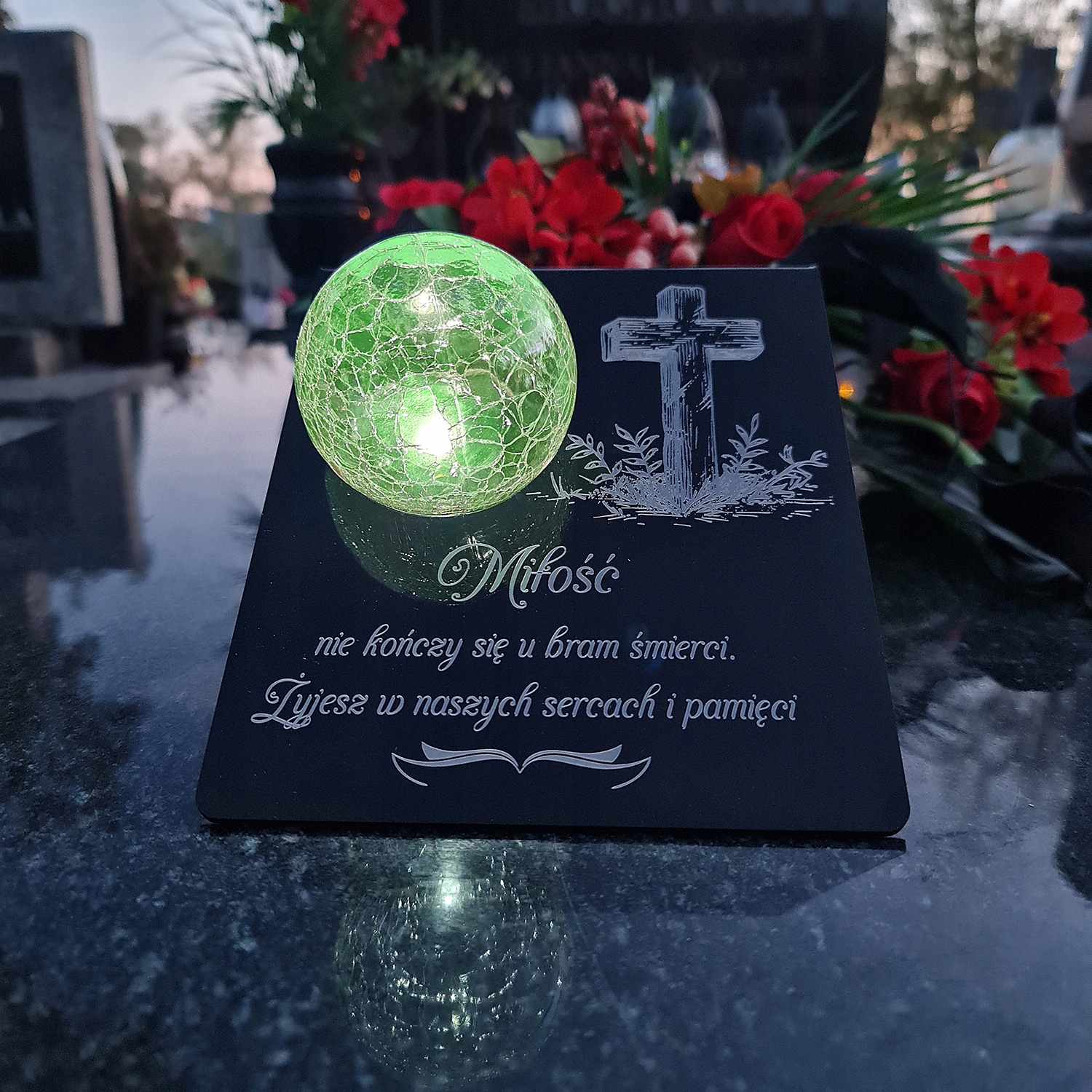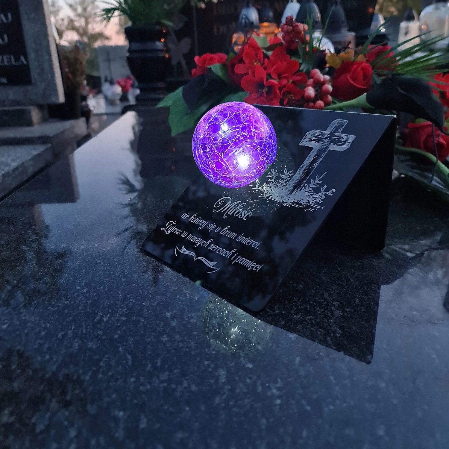 Элегантная светодиодная могильная свеча на солнечной энергии, светящаяся в двух режимах: белом и цветном RGB, с основанием из акрилового стекла с гравировкой.