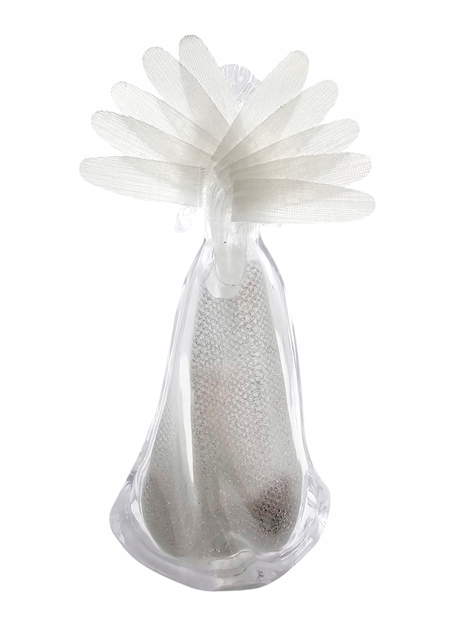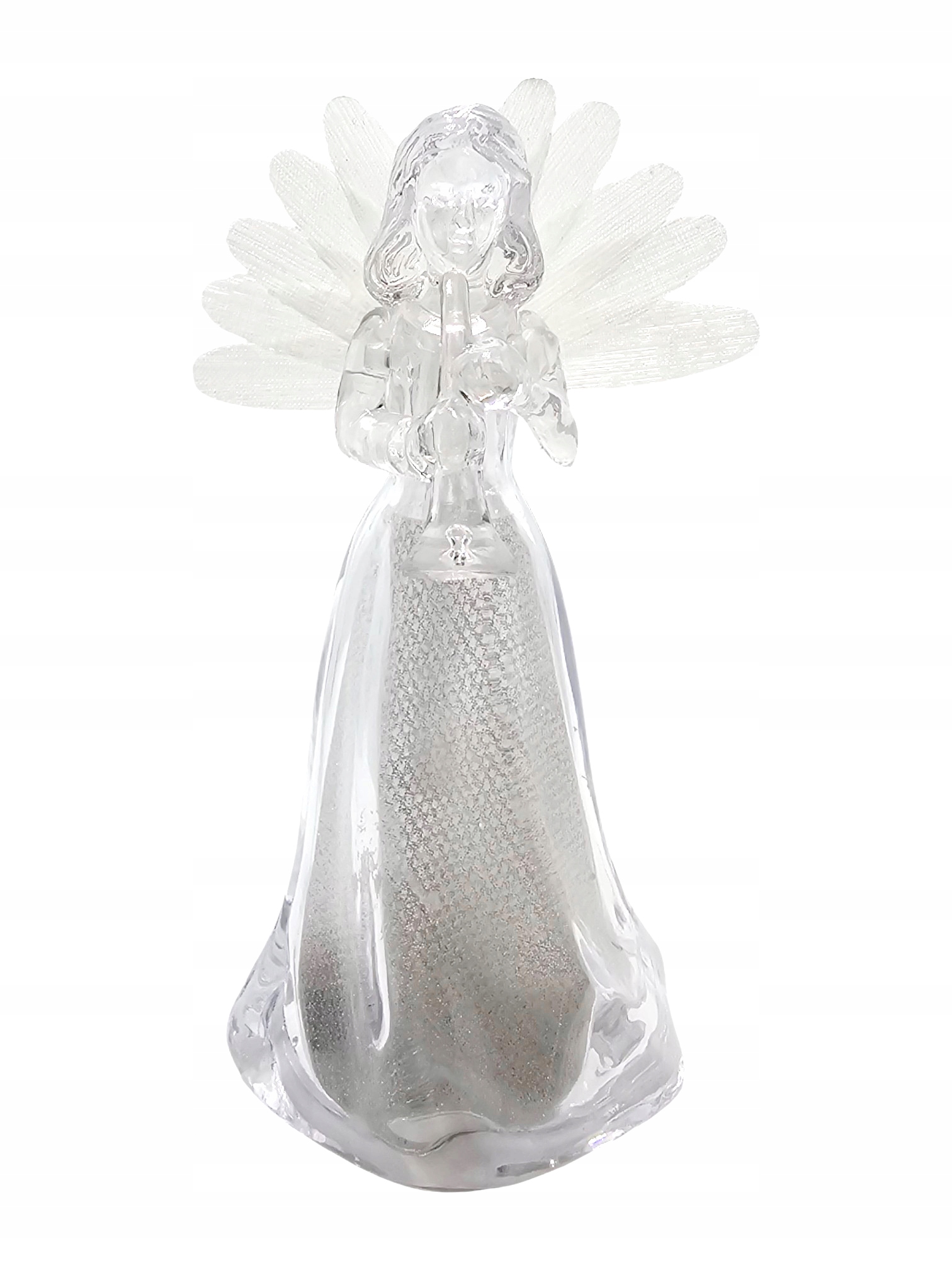 Ангел имеет высоту 10,5 см и ширину 6,5 см, что делает его идеальным для размещения на подоконнике, полке или письменном столе. Фигурка изготовлена из прозрачного пластика, поэтому в выключенном состоянии она выглядит как изящная стеклянная скульптура.