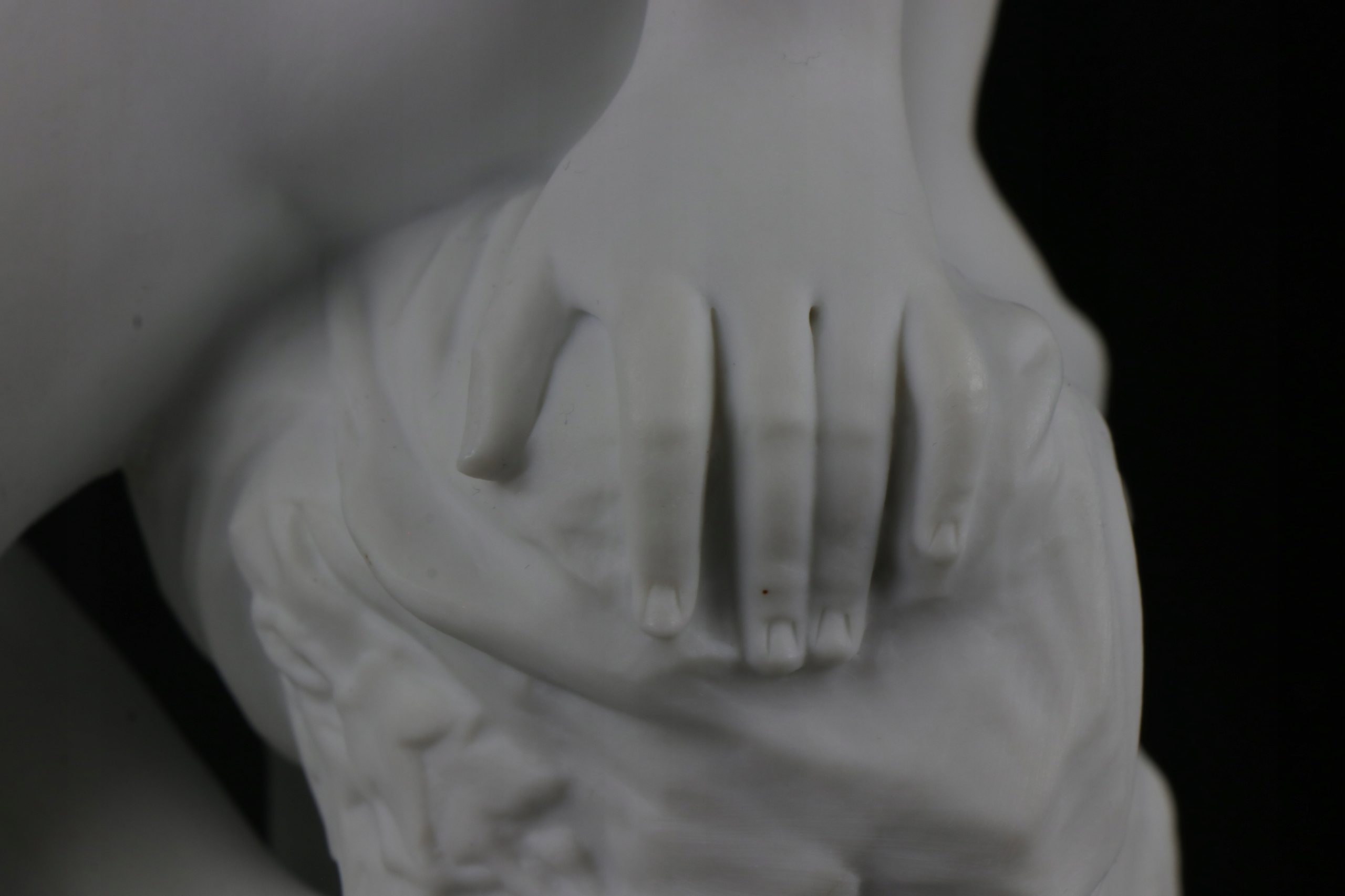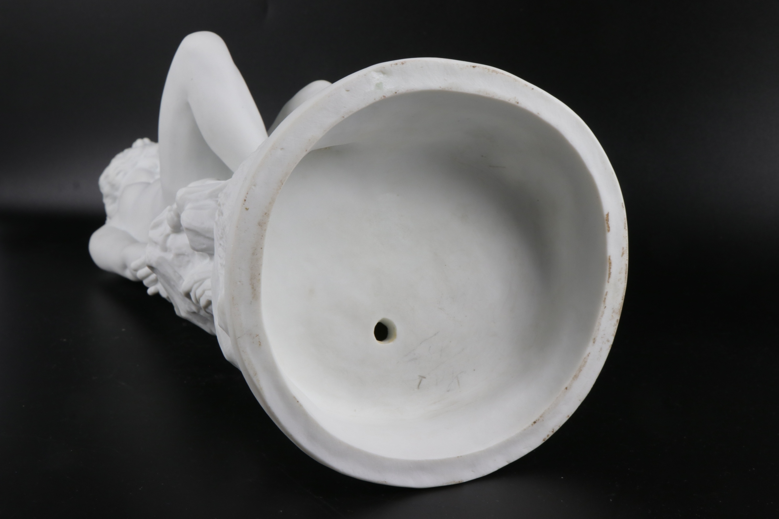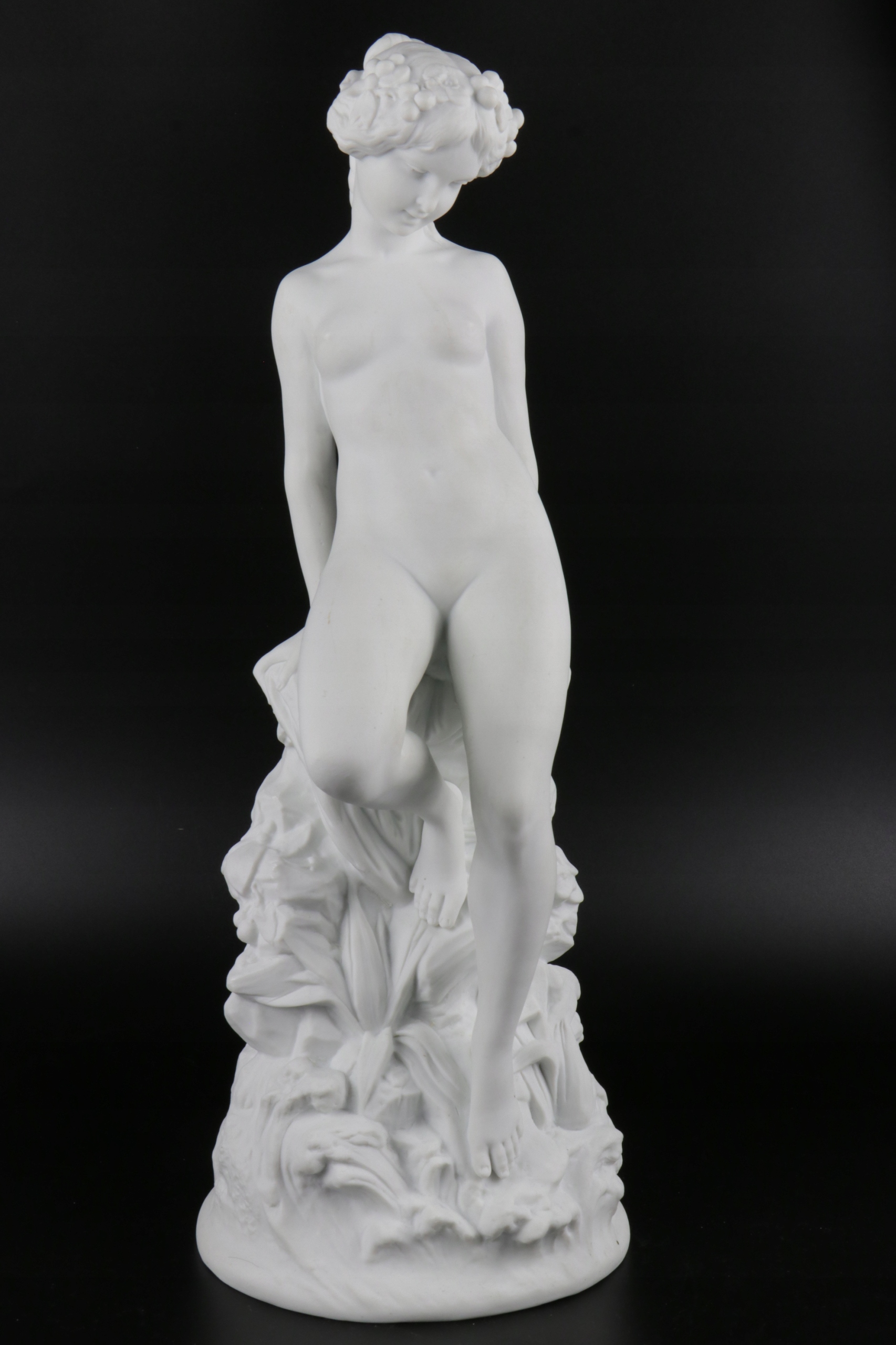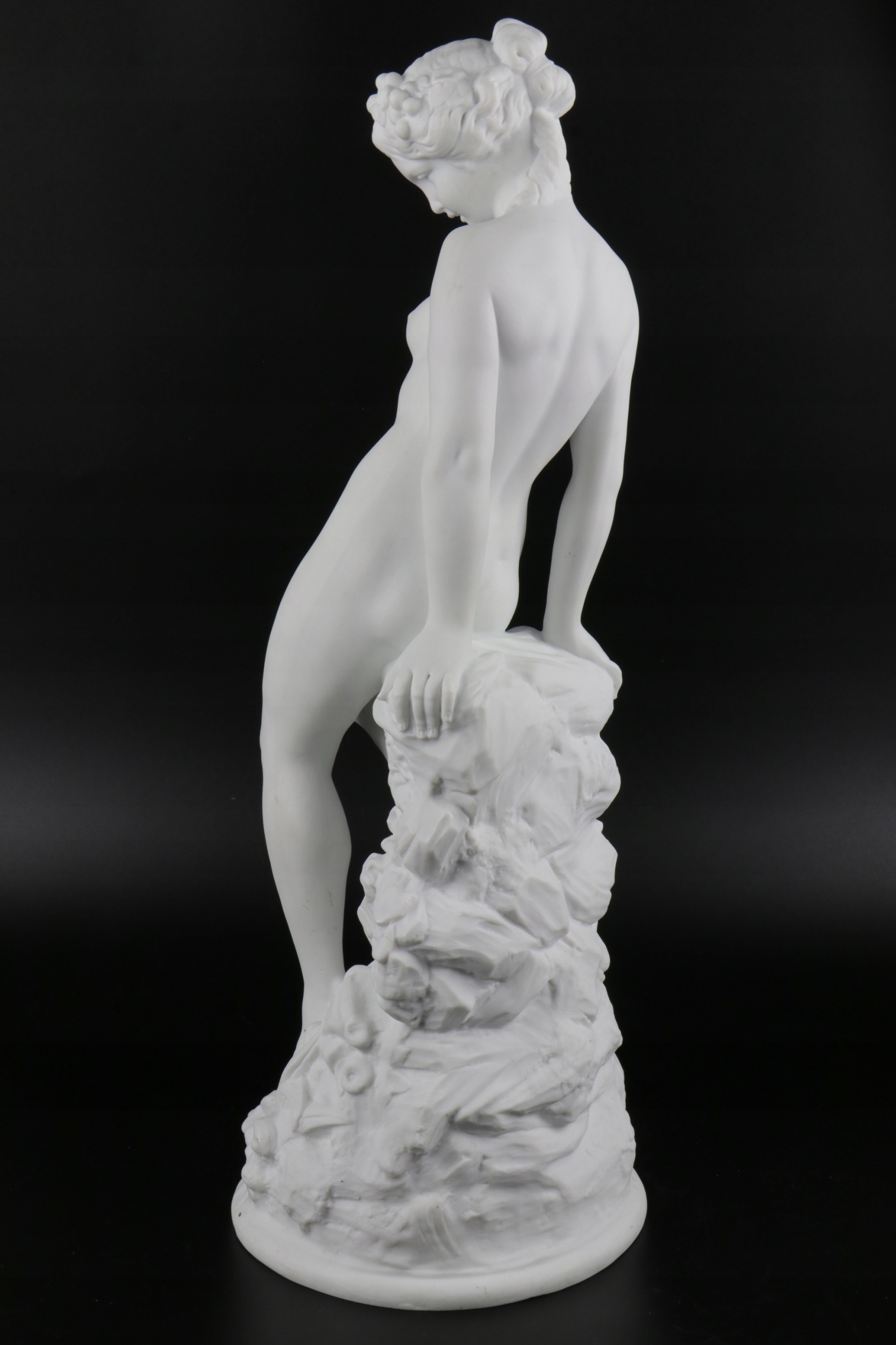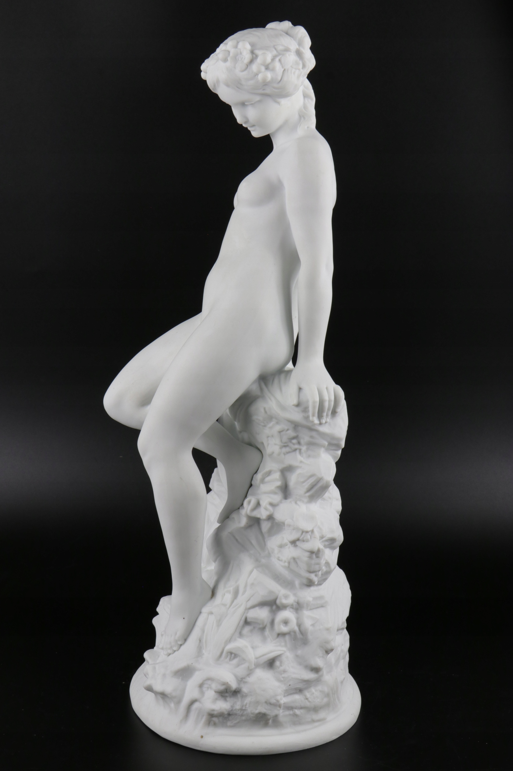 Бисквитная фигура обнаженной молодой женщины, прислонившейся к стилизованному склону. Фарфор очень хорошо и точно смоделирован, внизу подпись T