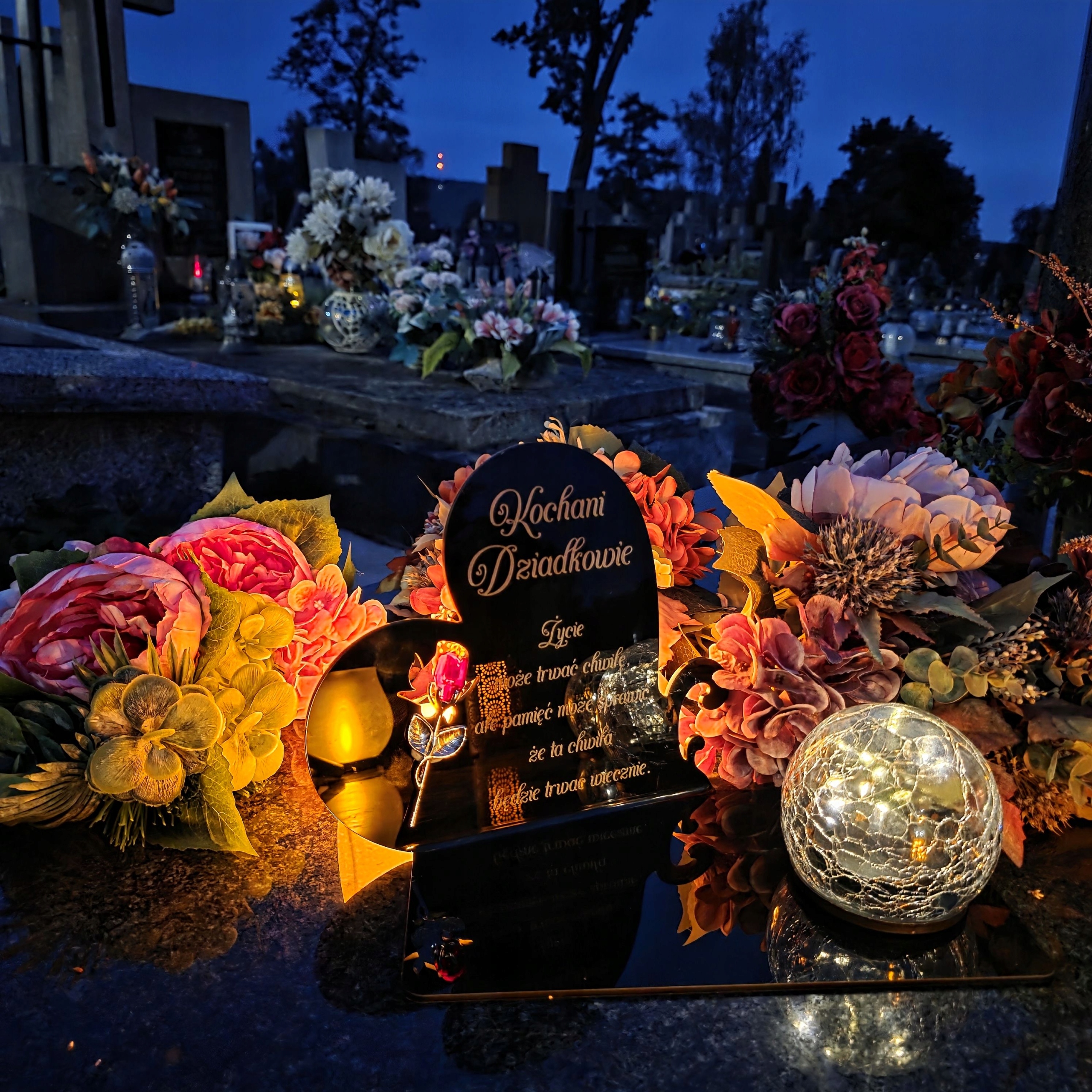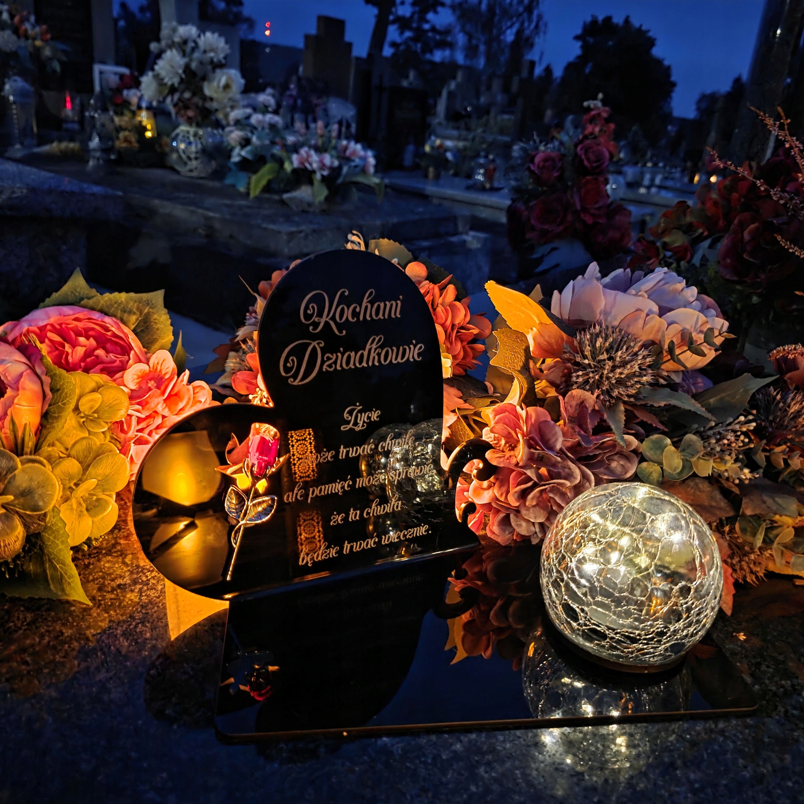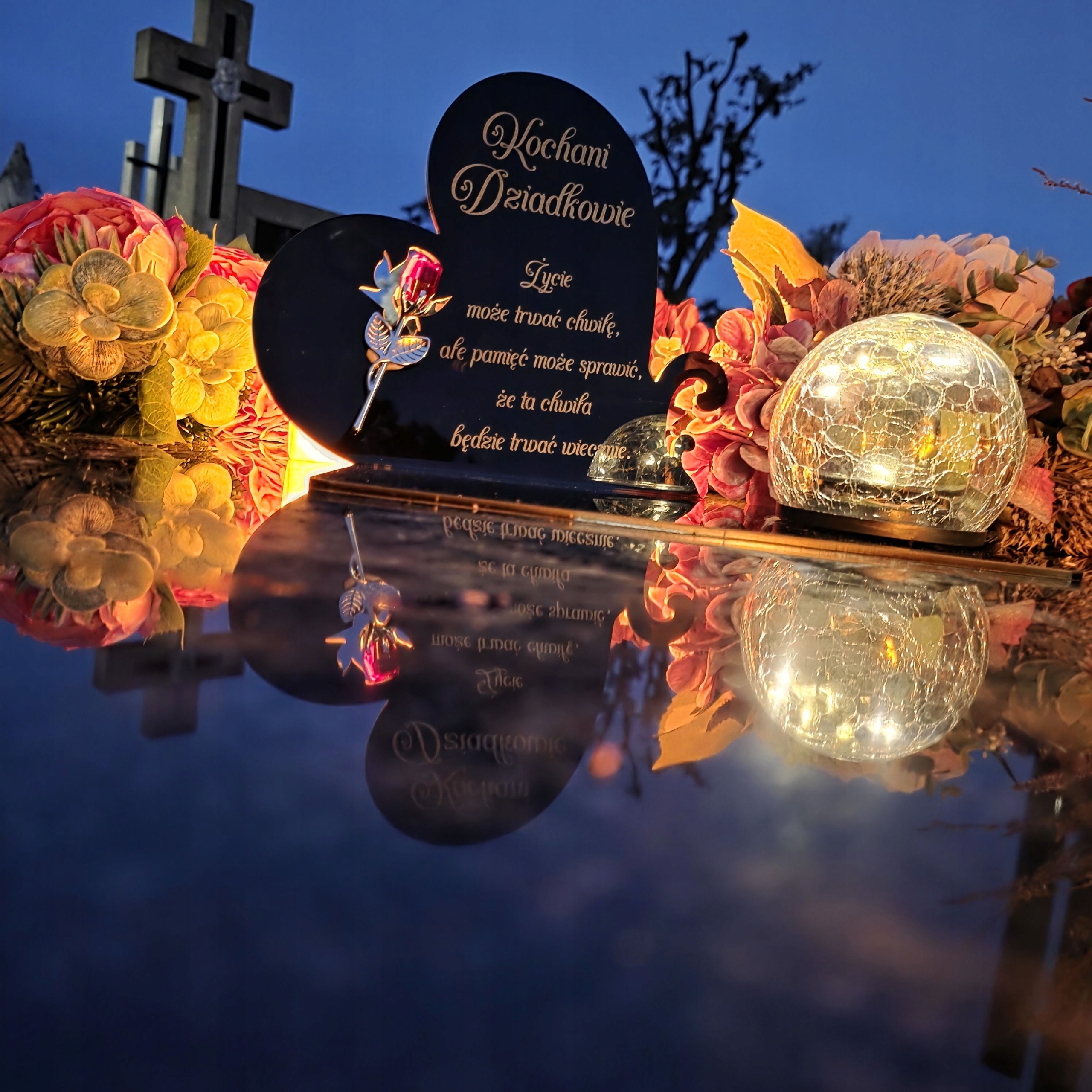 - Все это дополняет современная солнечная лампа LED, которая автоматически освещает Памятник с теплым свечением после наступления темноты, создающим атмосферу размышлений и покоя.
