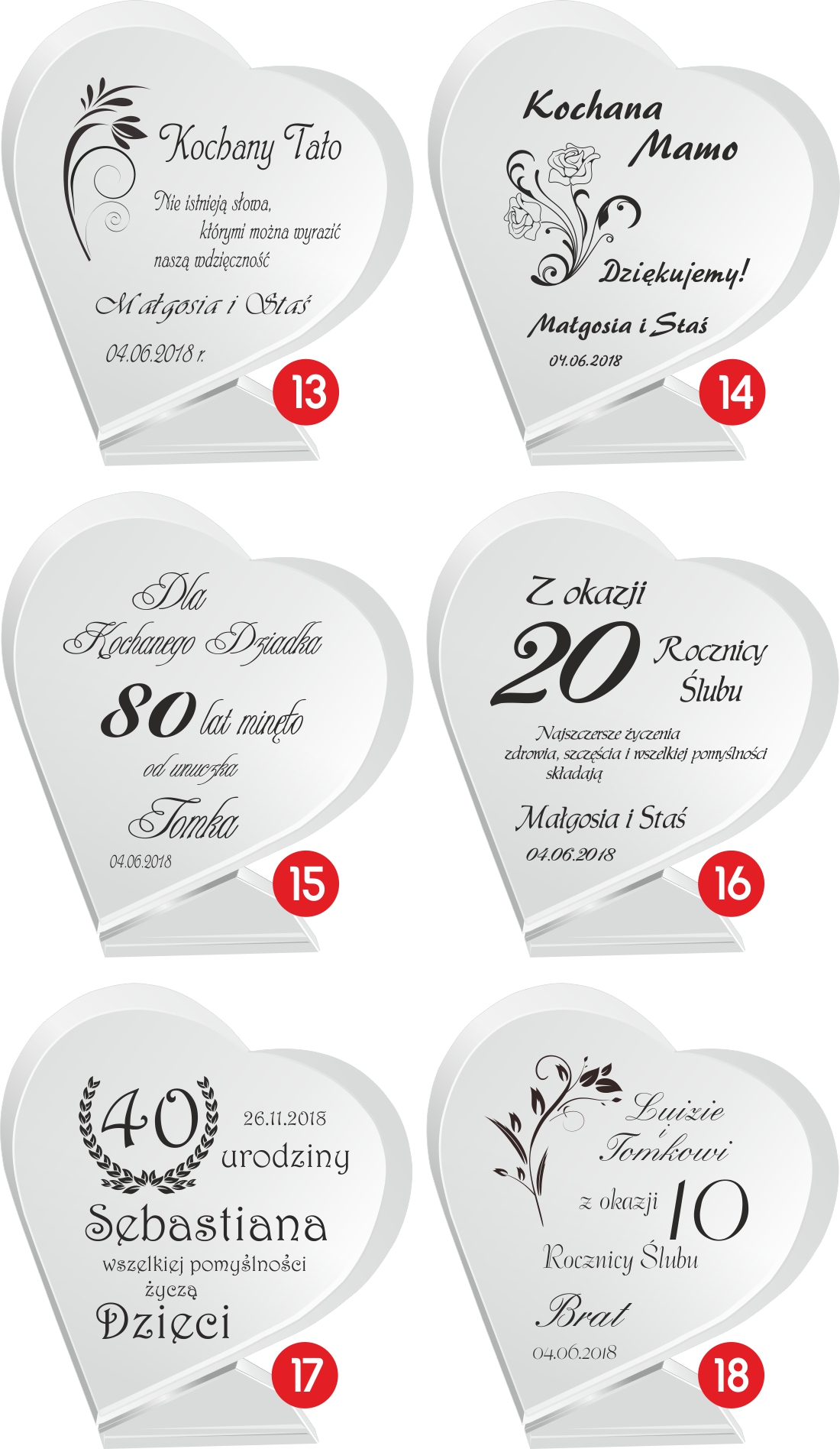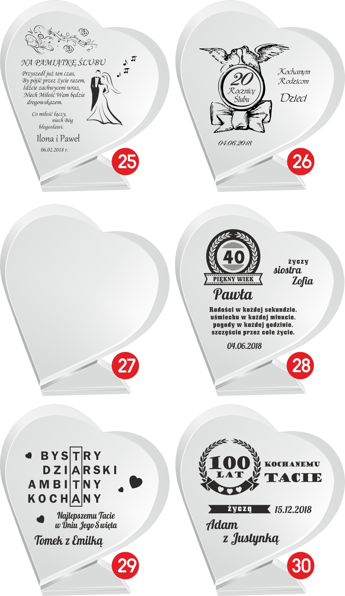 Красивое, хрустальное сердце - спасибо с технологией лазерной гравировки прямо на объекте. Хрустальная статуэтка отлично смотрится благодаря классической форме. Статуэтка встроена на твердую основу того же материала, который постоянно подключен. Гравюра производится на высококачественном лазерном платтере. Это означает, что гравюра даже на нескольких приобретенных продуктах ничем не отличается. Кроме того, он вручную и очень тщательно заполнен мастером с особой краской. золотая или серебряная краска дает удивительный эффект . Вы не найдете такого высокого качества нигде. Человек, который получает подарок, сделанный в таком высоком качестве, определенно будет в восторге, и вы будете гордиться тем, что можете его дать.