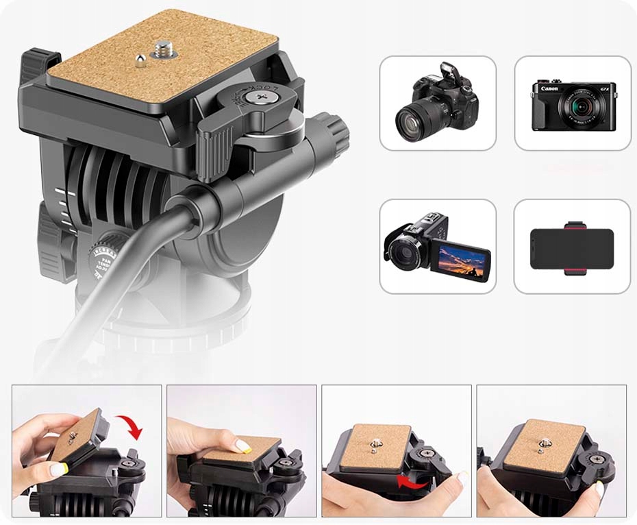 - Штатив выдерживает нагрузку до до 5 кг, что делает его пригодным для различных камер, включая зеркальные, видеокамеры и смартфоны.