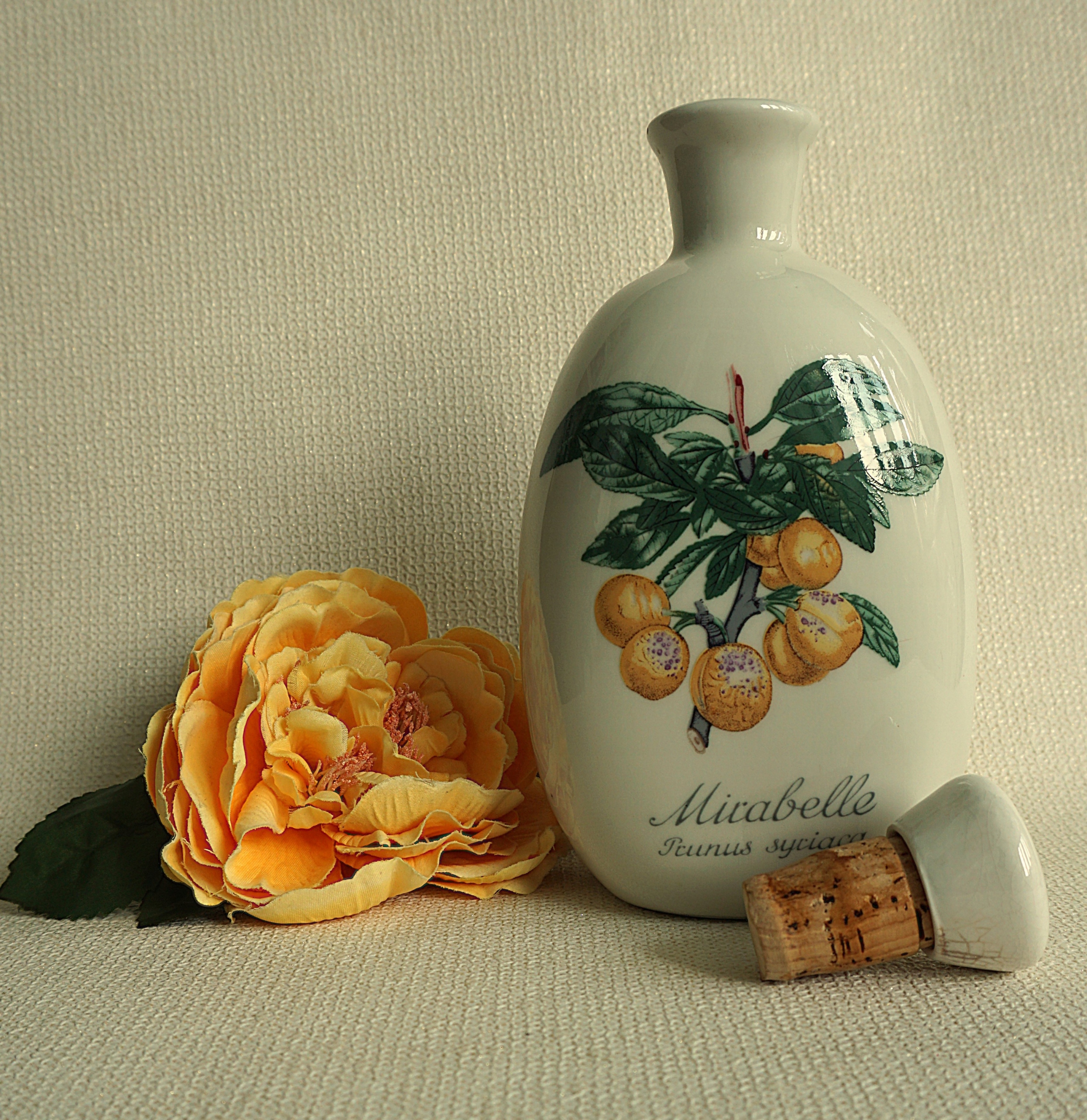 Замечательное, взаимное украшение: mirabelle - prunus syriaca - mirabelka. Караф закрыт пробкой.