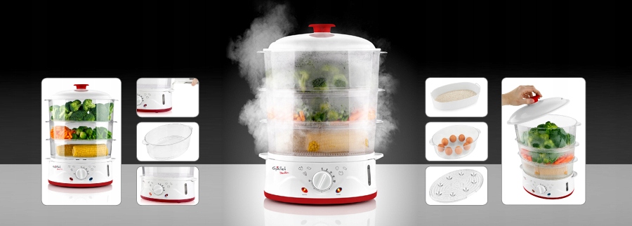 Gallet CUV 962 Паровой состоит из основной основы и трех прозрачных контейнеров с общей емкостью 8,5 л. Комплект включает в себя рисовую кулинарную миску и контейнер с яйцом. Полезный полузащитник -это шестидесятимерный таймер. Процесс нагрева и работа сигнализируются двумя управляющими лампами. Возможность добавления воды снаружи и прозрачный водяной знак, который показывает, что уровень воды также поможет вам использовать. Сила горшка составляет 900 дюймов