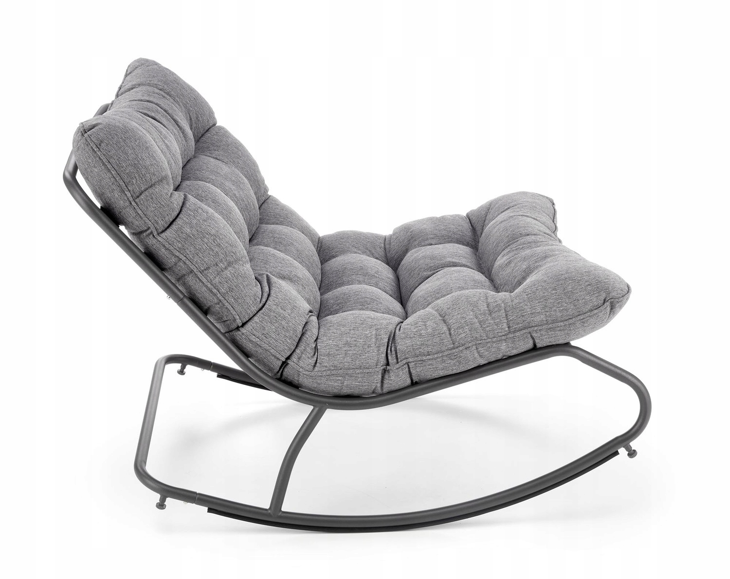Современное и удобное кресло-качалка/шезлонг для гостиной, комнаты, террасы или балкона. Металлический каркас покрыт порошковой краской черного цвета. Сиденье с черными резинками. В комплекте большая и мягкая стеганая подушка серого (пепельного) цвета.