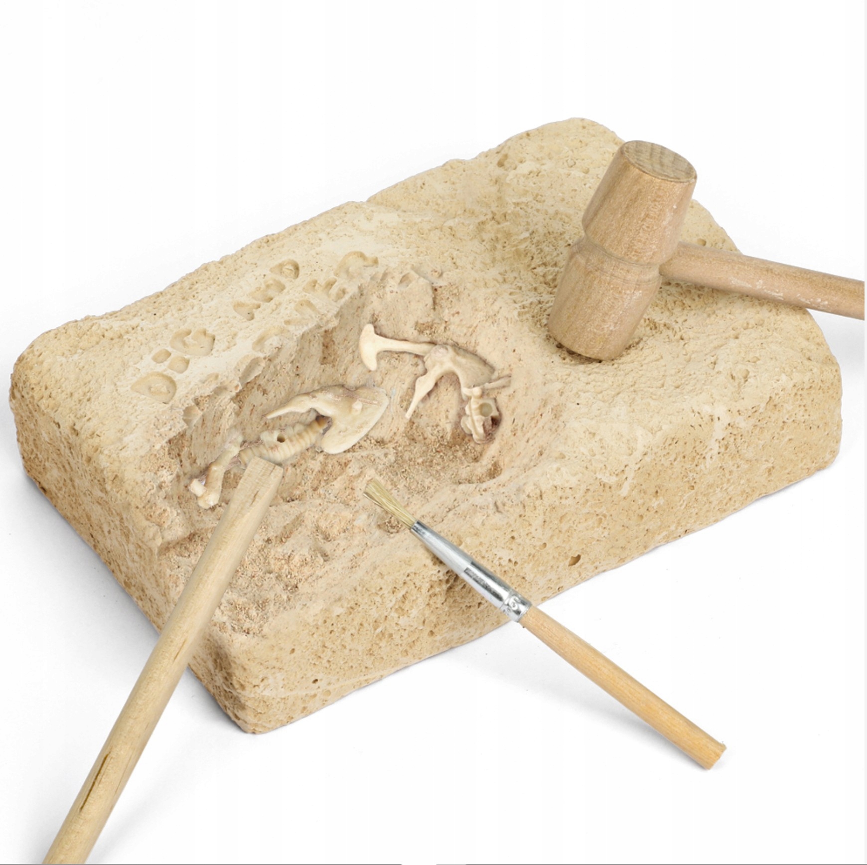 Набор содержит долото, кисть и молоток из дерева с длиной 7 см.