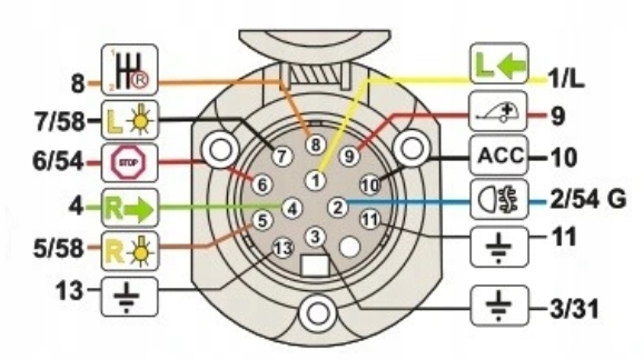 - Розетка фаркопа прицепа, 13 контактов