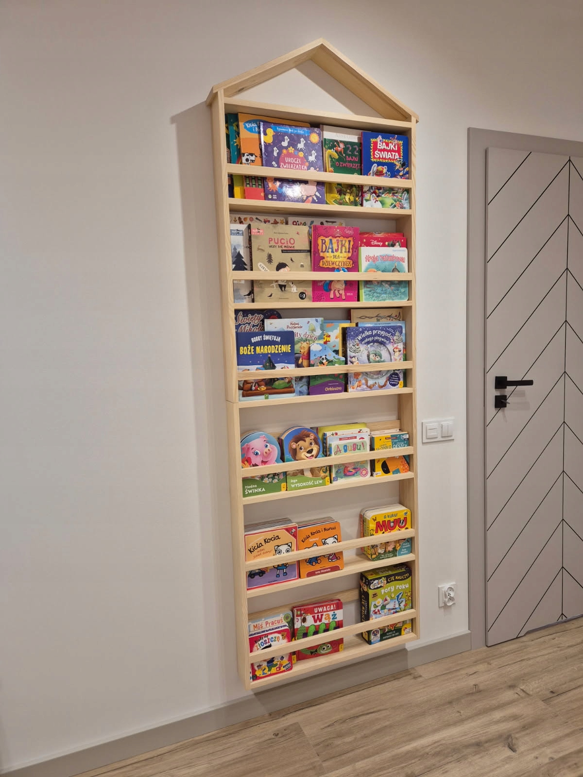 Продаю модульный подвесной книжный шкаф в форме домика. Полка изготовлена ​​вручную из массива сосны и окрашена защитным бесцветным мебельным лаком. Полка не имеет задней панели, дополнительная задняя пластина стоит 100 злотых.