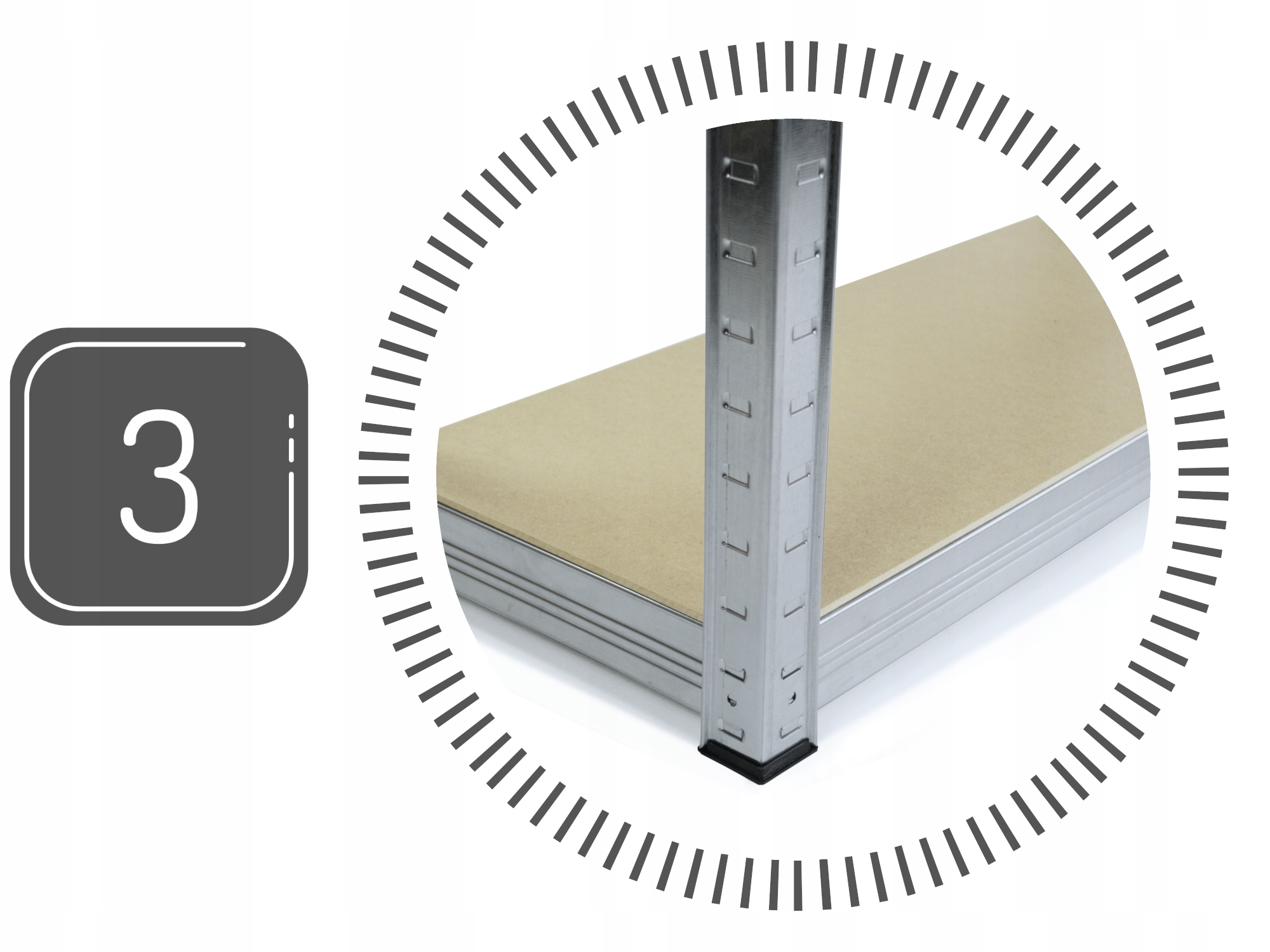 В зависимости от ваших потребностей и размеров хранимых предметов вы можете спланировать высоту каждой полки благодаря монтажным отверстиям, расположенным по всей длине профилей (на расстоянии 30 мм).