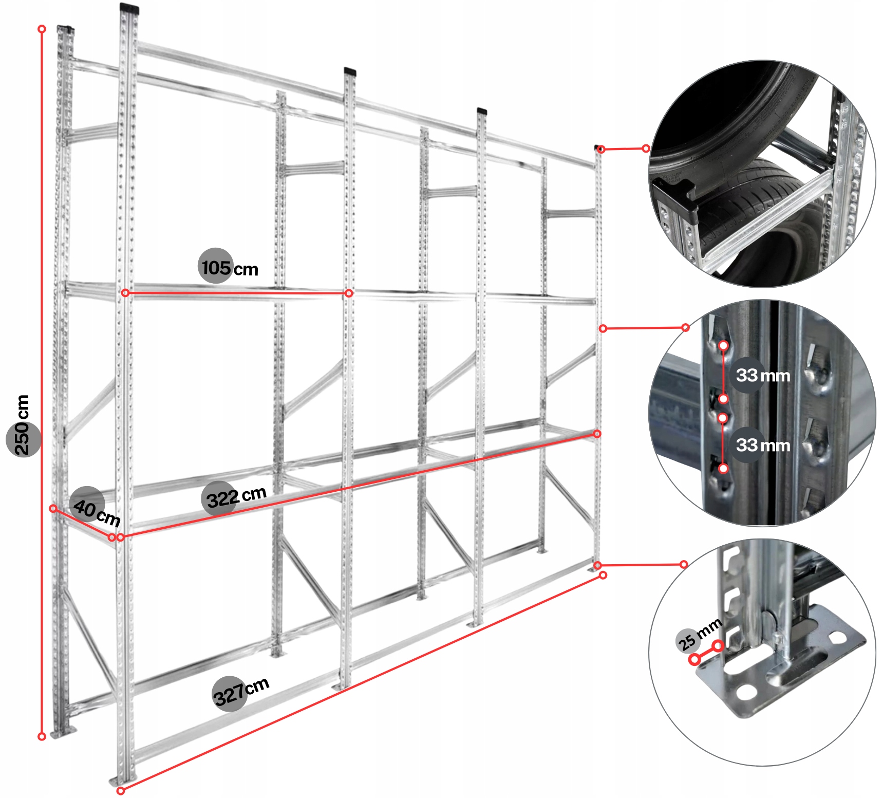 Шаг перфорации каждые 33 мм, что позволяет подогнать высоту уровней хранения под размер шин/колес, при этом максимальное расстояние между уровнями составляет 70 см.