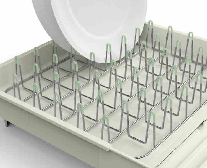 <р> Никелированные стальные стержни покрыты слоем пластика, не царапающего поверхность посуды. Вставку можно снять для облегчения очистки сушильной машины. Сушилка имеет ребра для сушки мисок или чашек, благодаря чему под посудой не остается вода. <р> Контейнер для сушки столовых приборов можно снять и разместить где угодно. <р> Нескользящие ножкиРазмеры: в сложенном виде 36,5 x 32 x 9 см