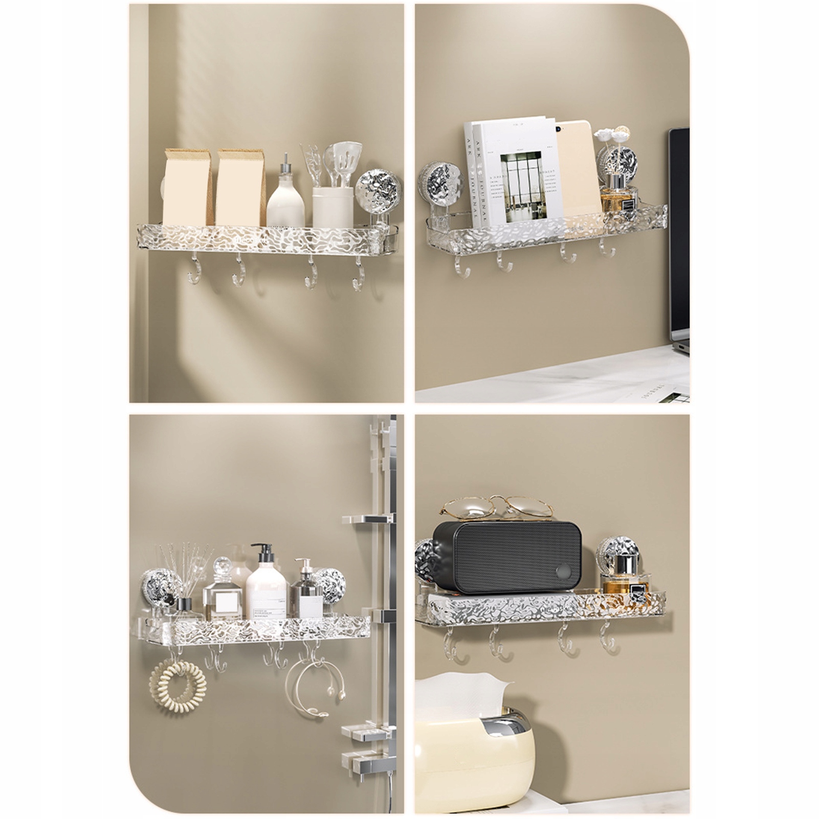 Прозрачный и практичный дизайн: Роскошная потолочная полка для хранения имеет прозрачный дизайн, который не только добавляет элегантности, но также позволяет легко видеть и получать доступ к хранящимся предметам. Прозрачная конструкция душевого органайзера с присоской обеспечивает быстрый доступ к необходимым вещам.